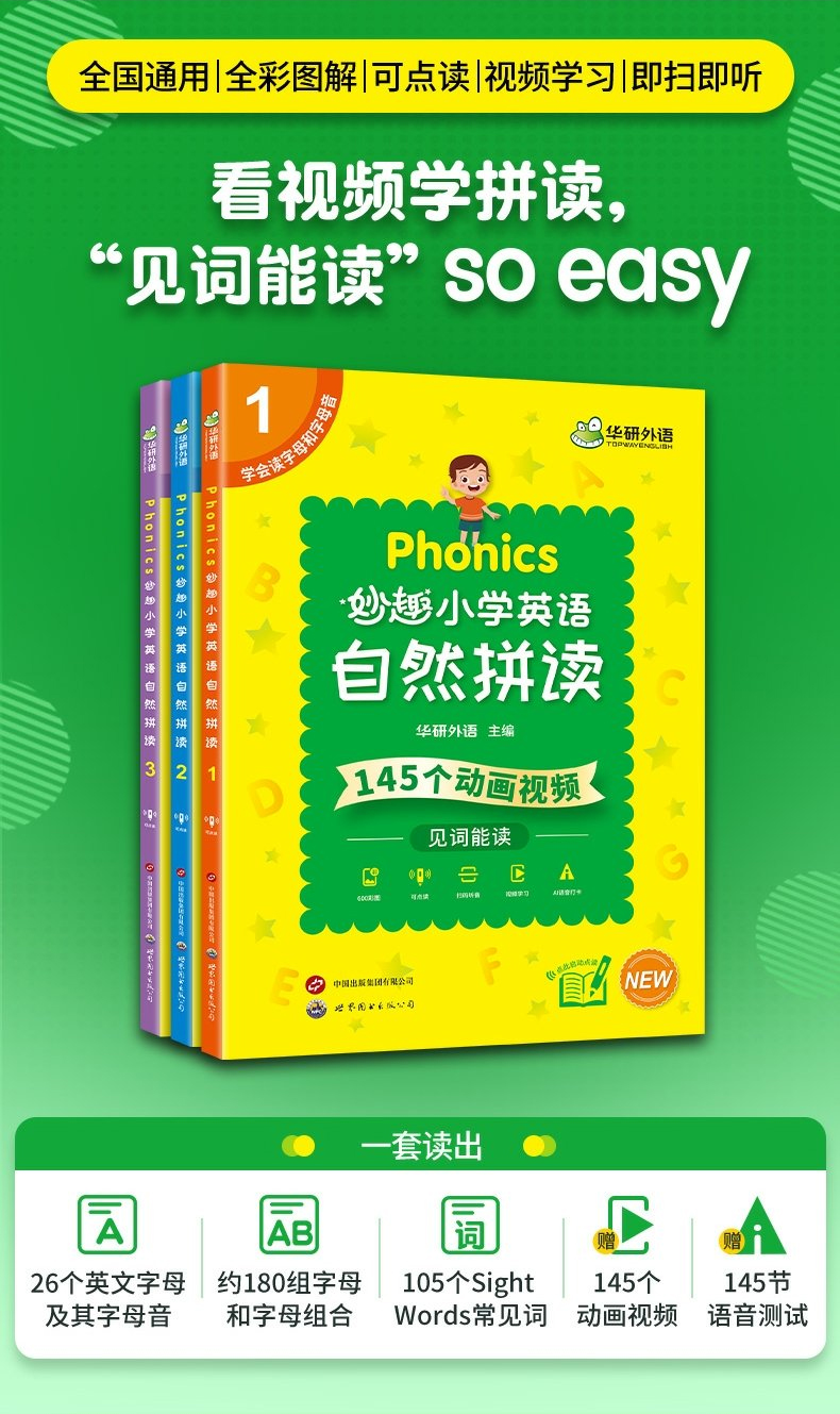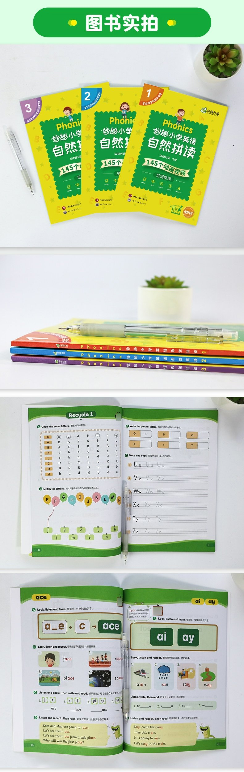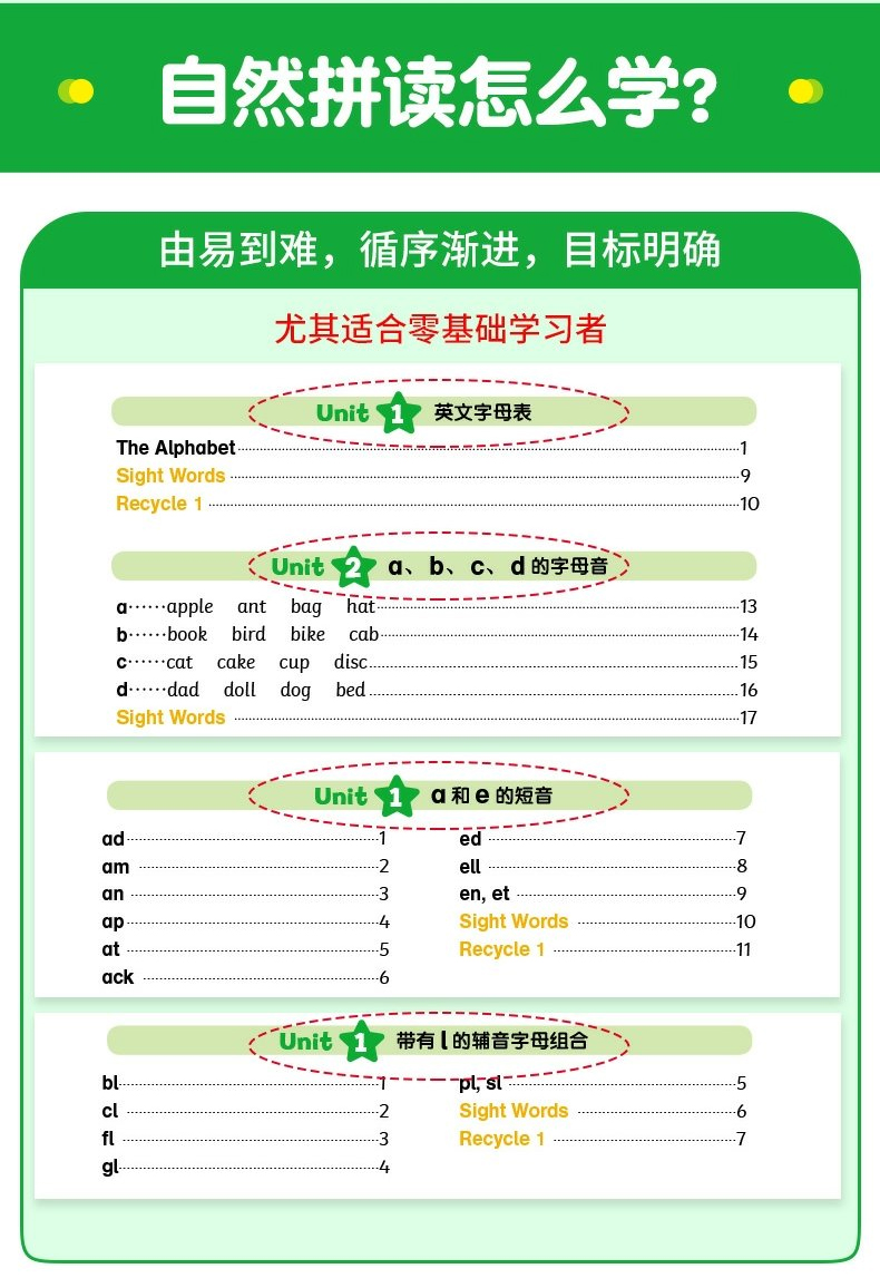 2. 由易到难,循序渐进,目标明确,循序渐进、形、义和用法学完可掌握26个英文字母及其字母音、约180组字母及字母组合和多音节词的拼读。
