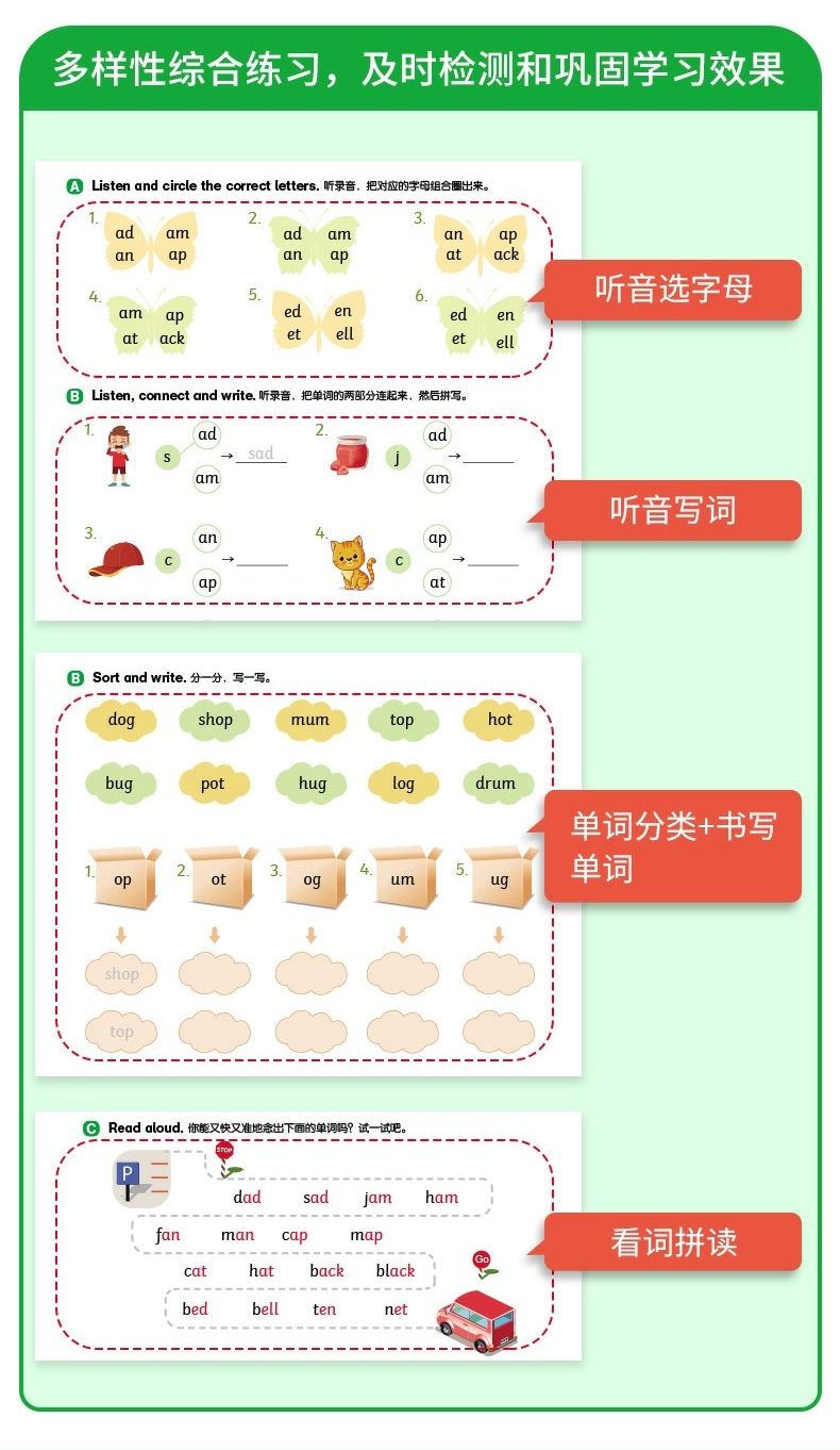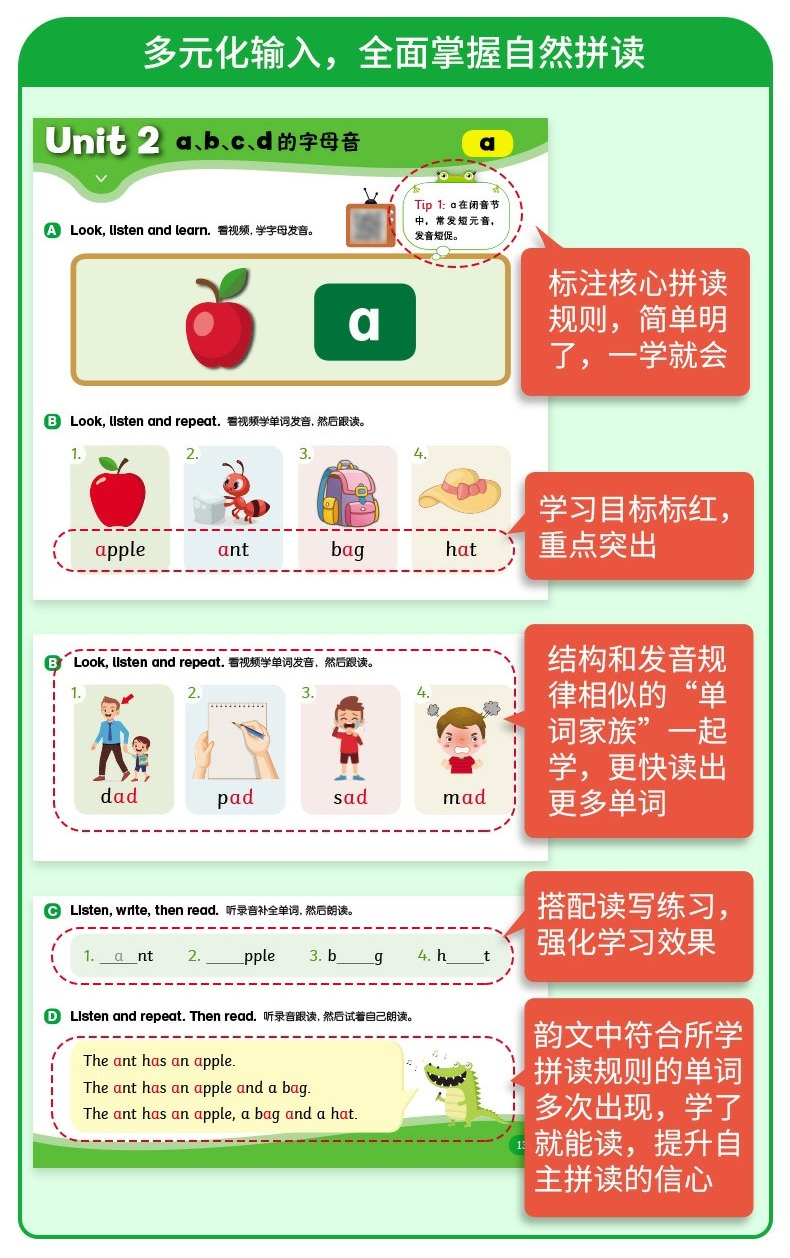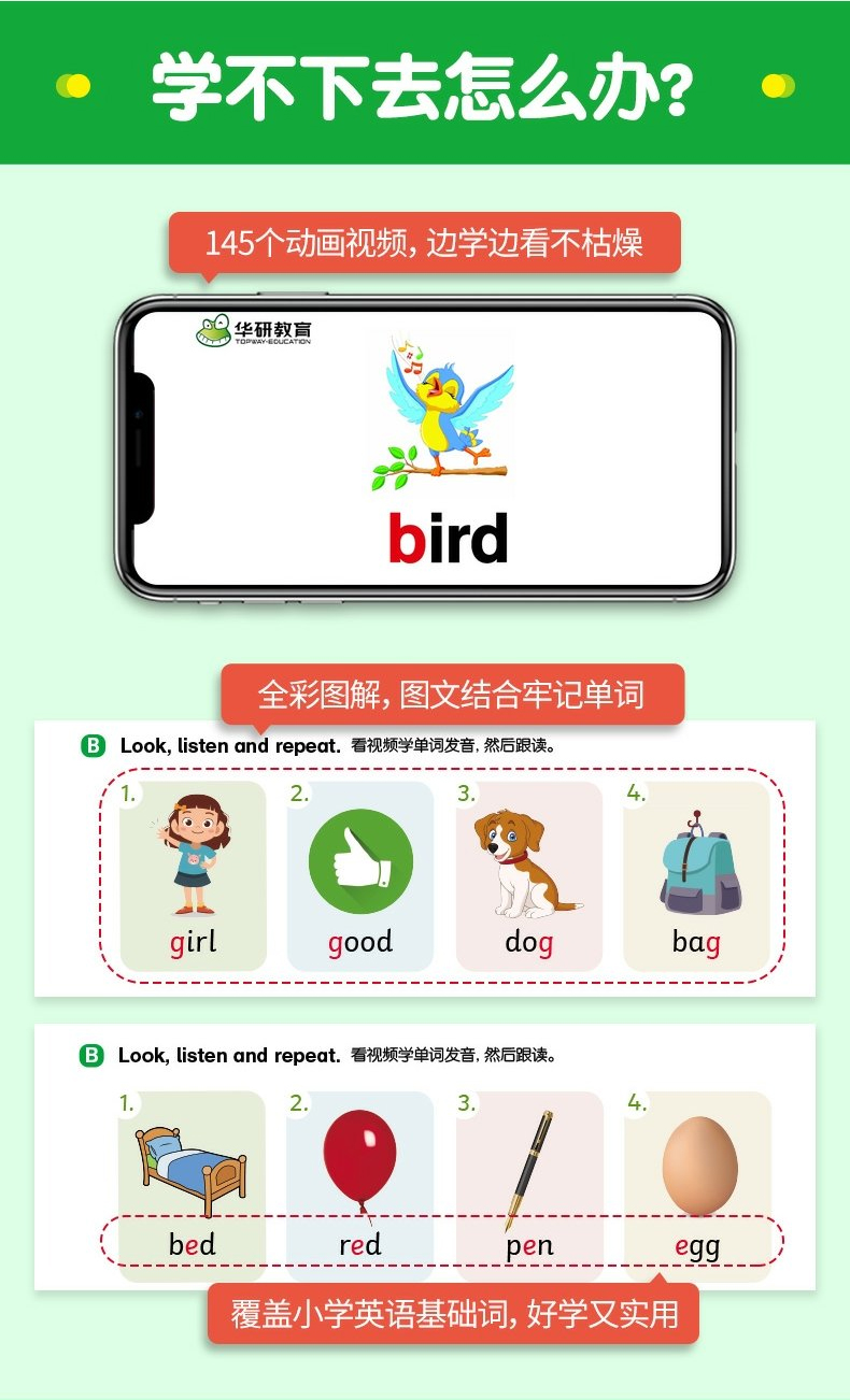 2. 由易到难,循序渐进,目标明确,循序渐进、形、义和用法学完可掌握26个英文字母及其字母音、约180组字母及字母组合和多音节词的拼读。