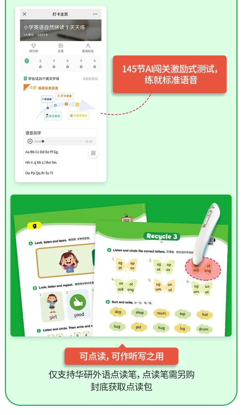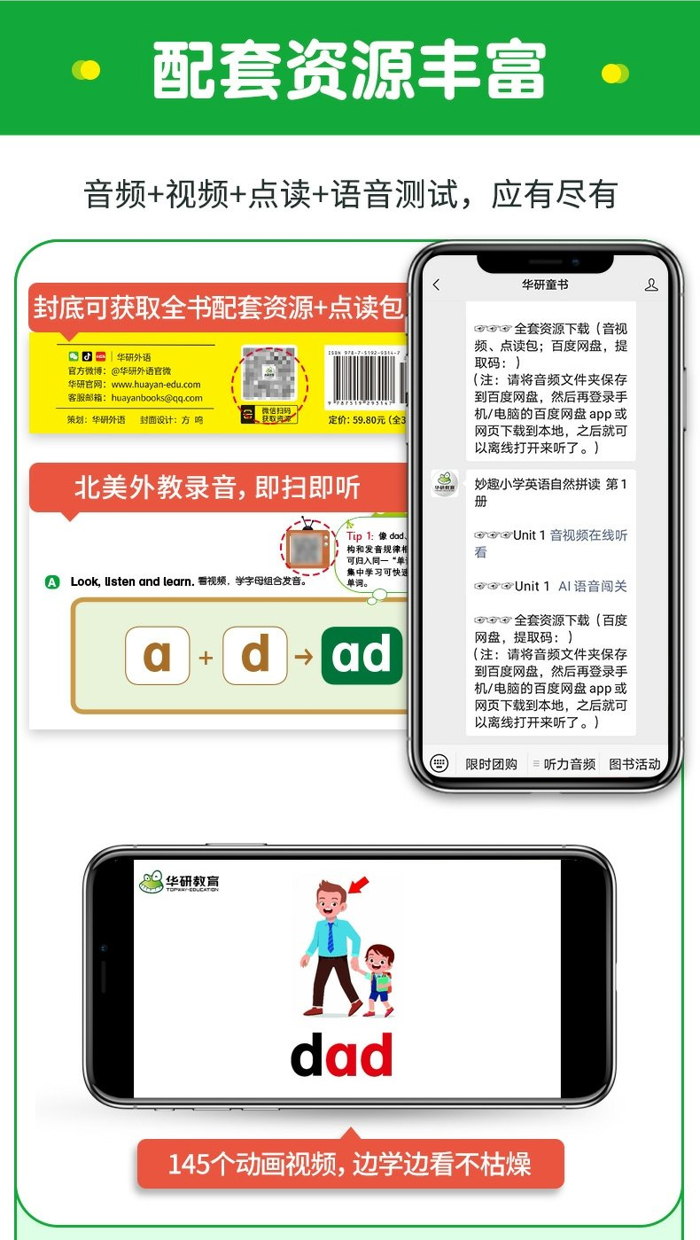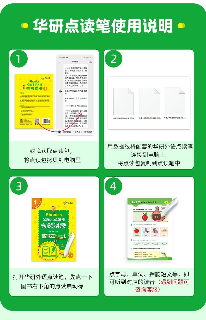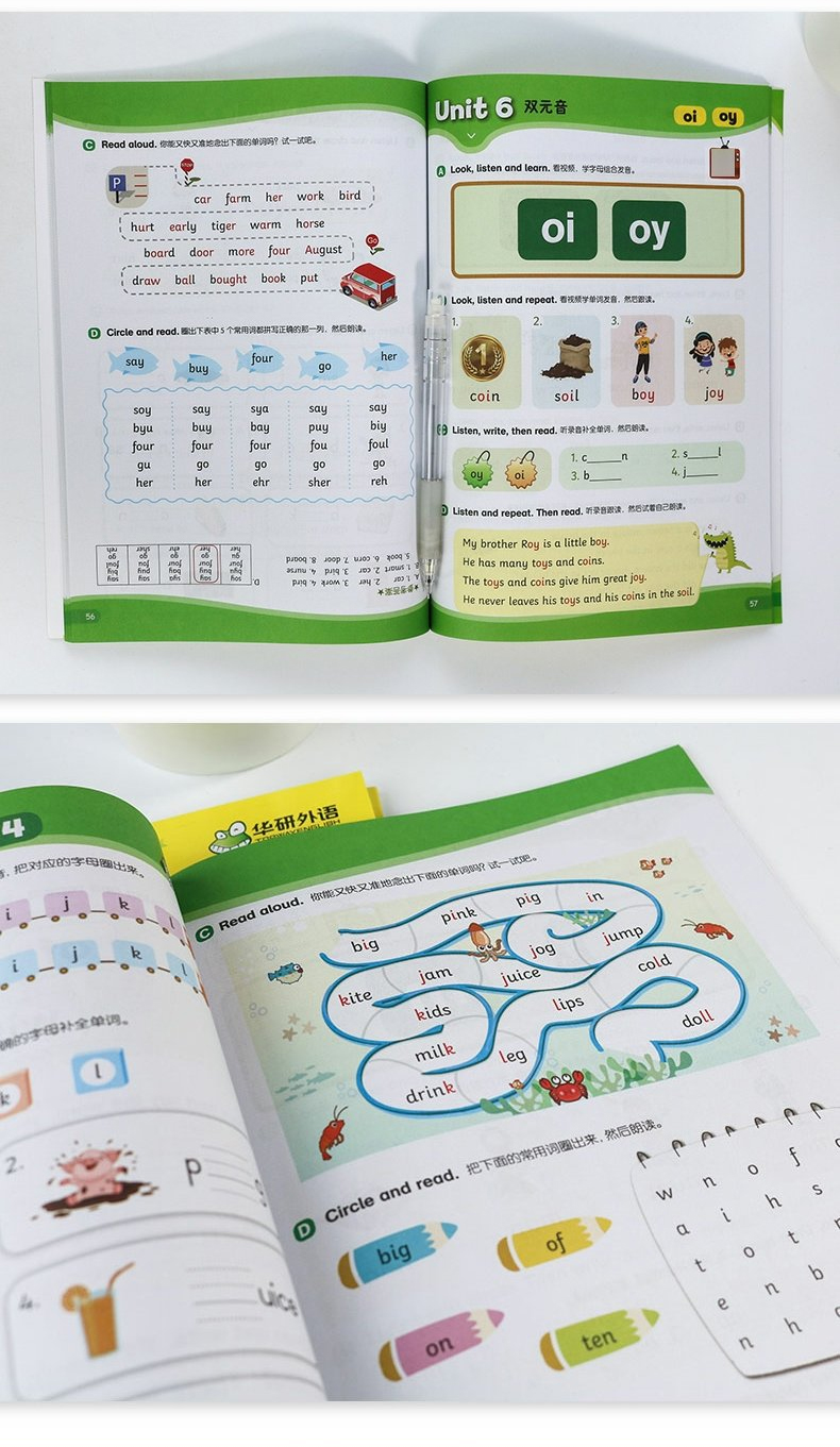 6. 所有字母、字母组合、单词和押韵短文均配音频,由北美外教录制,发音纯正,即扫即听,方便学习,也可搭配“华研外语”点读笔读使用(点读笔需另购)。