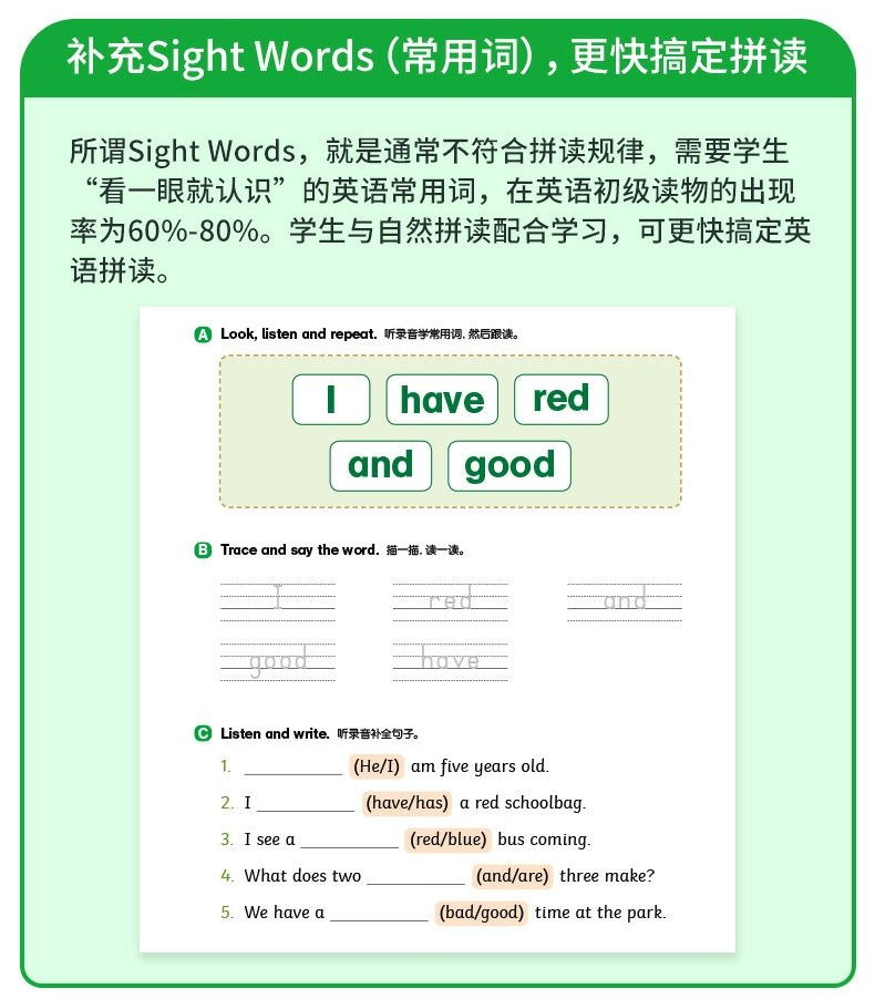 5. 补充105个通常不符合拼读规律,需要学生“看一眼就认识”的Sight Words英语常用词,与自然拼读配合学习,可更快搞定英语拼读。