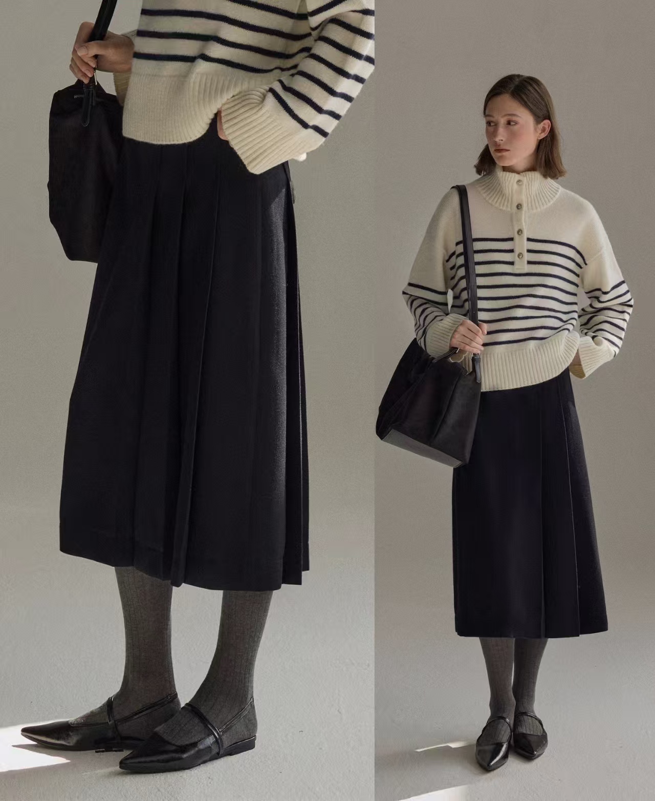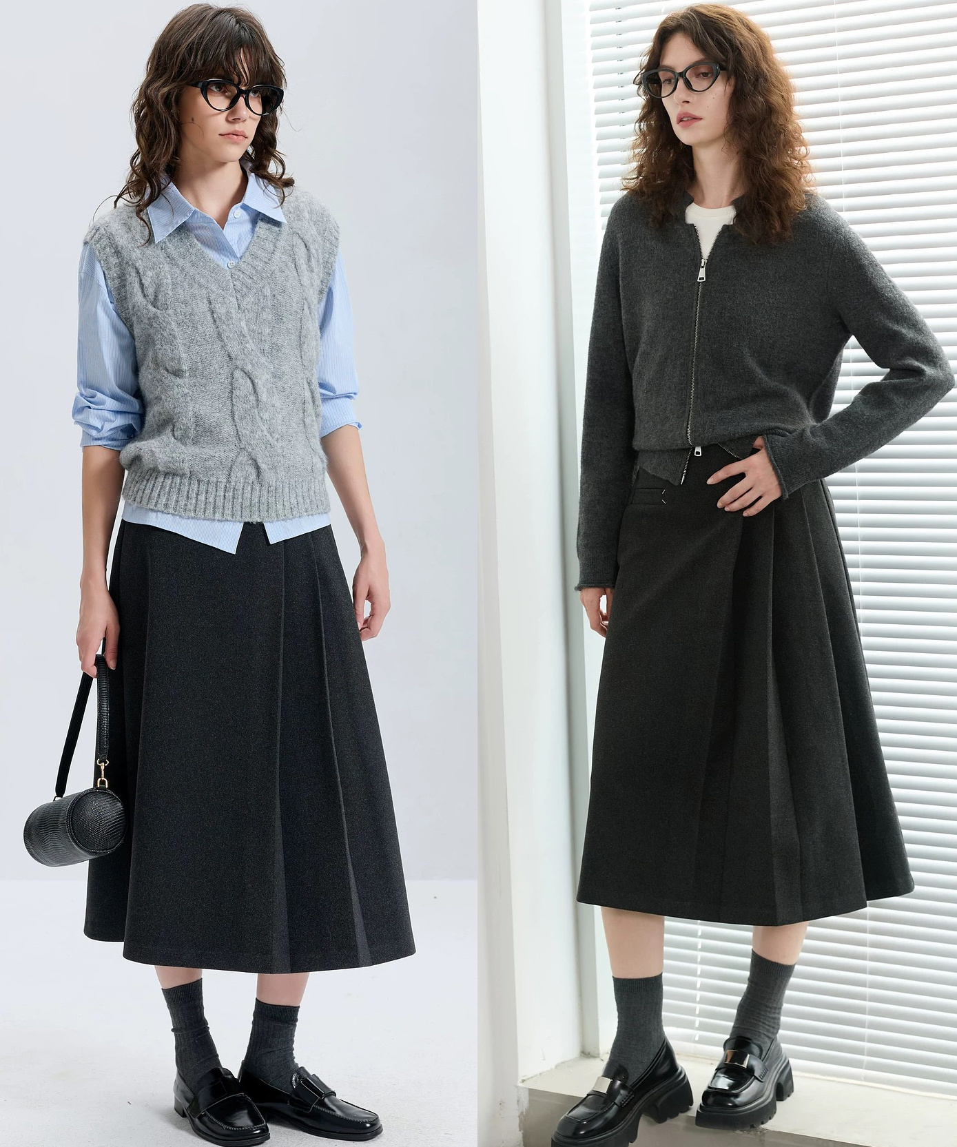 黑灰双色高级感拉满,上班套西装=职场精英,下班配针织马丁靴,智性与甜酷随性凹造型。