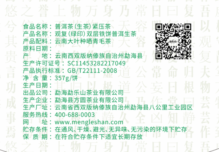 纯白的手工棉纸,质地柔韧,触感舒适。如果你足够细心,你会发现棉纸的底纹竟是《道德经》的原文:“万物并作,吾以观复”。其实“观复”通俗地说就是:一件东西,你反复地看,就有了喜爱、研究之意。这正是茶友们“藏茶”的乐趣所在,也是“勐乐山”藏茶系列取名“观复”的本意。