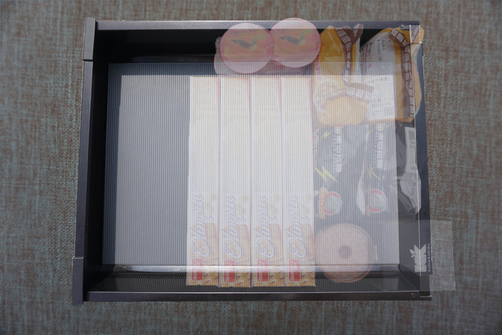 中鼓现象 | 由于产品采取了反卷工艺,所以产品在刚裁切好铺设时,会遇到两边紧贴抽屉底部,中间稍有鼓起的中鼓现象,只需要正常在抽屉里放进要收纳的产品(压在上面,刚开始时,最好是压在靠中间位置),经过一段时间后(约为2周左右),防滑垫就会变平整。 【这种现象很多时候在卷纸、铝箔等产品上都会遇到,处理方式完全相同】 |