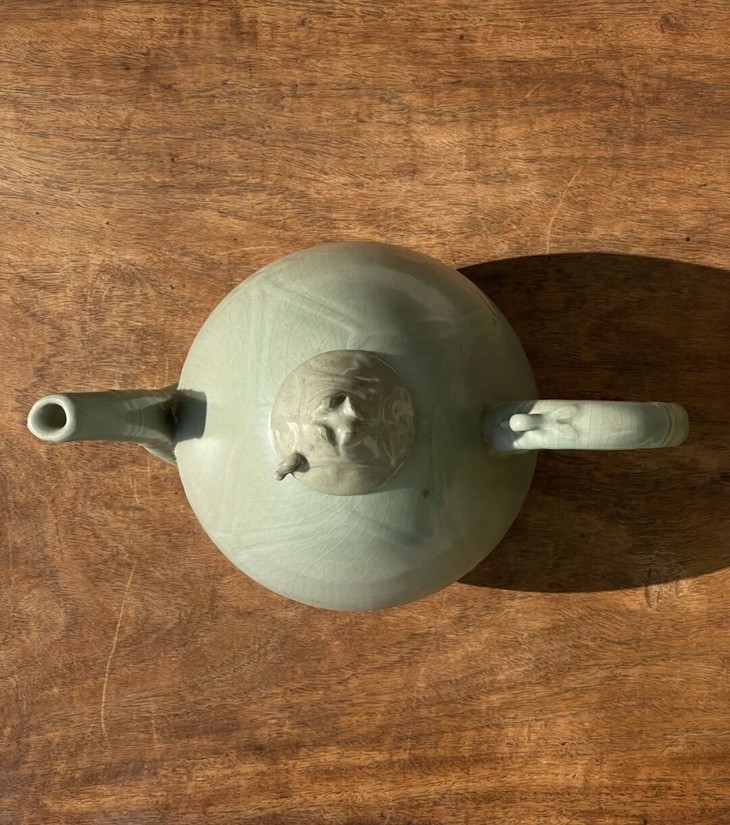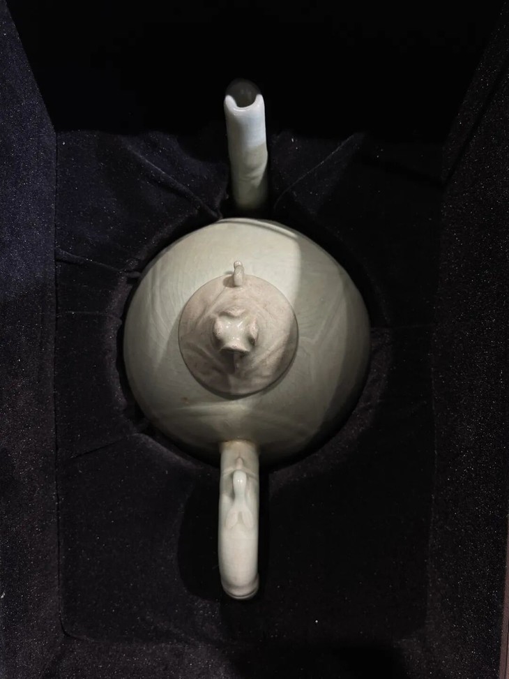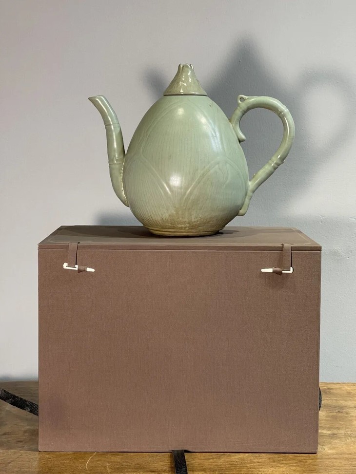 尺寸:青瓷茶壶,口沿直径:4厘米,壶嘴直径:2厘米。壶身长:29厘米,宽:17厘米,高:24厘米,底部直径:10厘米,重量:1872克。