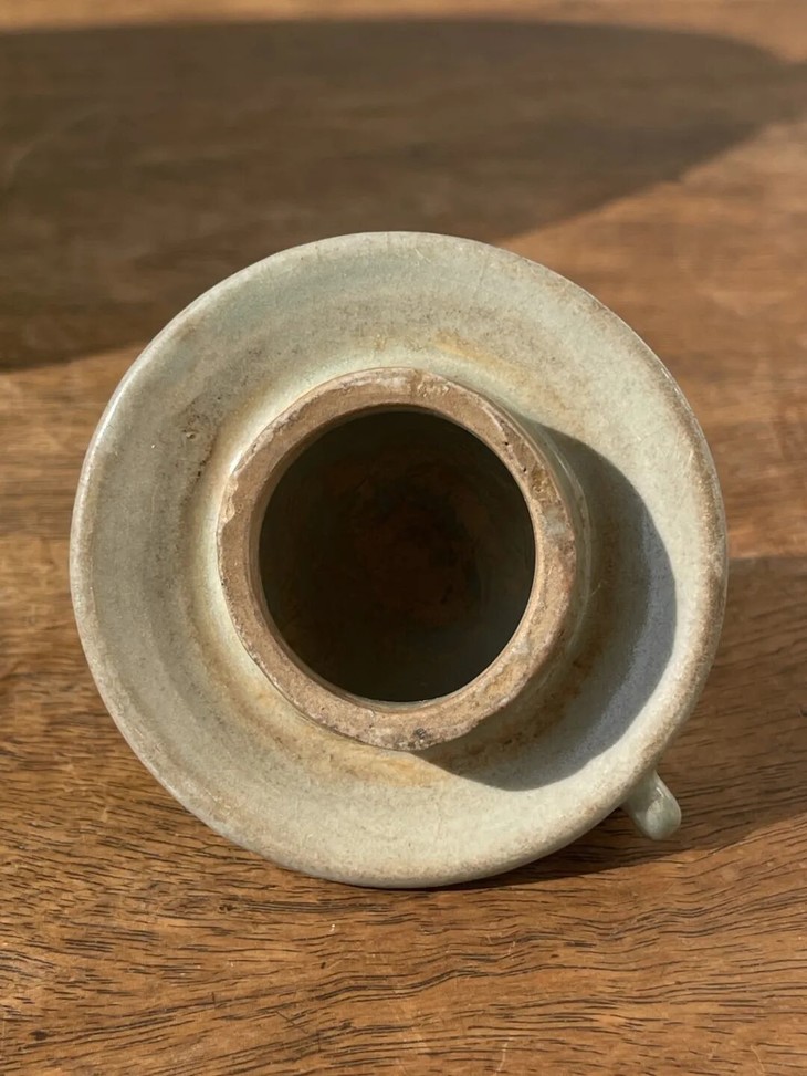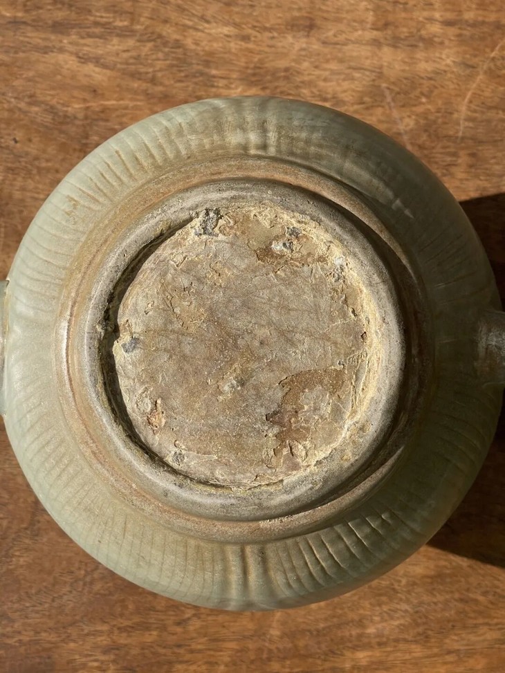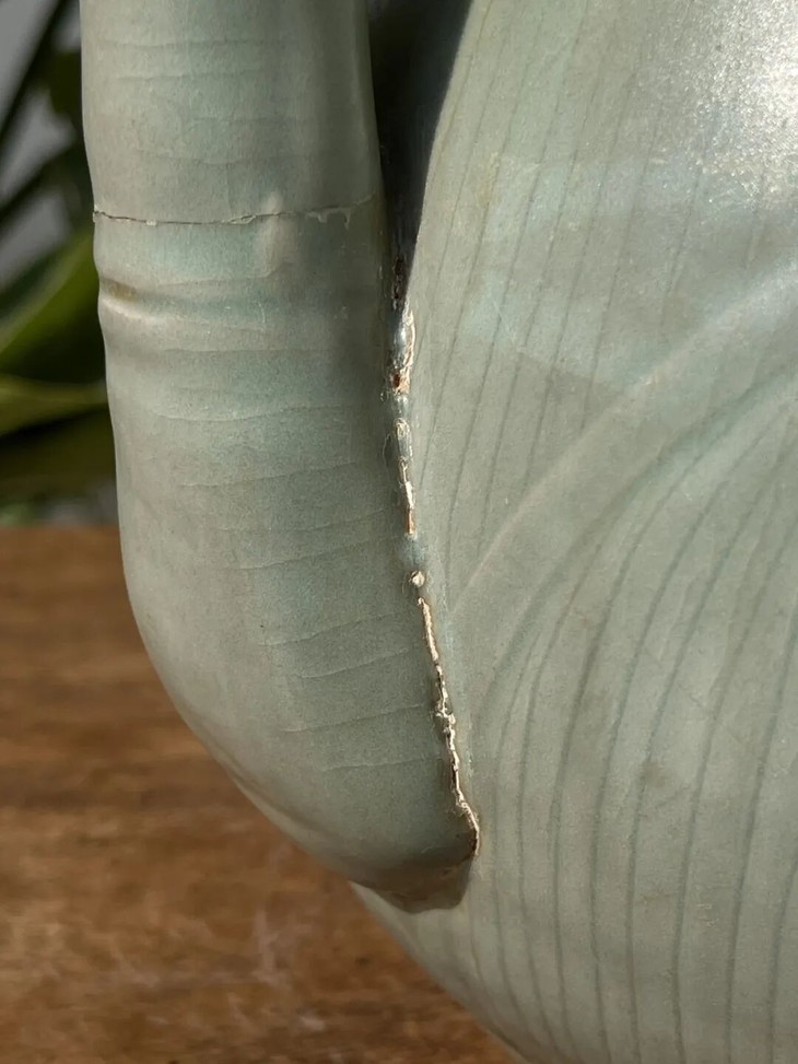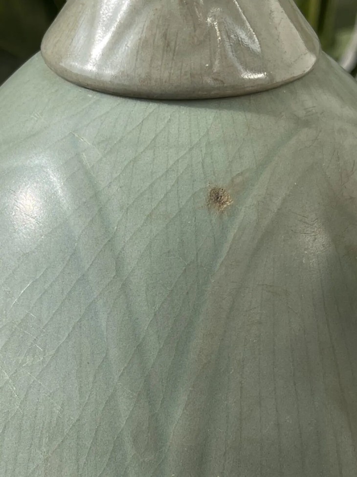 此青瓷刻竹荀型执壺,来自专注于收藏高丽/朝鲜瓷器的一位藏家,如图所示,壺流下方曾经断裂后黏着修补,修补处漏水,底部釉面因土蚀而变质,小局部釉面因窑中含烟呈现淡褐灰色,除此以外,基本保保持完好。收藏于前藏家量身订制的锦盒。