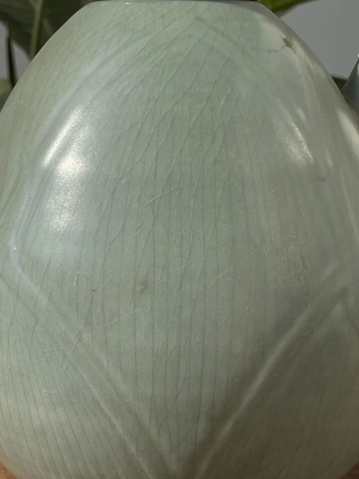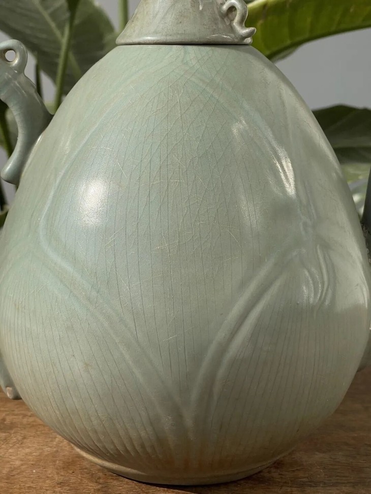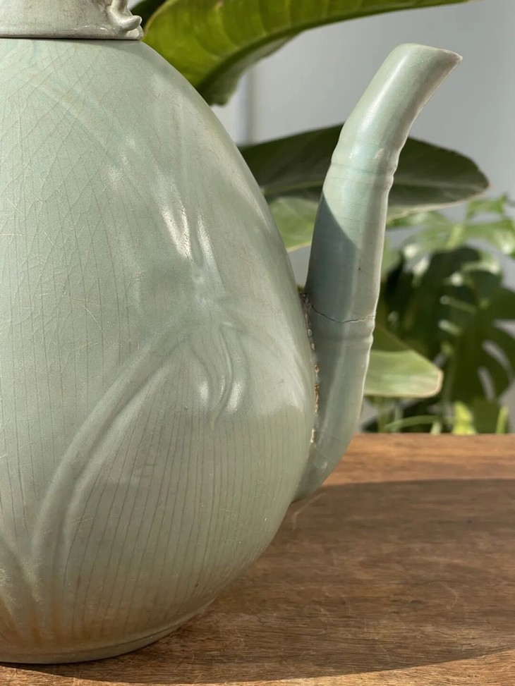 此青瓷刻竹荀型执壺,造型典雅贵气、刻划线条流畅,阴刻纹饰精緻华丽,翠青釉艳丽温润,具无色细开片,整体风格官气十足,针刻紋饰工艺精湛无可挑剔,全器覆盖青灰色青瓷釉,如此尺寸碩大的高丽风格青瓷刻花执壶非常少见,呈现朝鲜半岛官府貴族风格的高端瓷器。