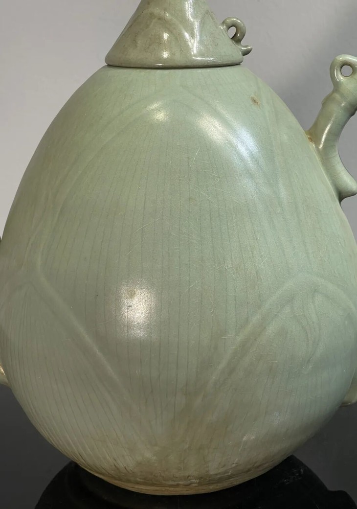 这是一件朝鲜半岛高丽风格的青瓷大执壺,造型优美的上尖下饱满圆融的竹荀型壺身与壺盖,搭配竹节壺流与把手,全器满工刻划竹荀与竹节细节,表面覆盖玻化强的粉青釉,呈现典型高丽时代流传的青瓷器物风格,纹饰精緻细腻、风格典雅贵气,底部矮圈足上沾黏石英垫饼痕迹。