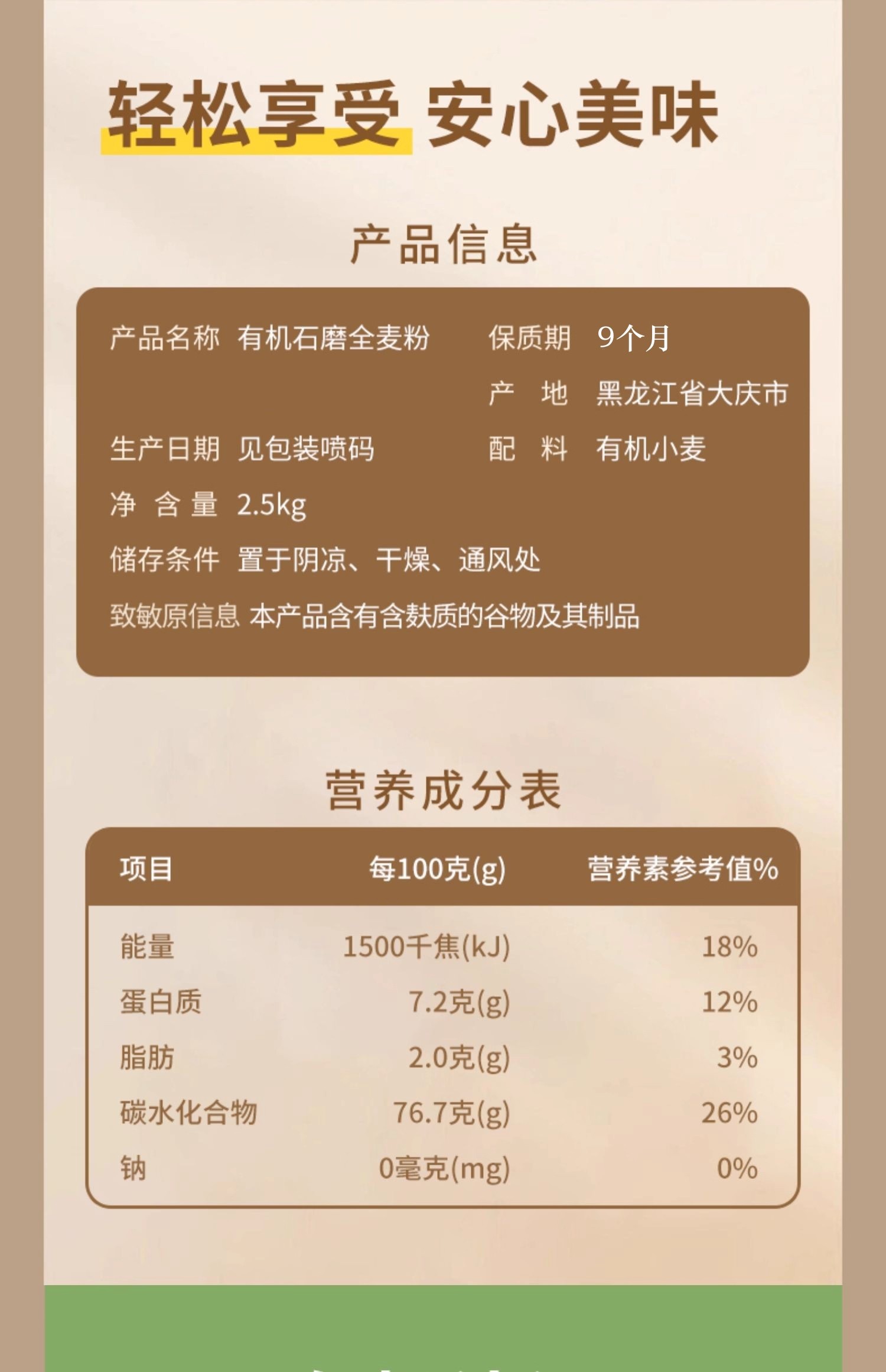 有机全麦面粉5斤装 传统石墨 有机慈心种植