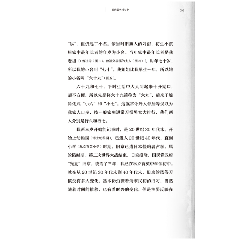 我于农历丙子年冬子月十七日(依万年历核算为公元1935年12月12日)生于旧京鼓楼大街宝钞胡同老宅。当时我母亲(图一)已与父亲结婚十年了,她是清末重臣那桐的第八个女儿(图二)。在旧京孩童初生后习惯先起个乳名(又称小名)。一般给孩子起乳名随意性很强,只是为了呼叫方便,等孩子上学时才起学名(大名)。但许多旧家大姓,则是孩童降生已起定大名,但为了家庭生活称呼方便,还是要起个小名。所以我已按辈分名起单字、排水字旁为“泓”,但仍起了小名。依当时旧旗人的一种习俗,初生小孩用家中最年长者的年岁为小名。当年家中最年长者是我老祖(曾祖母((图三),曾祖父杨儒的夫人(图四),时年七十岁,所以我的小名叫“七十”。我姐姐比我早生一年,所以她的小名叫“六十九”(图五)。