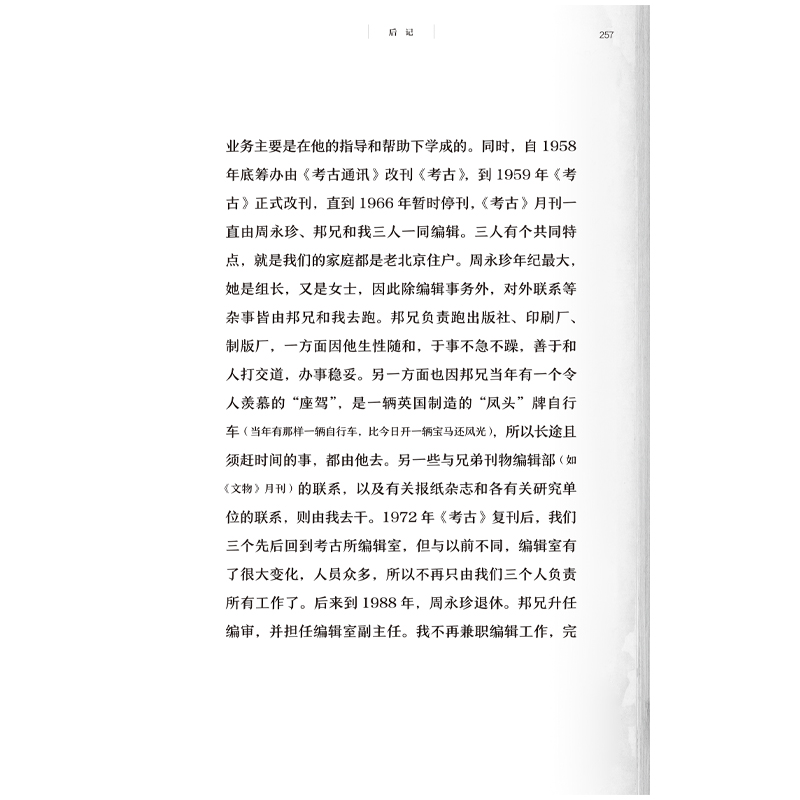 我出生在北京,学习在北京,工作还在北京。至今已在北京生活了八十七年。在这段时期中,北京经历了三次重大的历史变革。我出生的1935年时,北京已经不准叫“北京”,被改叫“北平”,因为北伐成功后,国民政府将首都定在江苏南京,因此北京就不可称“京”。我刚两岁时,1937年发生卢沟桥事变,日本帝国主义侵占北京,直到1945年日冦战败投降。这段时期正好是我从幼儿到童年,己开始小学生活的时期。经过日本投降的历史变革后,国民党政权恢复了对北平城的统治,到1948年底,北平城经历了翻天覆地的历史变革,天亮了,北平和平解放。在这段历史时期,正值我从小学到初中求学的时期。1949年中华人民共和国诞生,定都北京,于是北平那个名称就成为历史的陈迹。从那时起,我完成中学学业,1953年进入北京大学历史系学习,1958年毕业并被分配到中国科学院考古研究所(今中国社会科学院考古研究所)工作至今。