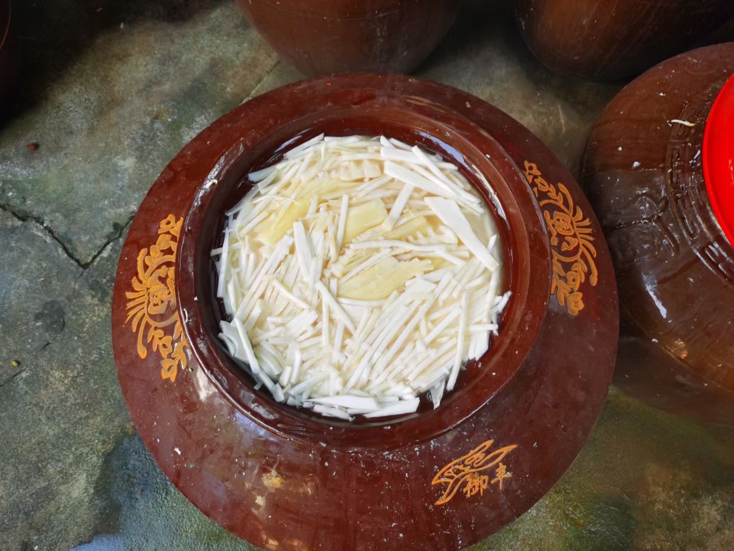采用毛洲岛上新鲜竹笋,选取最嫩部分(酸笋确保无一根老笋),瓦缸泡制,味道醇正。