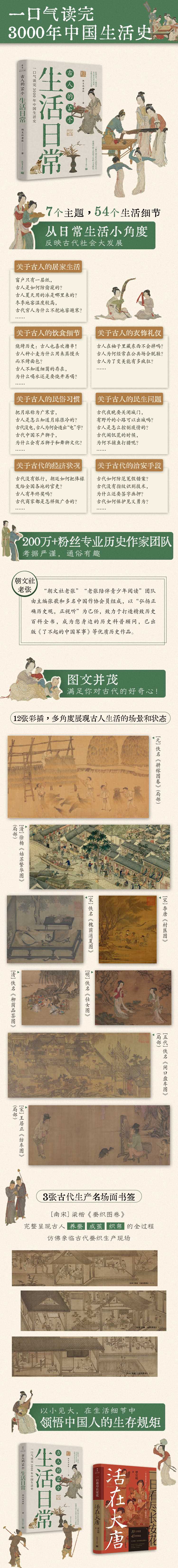 2、内容丰富:12张经典古画彩插,7大主题,54个古人生活日常,从图到文,从衣食住到经济治安,古代人3000年的生活细节变迁,反映了古代社会的进步与发展、突破与局限。