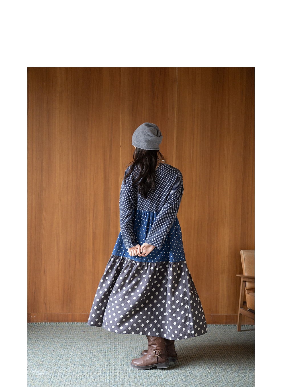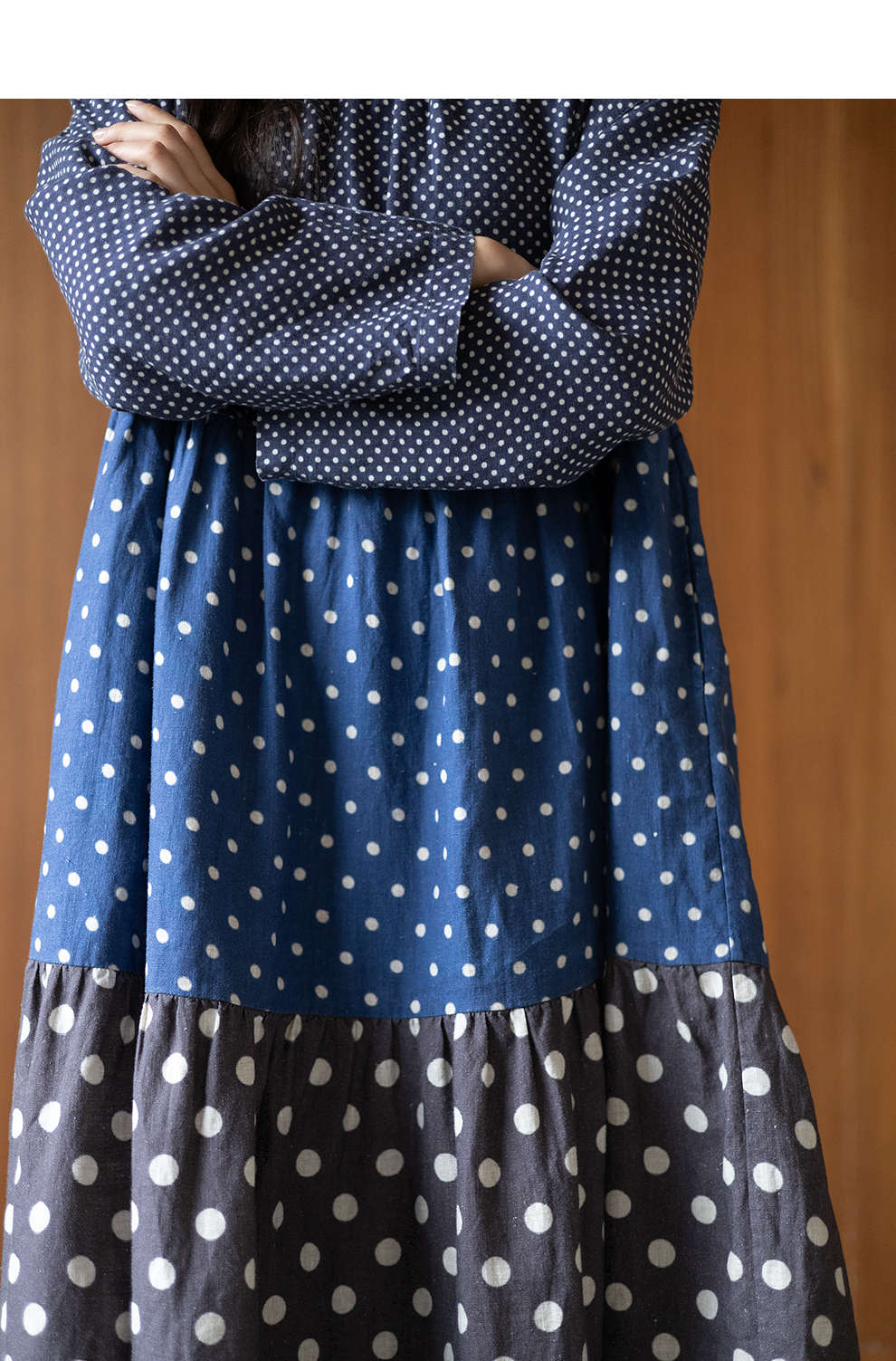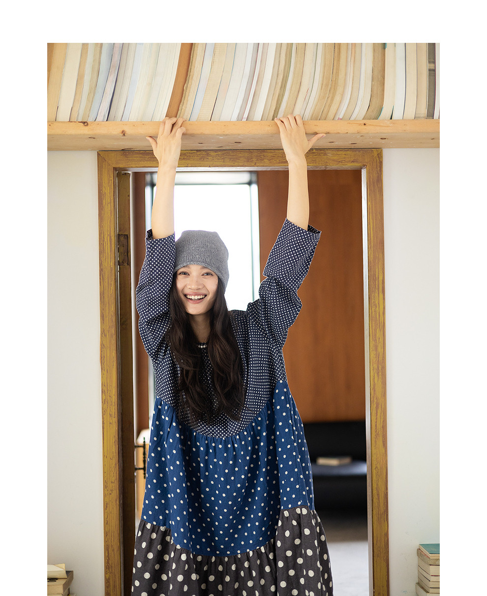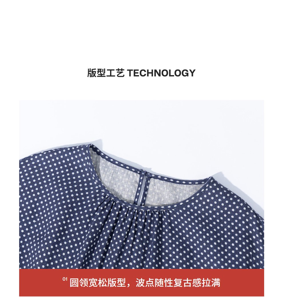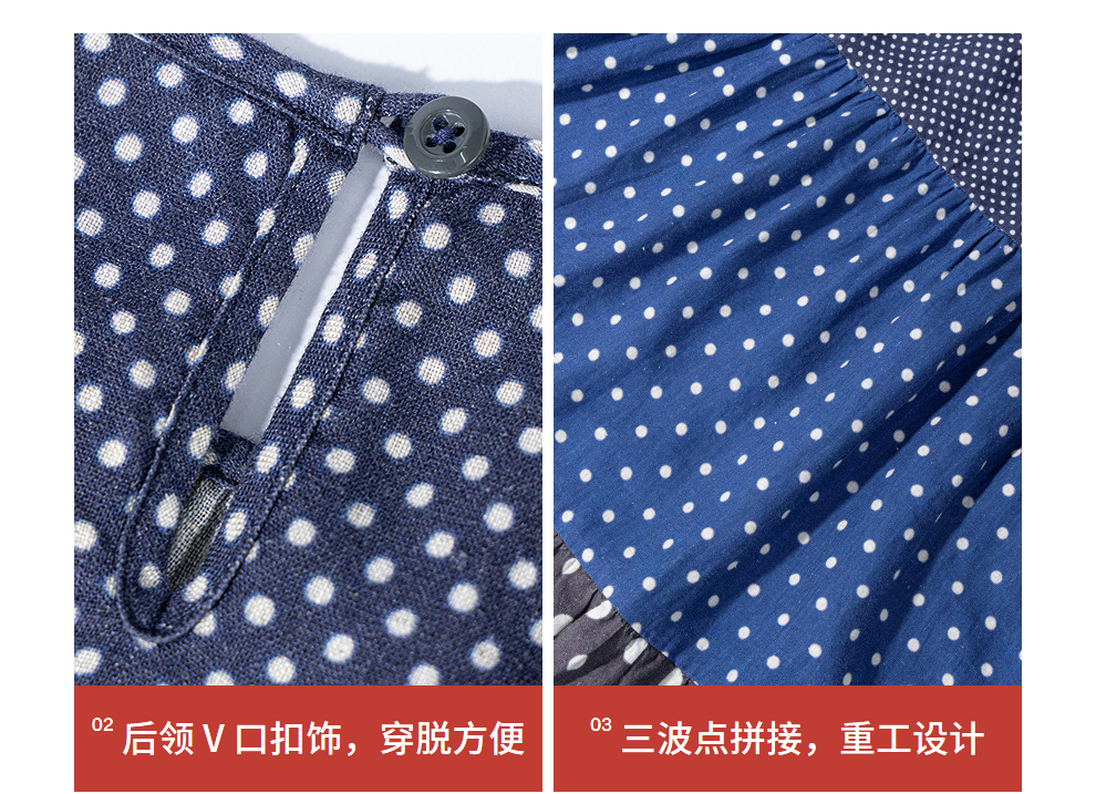 绽放856朵/波波裙·新款撞色波点拼接长袖连衣裙圆领宽松旅行长裙