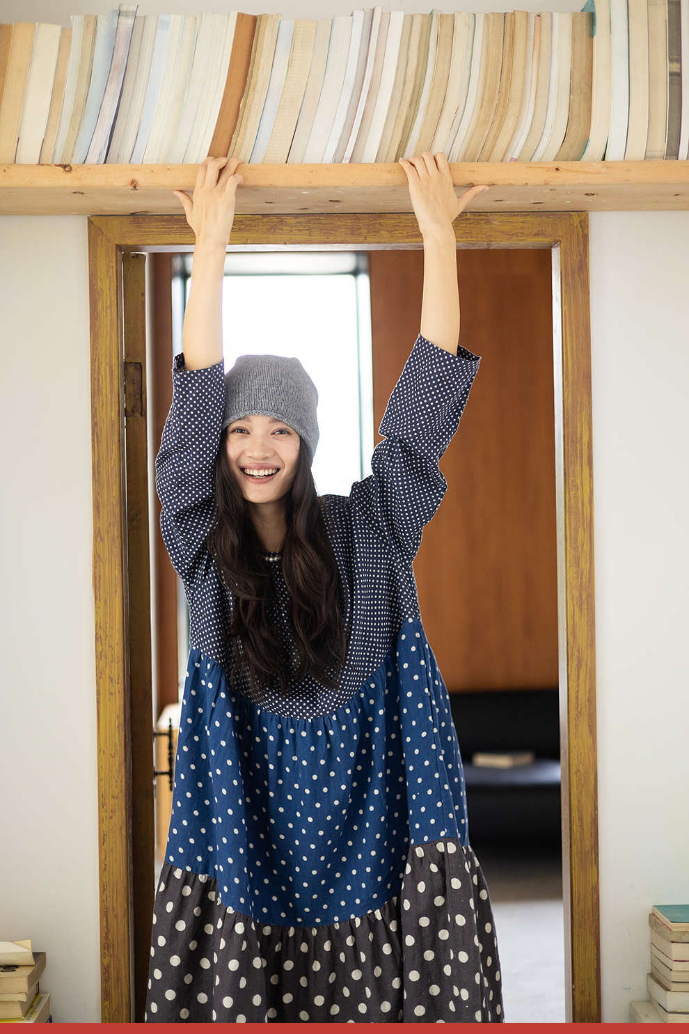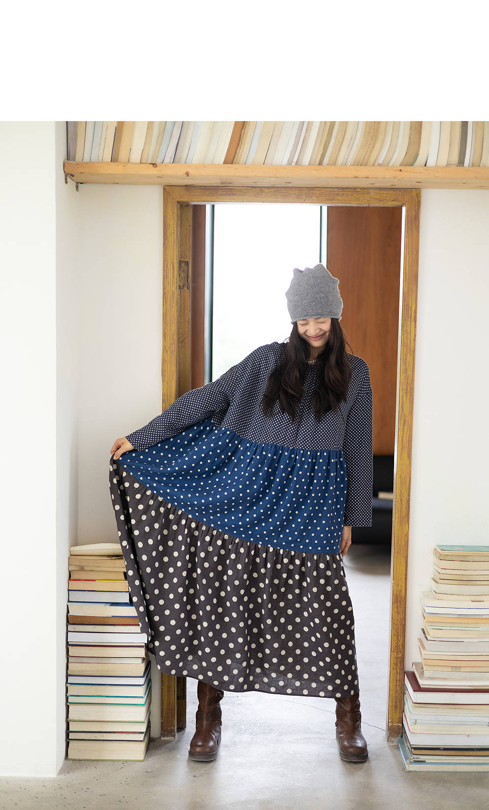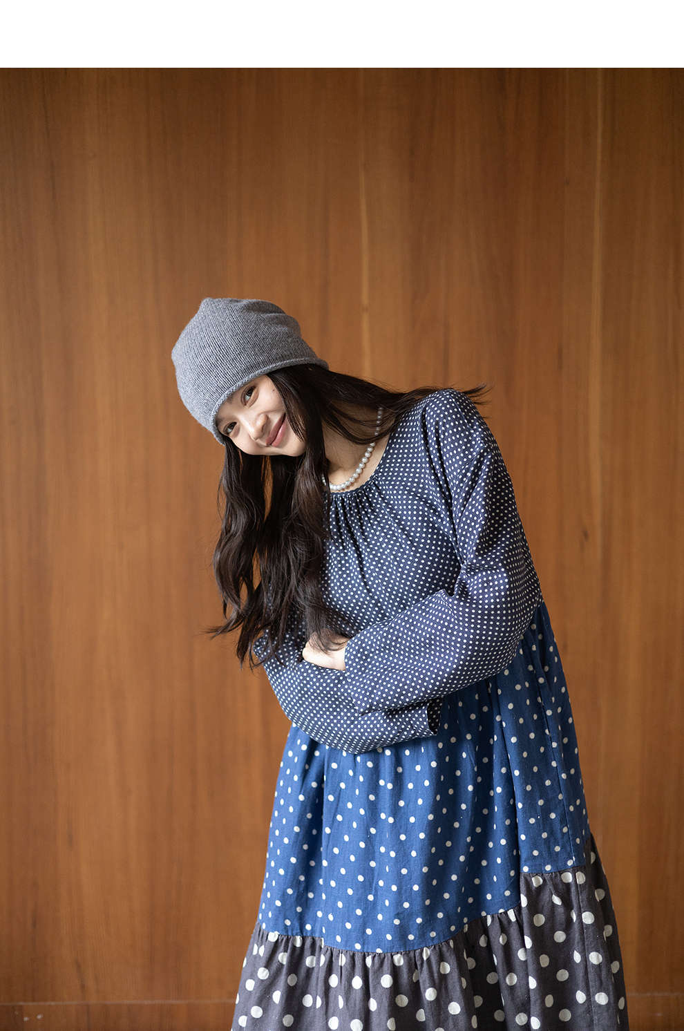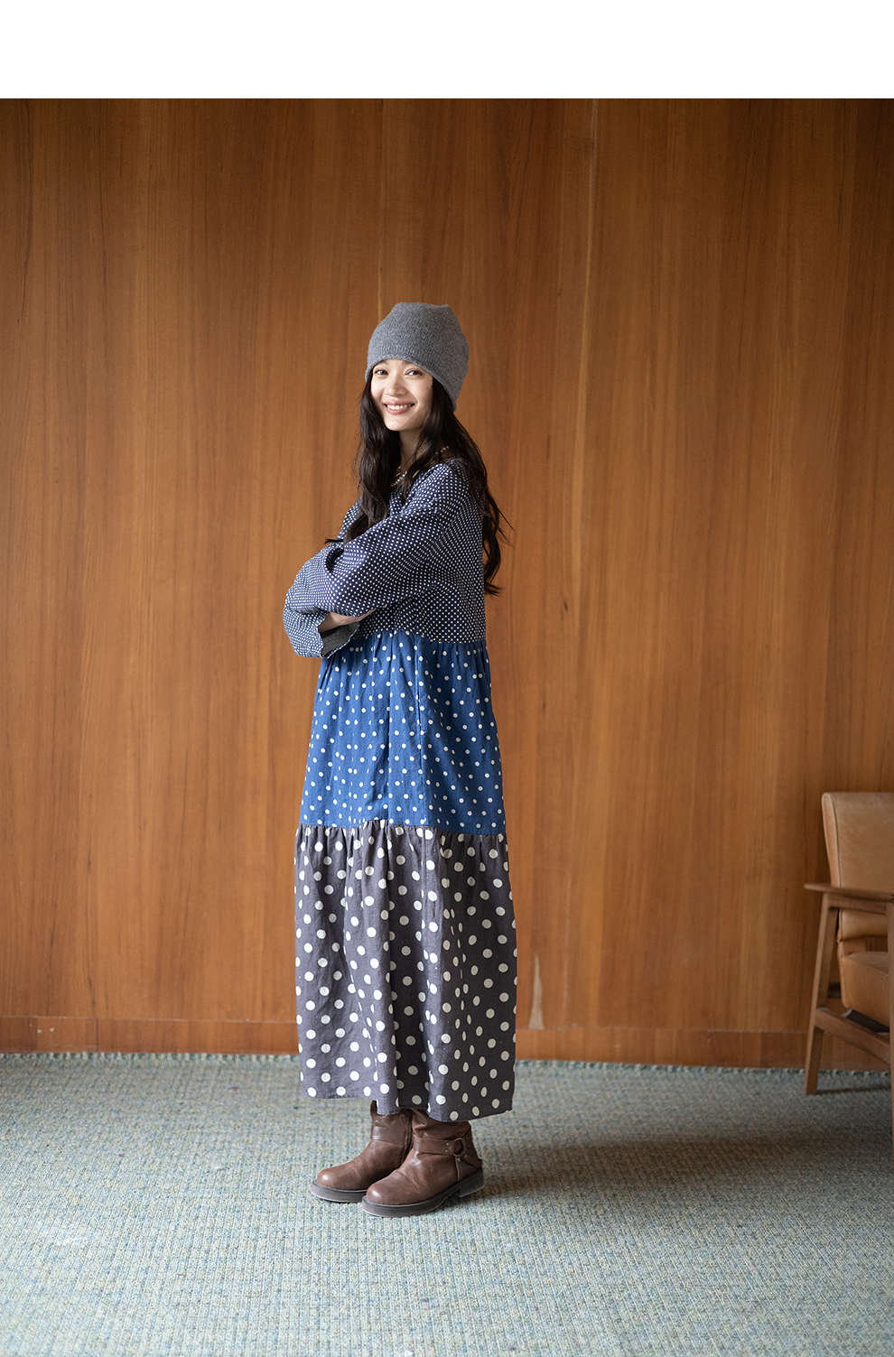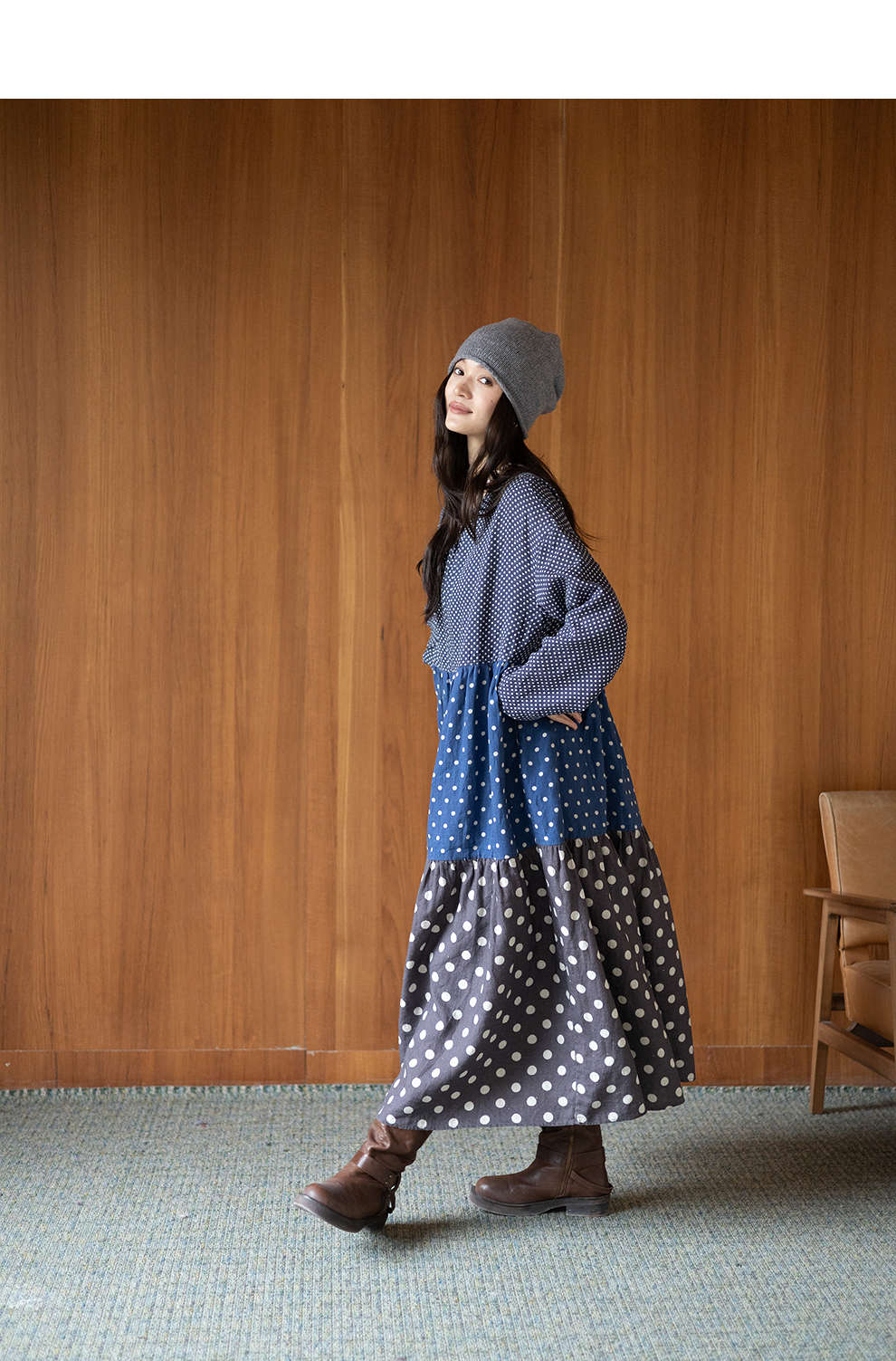 绽放856朵/波波裙·新款撞色波点拼接长袖连衣裙圆领宽松旅行长裙