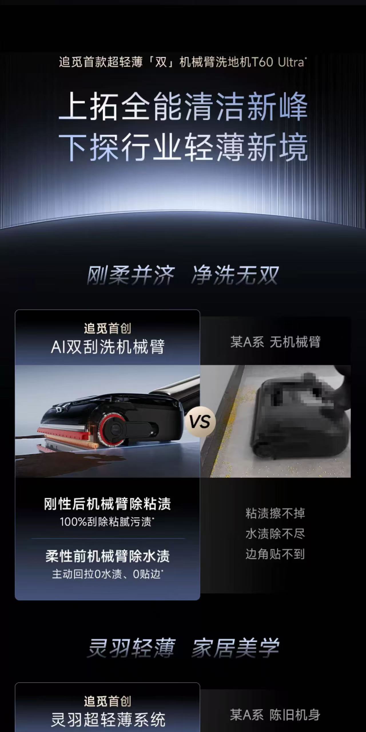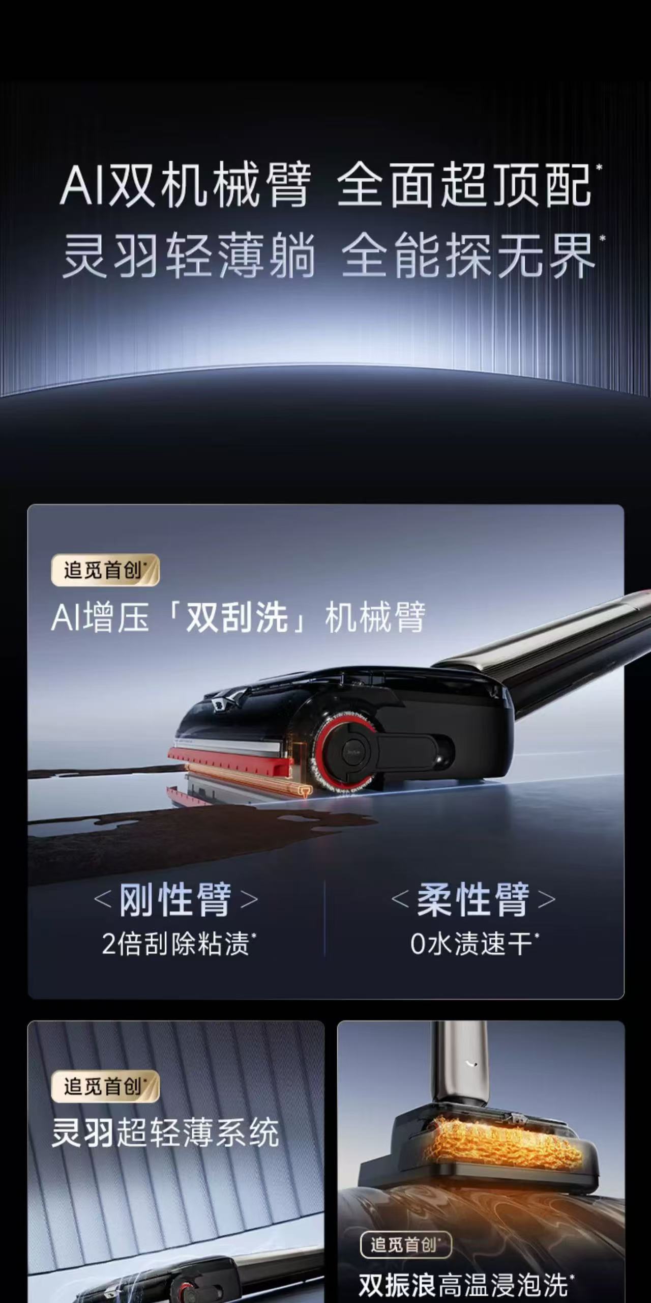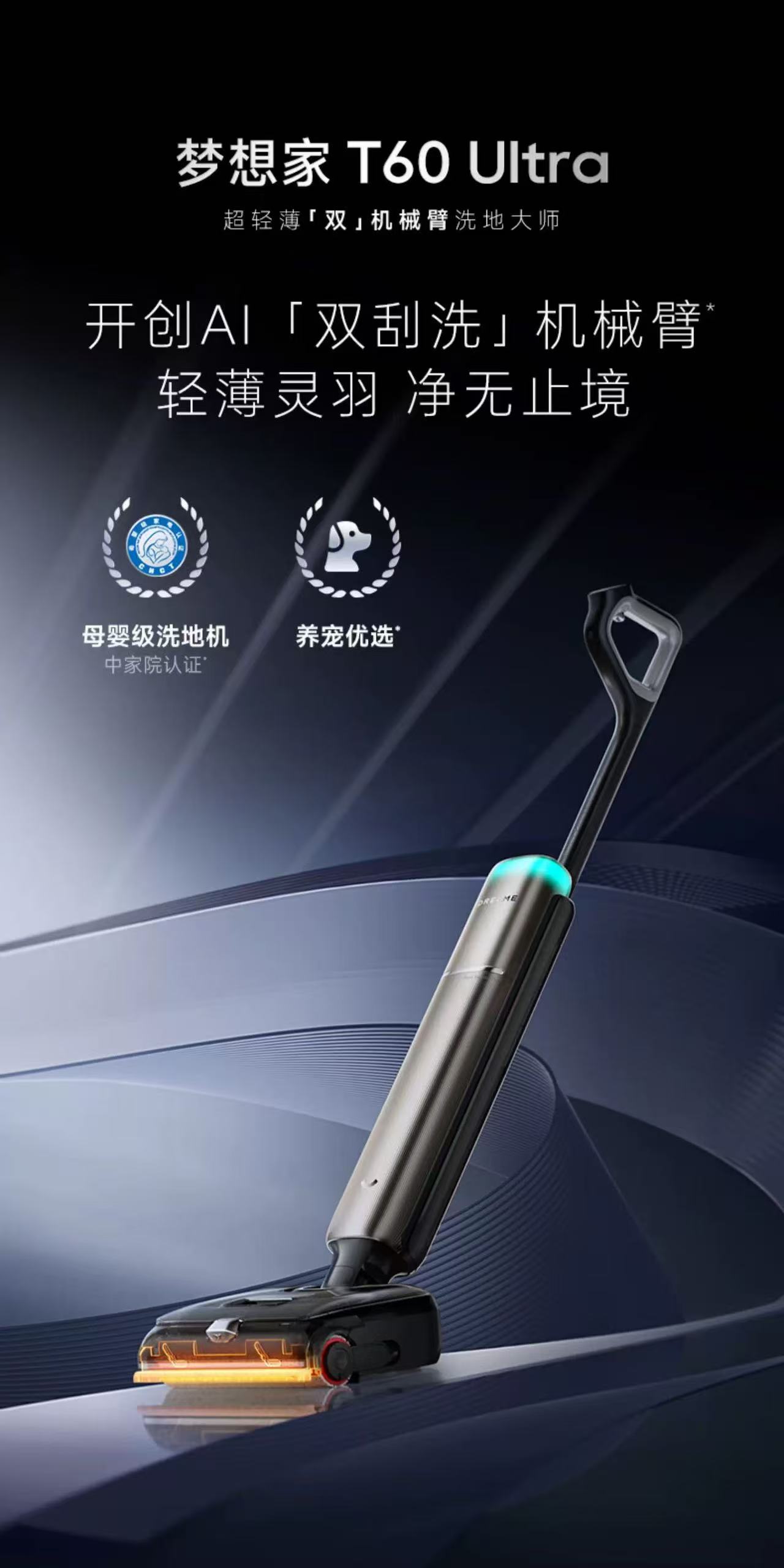 追觅双机械臂泡沫洗地机T60Ultra超薄躺平0缠毛0水渍自清洁拖地机