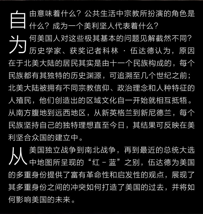 伍达德令人信服地论证了,自美利坚合众国建国以来,联邦内形成了11个独具特色的地理“民族”,每个民族都有各自的身份和价值观。