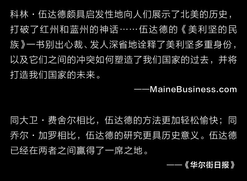 科林·伍达德颇具启发性地向人们展示了北美的历史,打破了红州和蓝州的神话……伍达德的《美利坚的民族》一书别出心裁、发人深省地诠释了美利坚的多重身份,以及它们之间的冲突如何塑造了我们国家的过去,并将如何打造我们国家的未来。