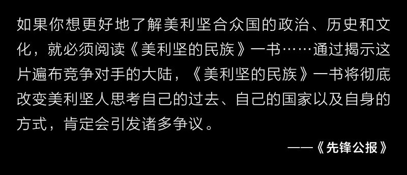 如果你想更好地了解美利坚合众国的政治、历史和文化,就必须阅读《美利坚的民族》一书……通过揭示这片遍布竞争对手的大陆,《美利坚的民族》一书将彻底改变美利坚人思考自己的过去、自己的国家以及自身的方式,肯定会引发诸多争议。