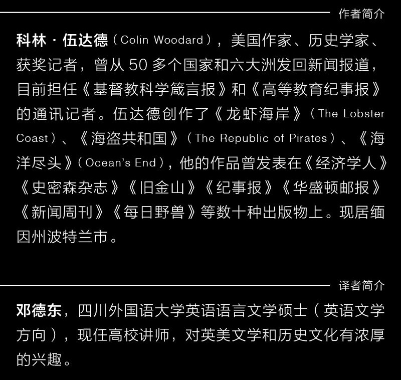 科林·伍达德(Colin Woodard),作家、历史学家,获奖记者,曾从50多个国家和六大洲发回新闻报道,目前担任《基督教科学箴言报》和《高等教育纪事报》的通讯记者。伍达德创作了《龙虾海岸》(The Lobster Coast)、《海盗共和国》(The Republic of Pirates)、《海洋尽头》(Ocean's End),他的作品曾发表在《经济学人》《史密森杂志》《旧金山》《纪事报》《华盛顿邮报》《新闻周刊》《每日野兽》等数十种出版物上。现居缅因州波特兰市。