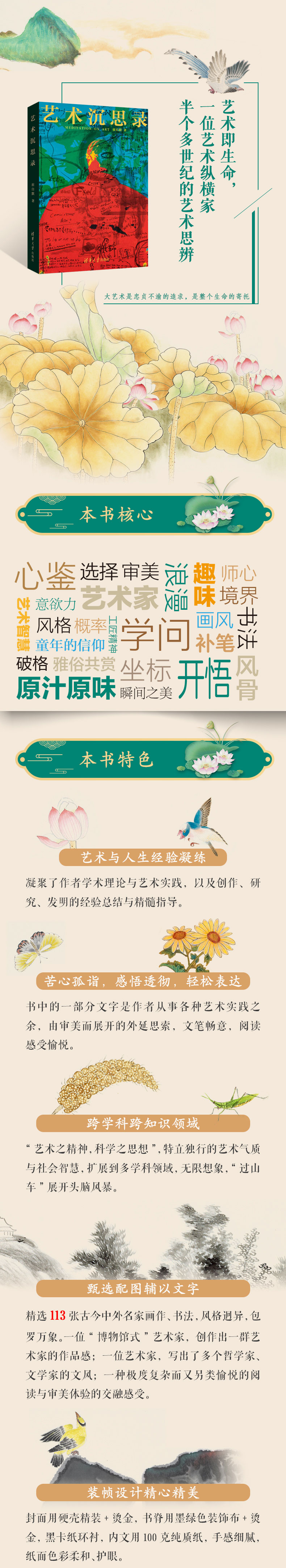 | 《艺术沉思录》图文并茂,凝聚了崔自默先生从事艺术创作近40年来的艺术教学、实践、研究、发明的经验总结与精髓指导,还包括一些轻松畅达的随笔、心得和感悟。书中精选插画除了有崔自默先生的个人绘画或装置艺术等创作之外,还有古今中外艺术大家的画作,与文字相辅相成,相映成趣。文字启迪慧心,插画提升美感。 |