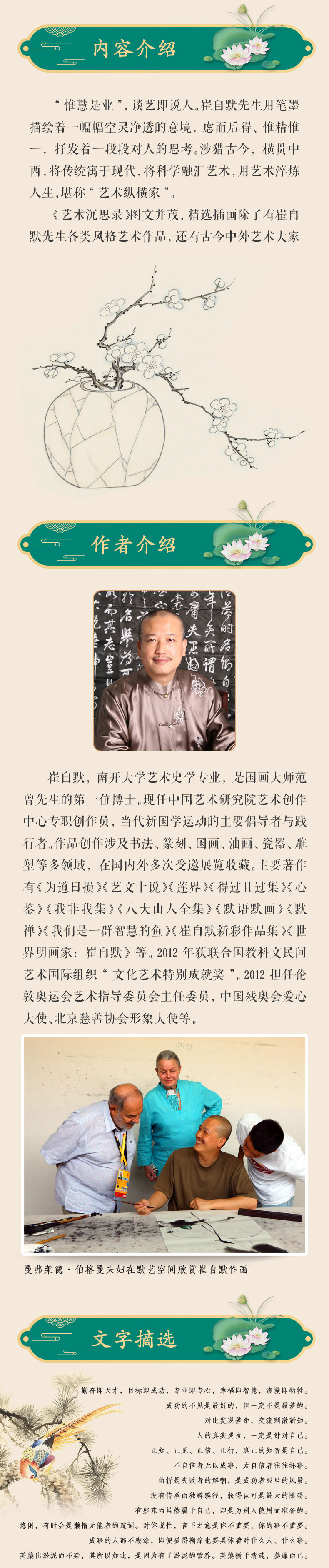崔自默,理工科学士、硕士,艺术史学博士,中国艺术研究院艺术创作中心专职创作员,当代“新国学”运动的主要倡导者与践行者。主张“艺术之精神,科学之思想”“爱心是新文化”“慈善是新生活”,发明“默纸”,倡导“慢步主义”“仁爱主义”。其创作包括书法、篆刻、国画、油画、瓷器、雕塑、漫画、摄影等。主要著作有《为道日损》《章草艺术》《艺文十说》《莲界》《心鉴》《心裁》《视觉场》《我非我集》《八大山人全集》《花有花期》《默语默画》《默禅》《我们是一群智慧的鱼》《得意忘象》等。 |