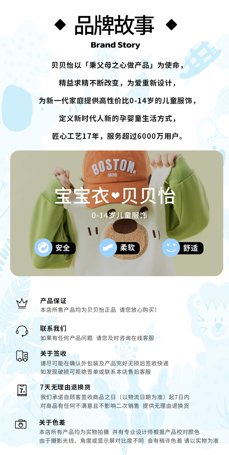 - 贝贝怡专注0-6岁婴幼儿服饰,坚持安全、柔软、舒适的产品理念,为千万中国家庭提供超高品质、安全可靠的婴幼儿服饰产品,妈妈放心,宝宝开心!