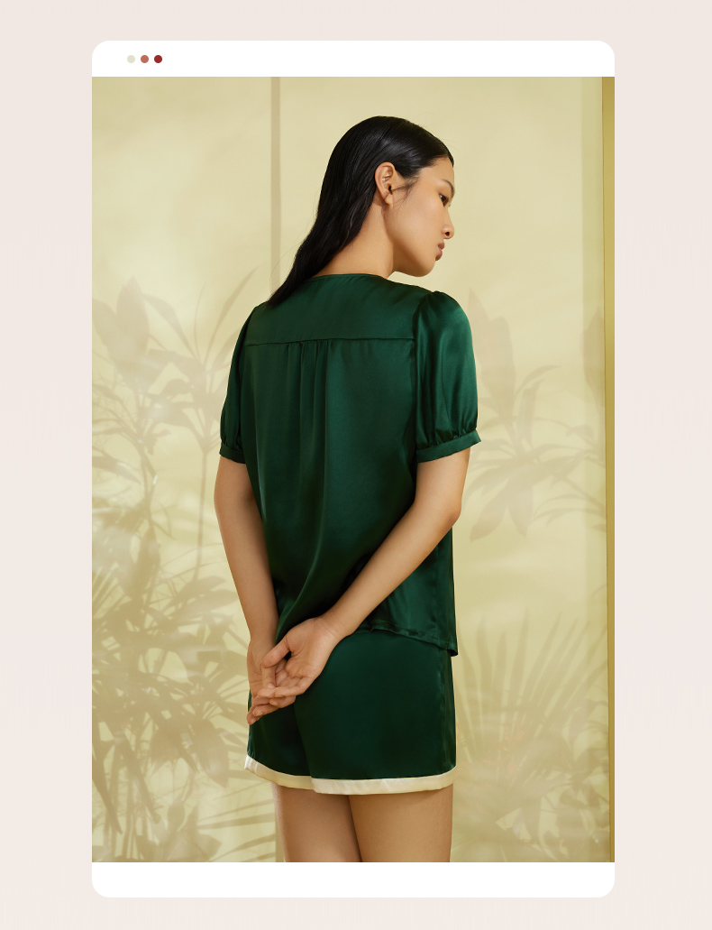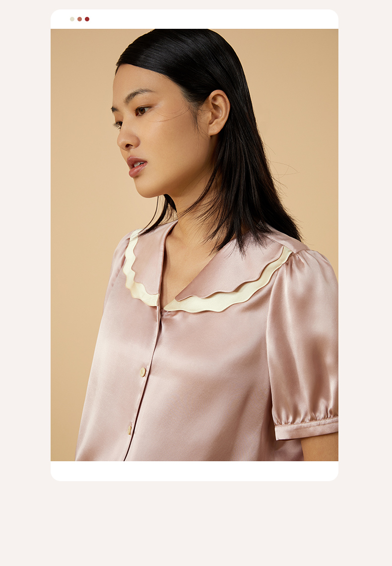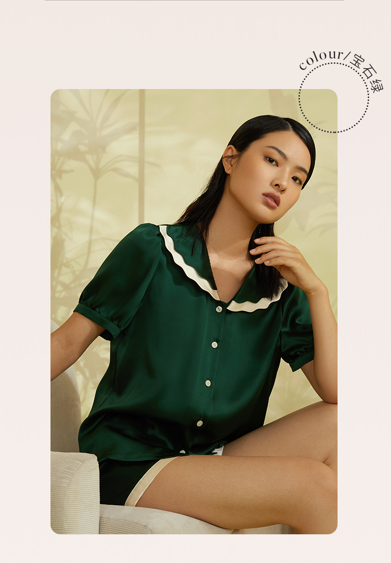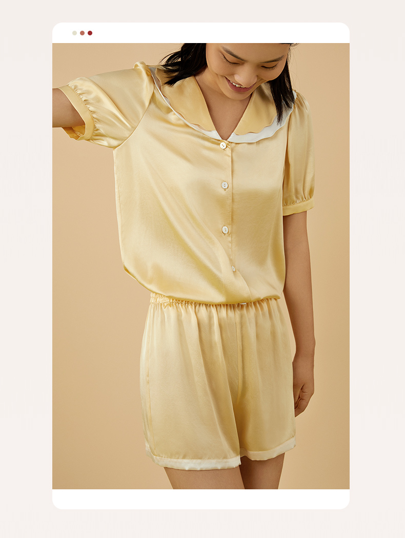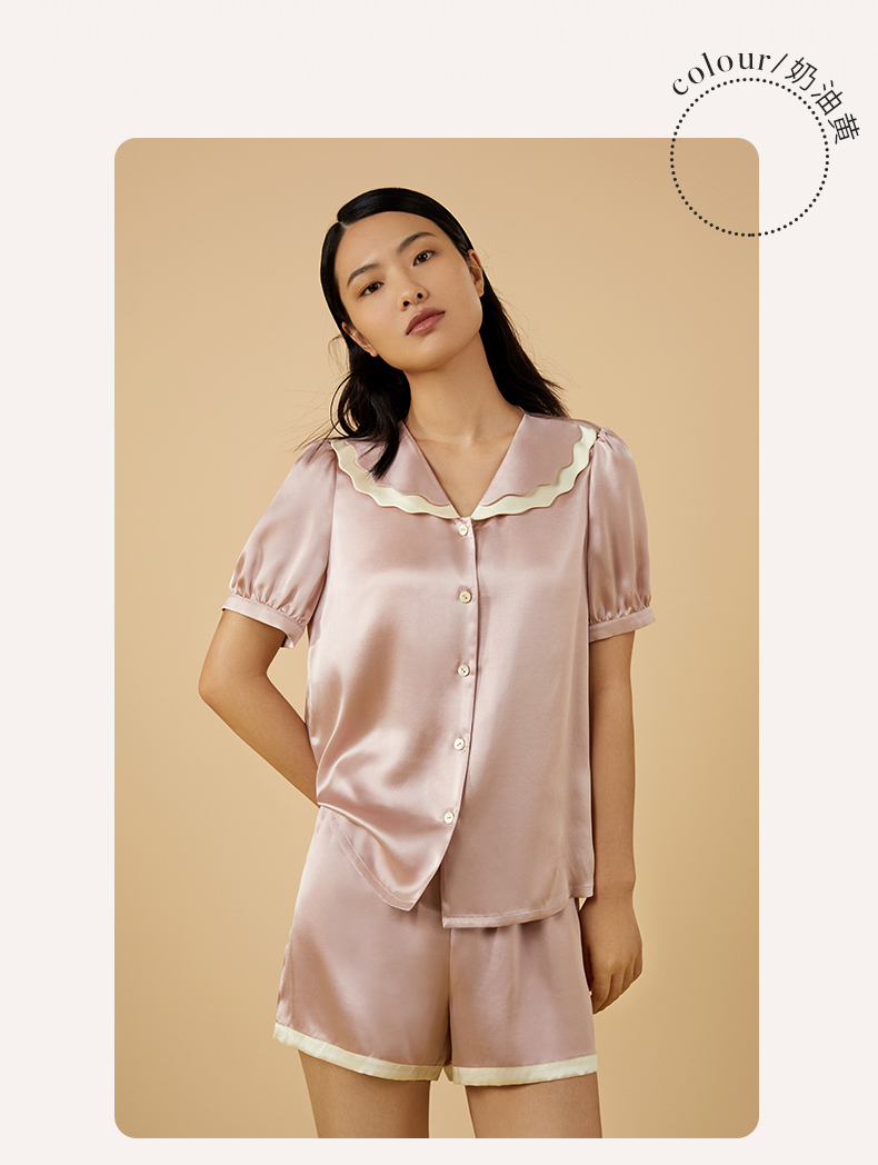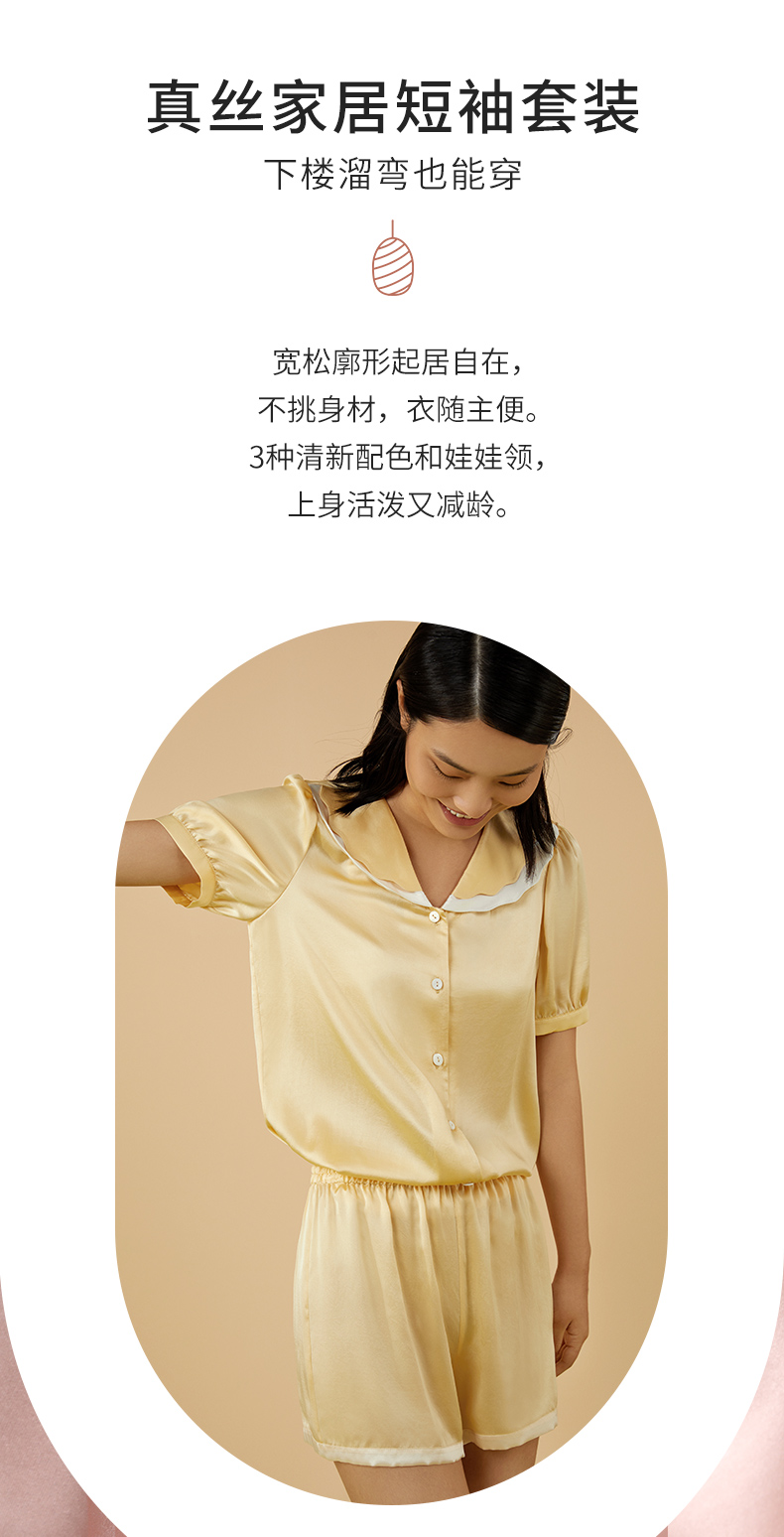 金三塔100%桑蚕丝复古花瓣双层领舒适凉爽女士真丝睡衣 衣裤套家居服 YSFCA403