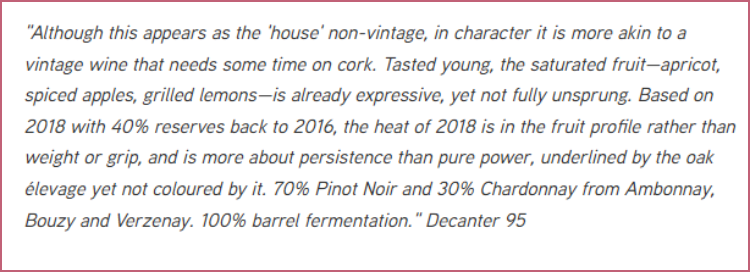 酒庄旗舰款特级园,由70%黑皮诺和30%霞多丽酿造,葡萄来自三个特级村Ambonnay, Verzenay及Bouzy,储备酒比例高达50%,80%橡木桶和20%陶罐陈酿,酒泥陈酿时长更是高达54个月,补糖为3-4g/L。
