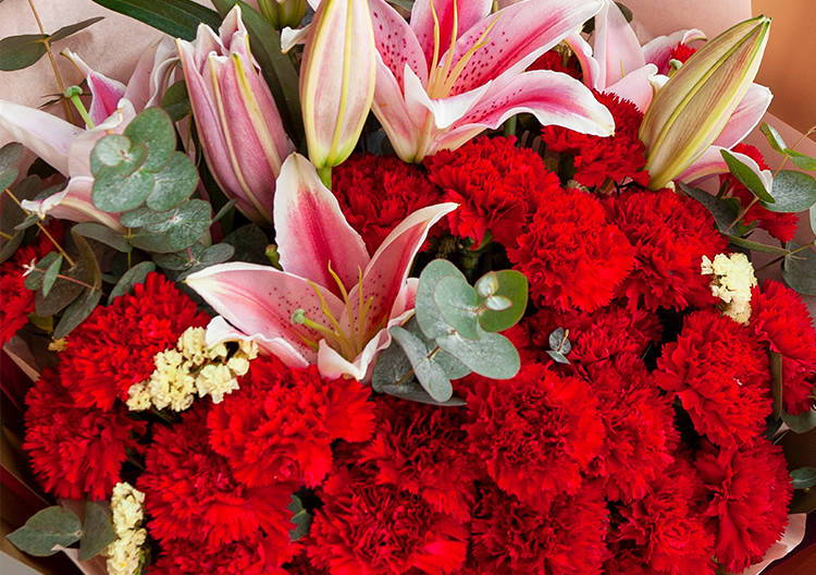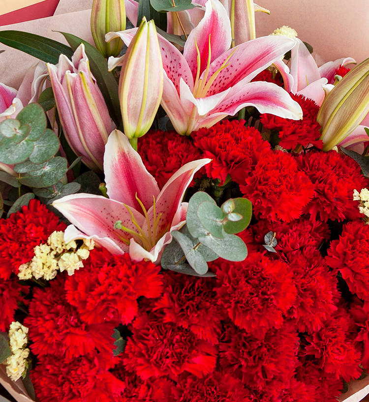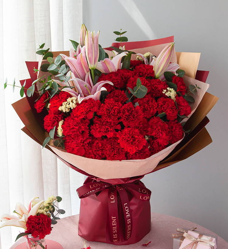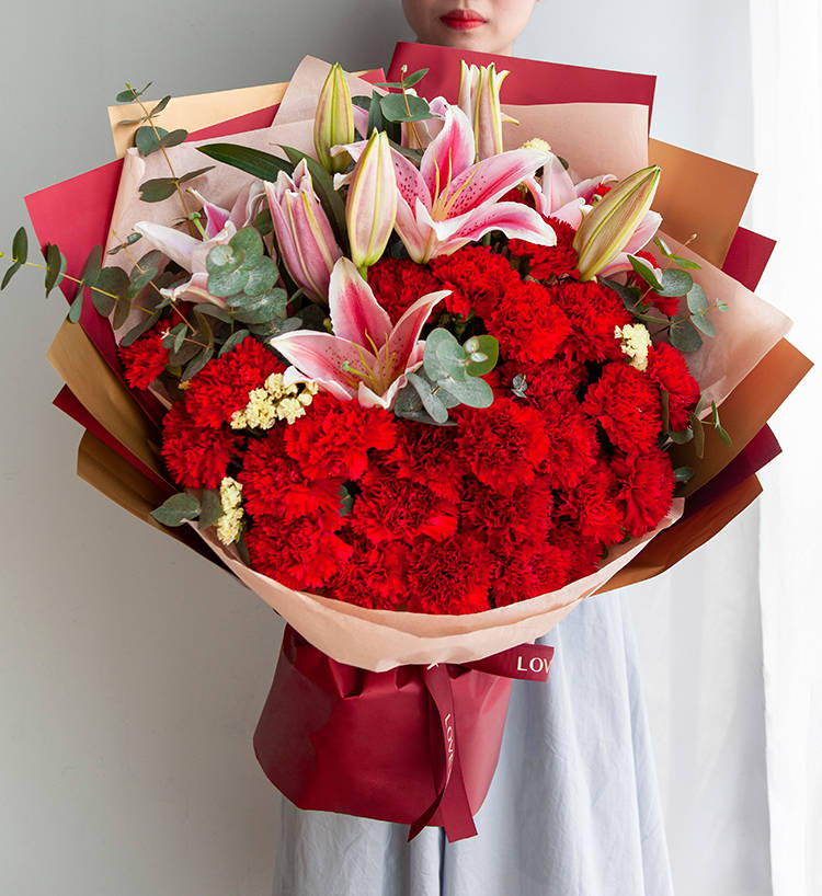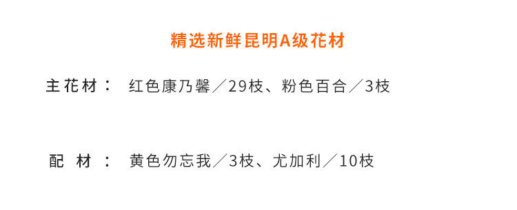 红色康乃馨29枝、粉色百合3枝(3-5头/支)、黄色勿忘我(缺货可用类似黄色或粉色配花代替)、尤加利