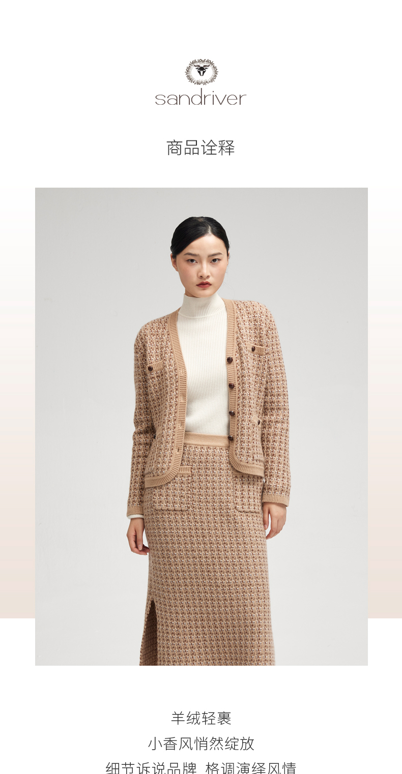 历年在巴黎时装周亮相,享誉世界的艺术羊绒品牌[Sandriver 沙涓]由羊绒布道者郭秀玲女士创立。阿拉善自有牧场纯种羔羊绒,日本国宝设计师小筱顺子,上海自有基地精工细作。承载羊绒情怀,坚持匠人品质。
