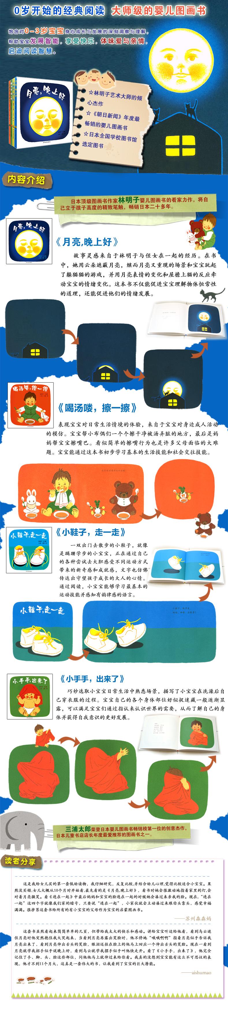 本书是“幼幼成长图画书”系列丛书的开山之作,精选畅销日本20年的经典婴儿图画书,面向0~3岁的,图书设计符合该年龄段宝宝的身心发展特点,能够帮助父母与孩子建立安全依恋关系。日本图画书作家林明子婴儿图画书的看家力作:《月亮,晚上好》《小手手,出来了》《小鞋子,走一走》《喝汤 喽,擦一擦》,在作品中,林明子那将自己立于孩子高度的精致笔触得到了淋漓尽致的呈现。