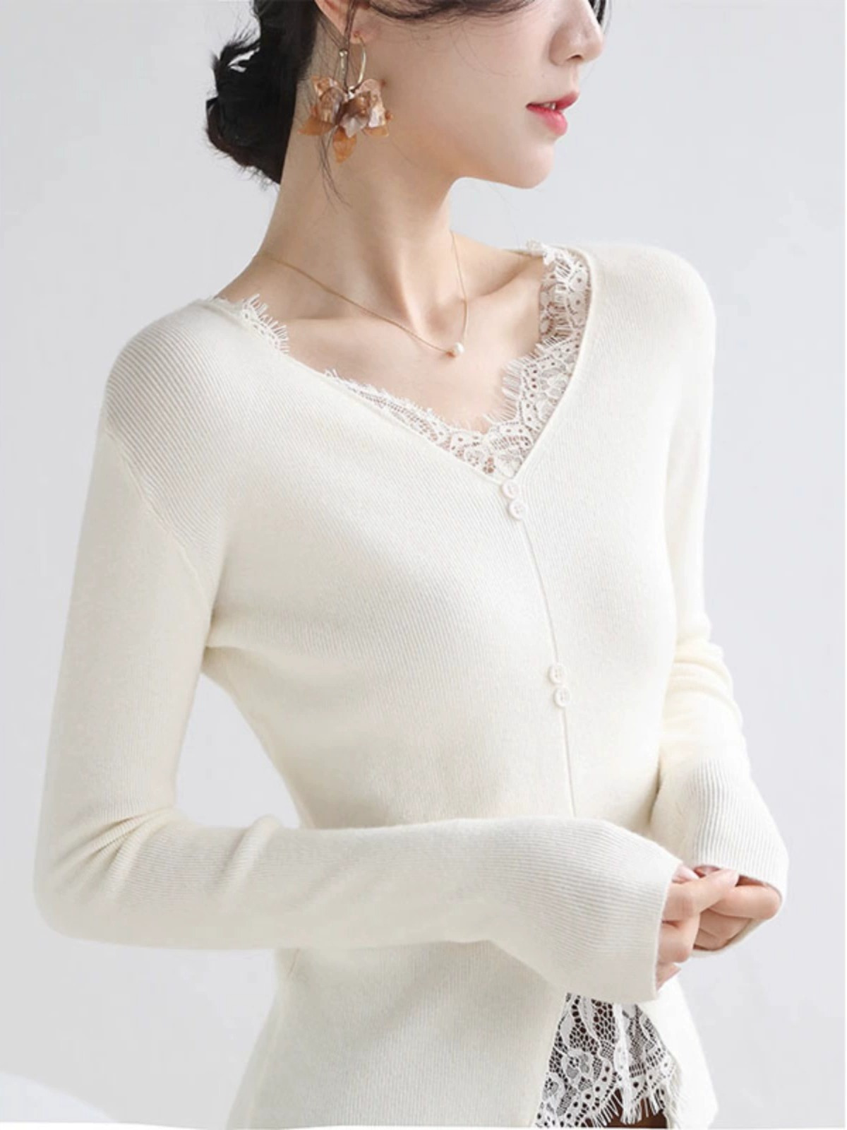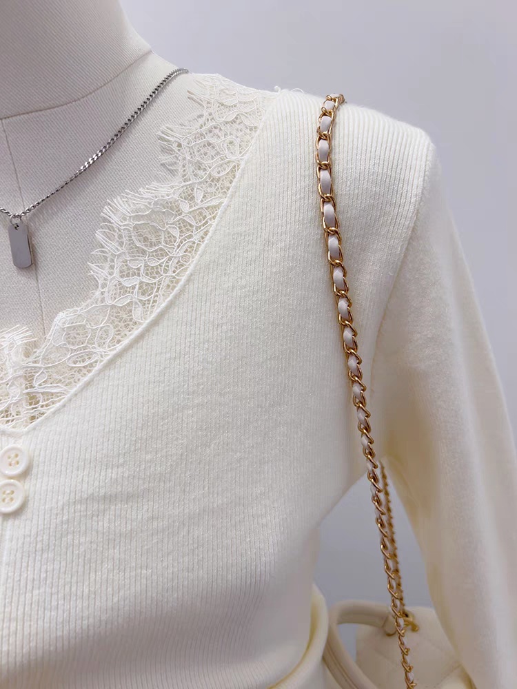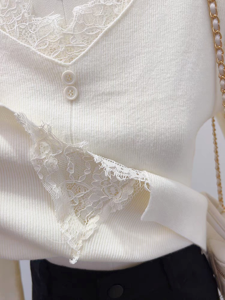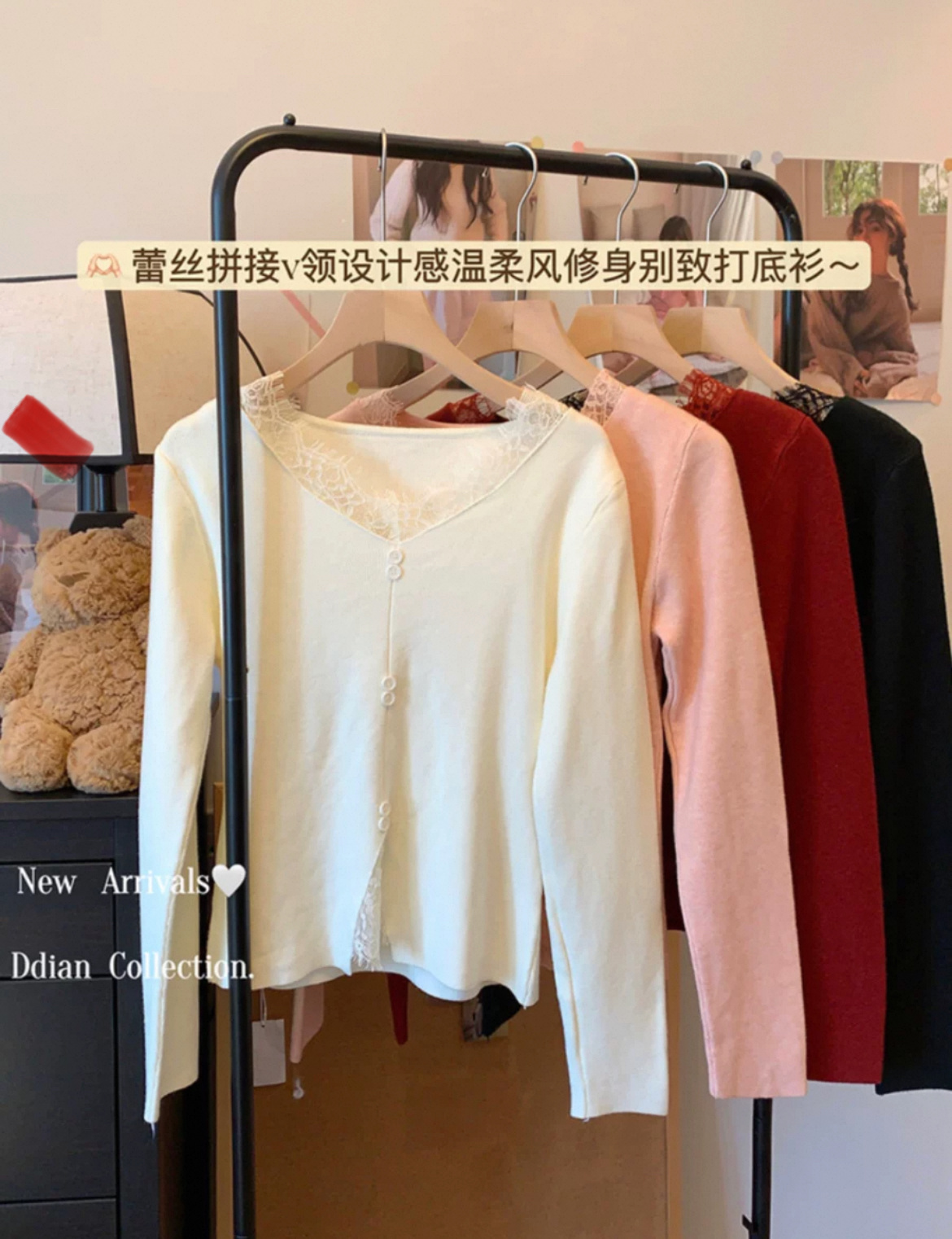 【意大利口樱西玛ENXIMANE·法式V领蕾丝拼接打底衫】今年蕾丝元素狠流行,巨纯欲迷人四单穿鲁穿都超级美!必买精致内搭!!法式蕾丝+合身廓形衬得人很温婉,螺纹针织面料,QQ弹弹舒适亲肤