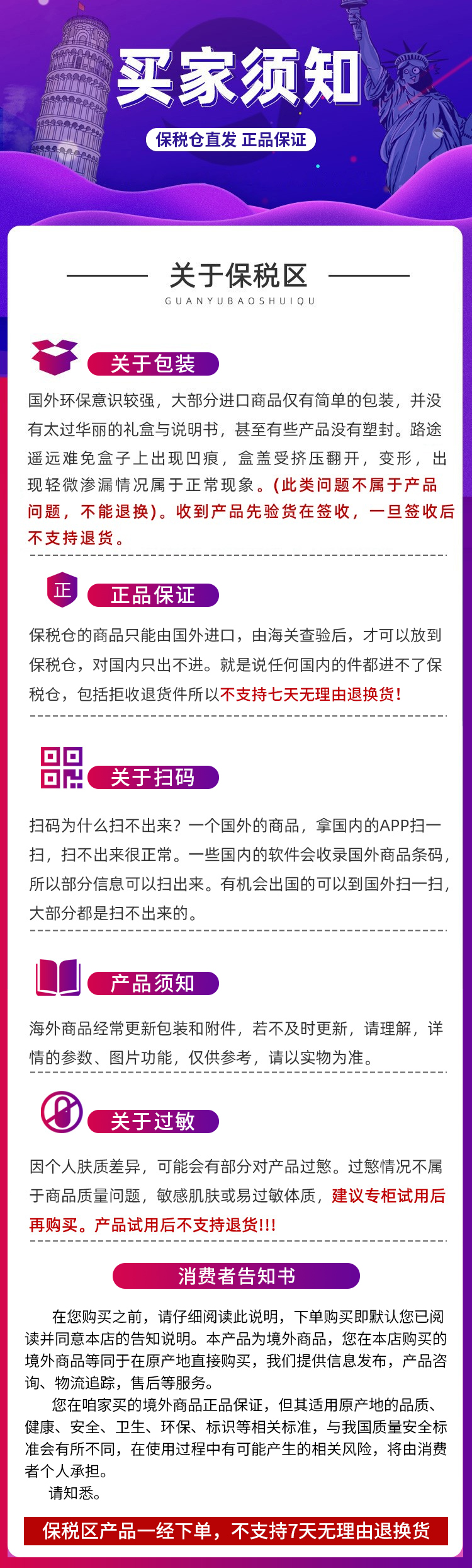 发货信息:全国包邮,新疆,内蒙古自治区,甘肃省,青海省,宁夏回族自治区,西藏自治区加18元。圆通/韵达发货,不接受指定,统一由保税区发出。