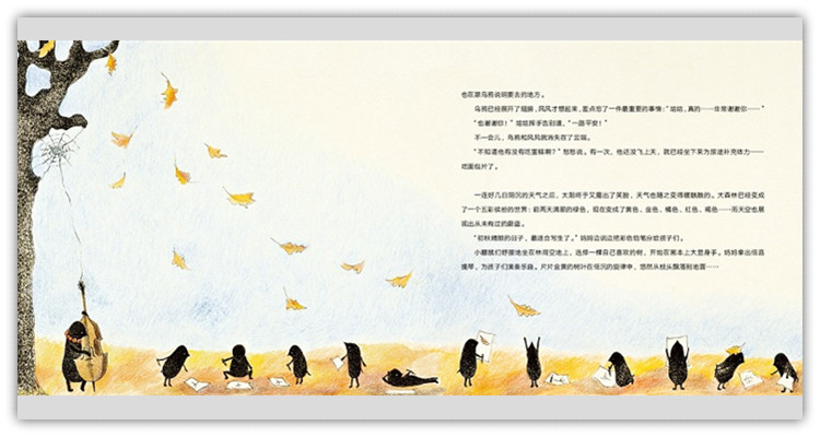 小鼹鼠们舒服地坐在林间空地上,选择一棵自己喜欢的树,开始在画本上大显身手。妈妈拿出低音提琴,为孩子们演奏乐曲。片片金黄的树叶在低沉的旋律中,悠然从枝头飘落到地面……