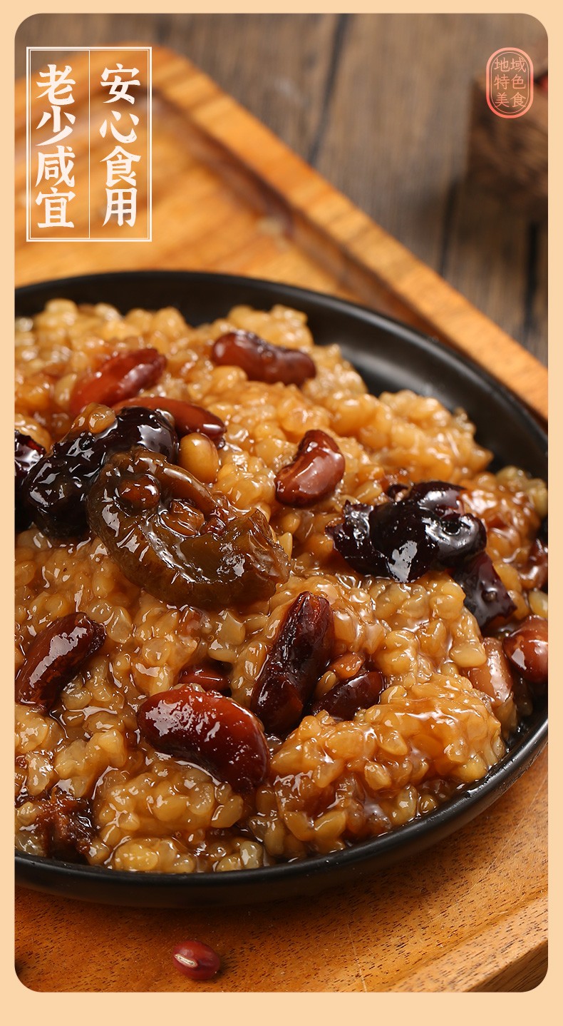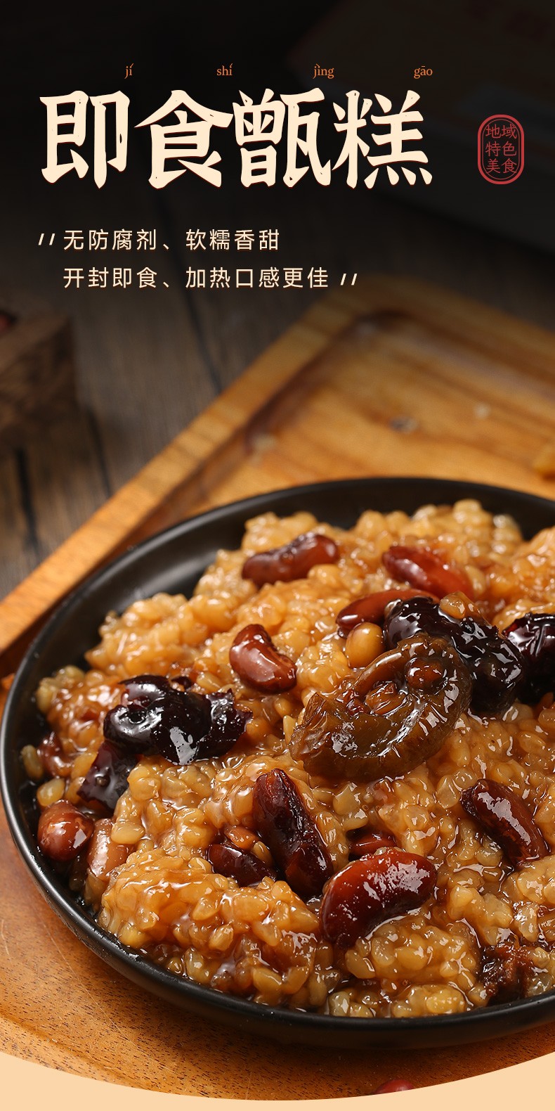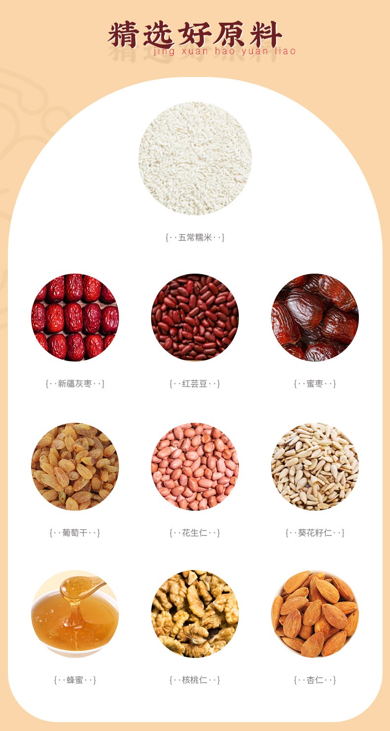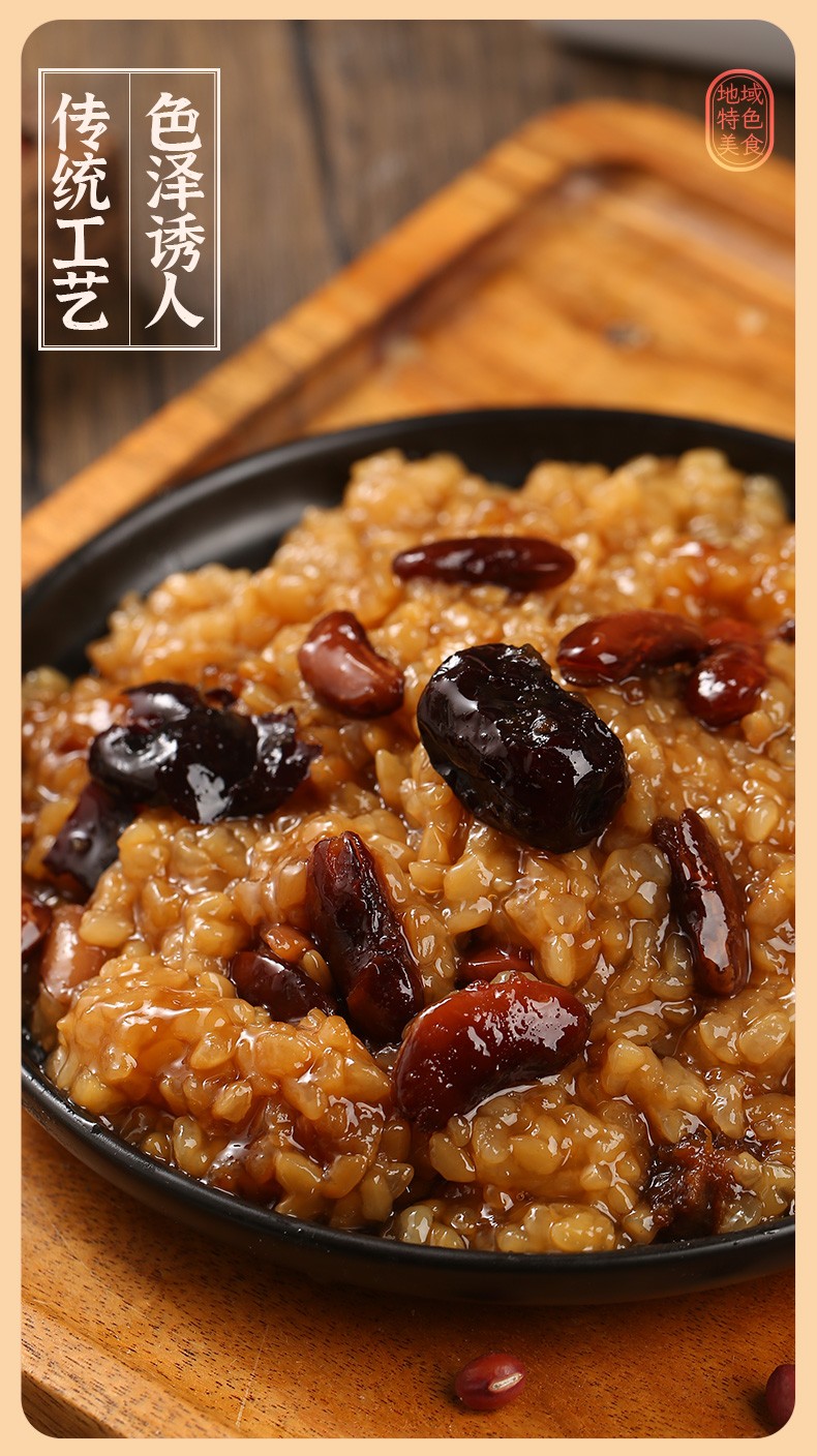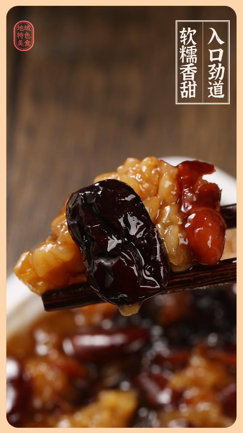 这次的即食甑糕,有分两种口味,都是有一些些改良的哦!红枣味原料主要是糯米、蜜枣、红枣、红芸豆、葡萄干。阳坡糯米色泽白而有光泽、吃起来又香又劲道;其他配料也坚持传统手工筛选,健康饱满,可以放心吃。而八宝口味,是在此基础上,添加了花生仁、葵花籽仁、核桃仁和杏仁,口感更加丰富,营养价值也更高一些。