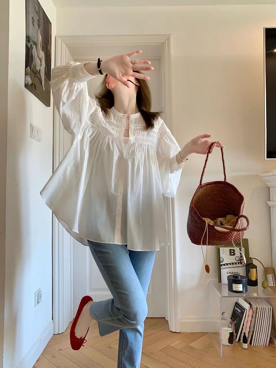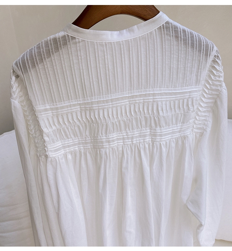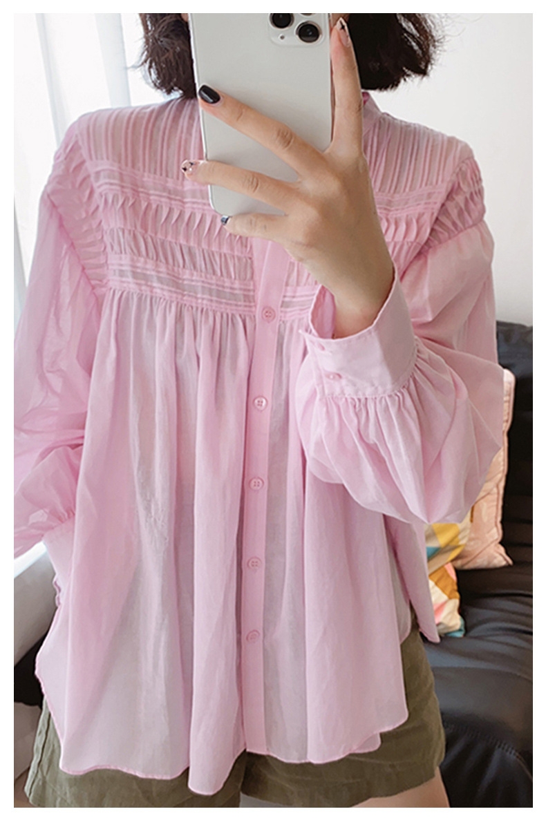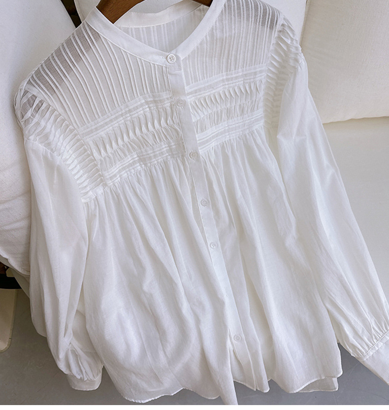宽松小立领娃娃衫风琴褶长袖衬衫,法式风琴褶,高ji优雅~