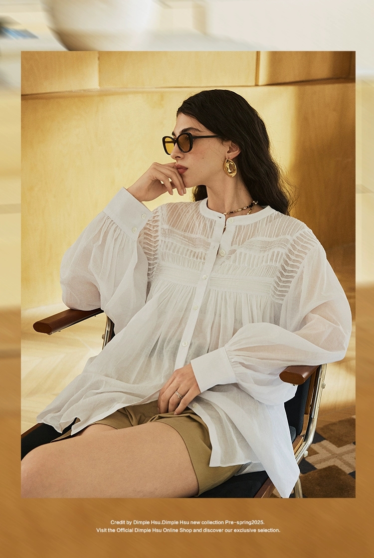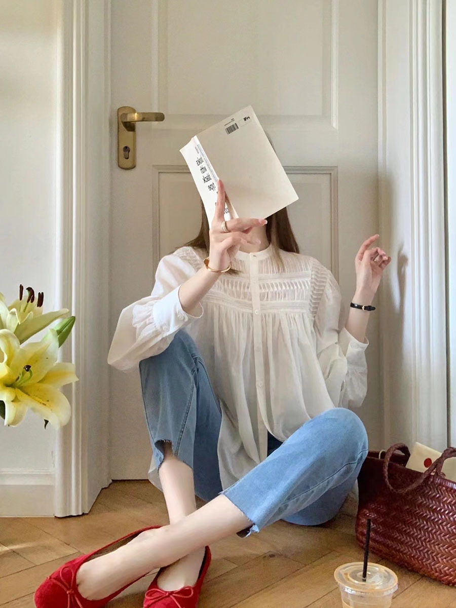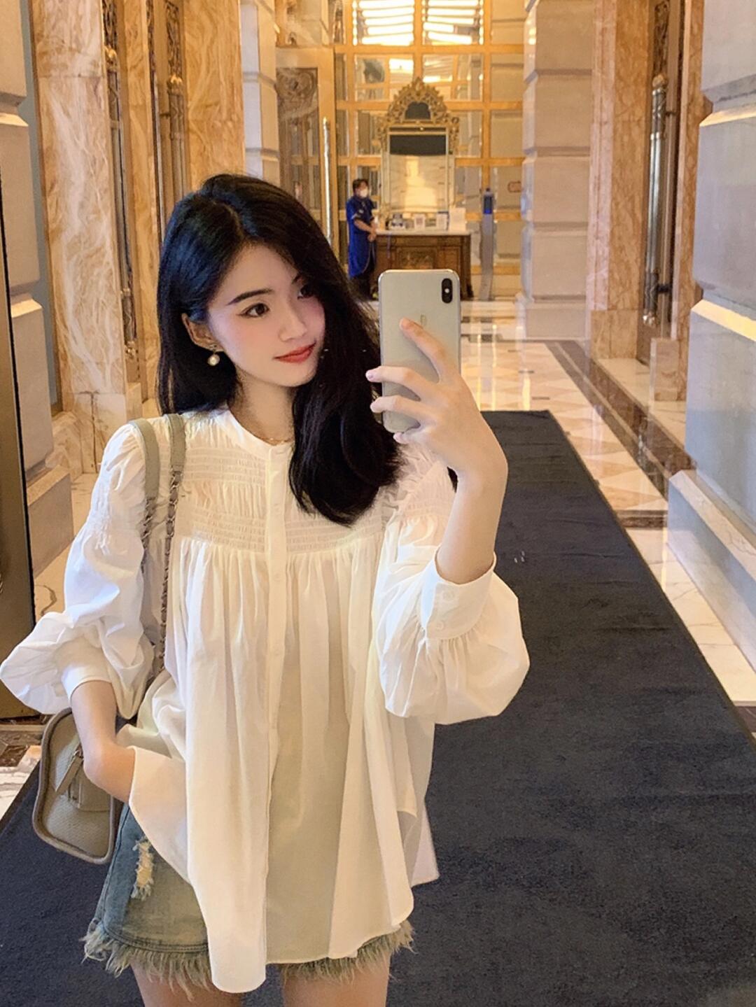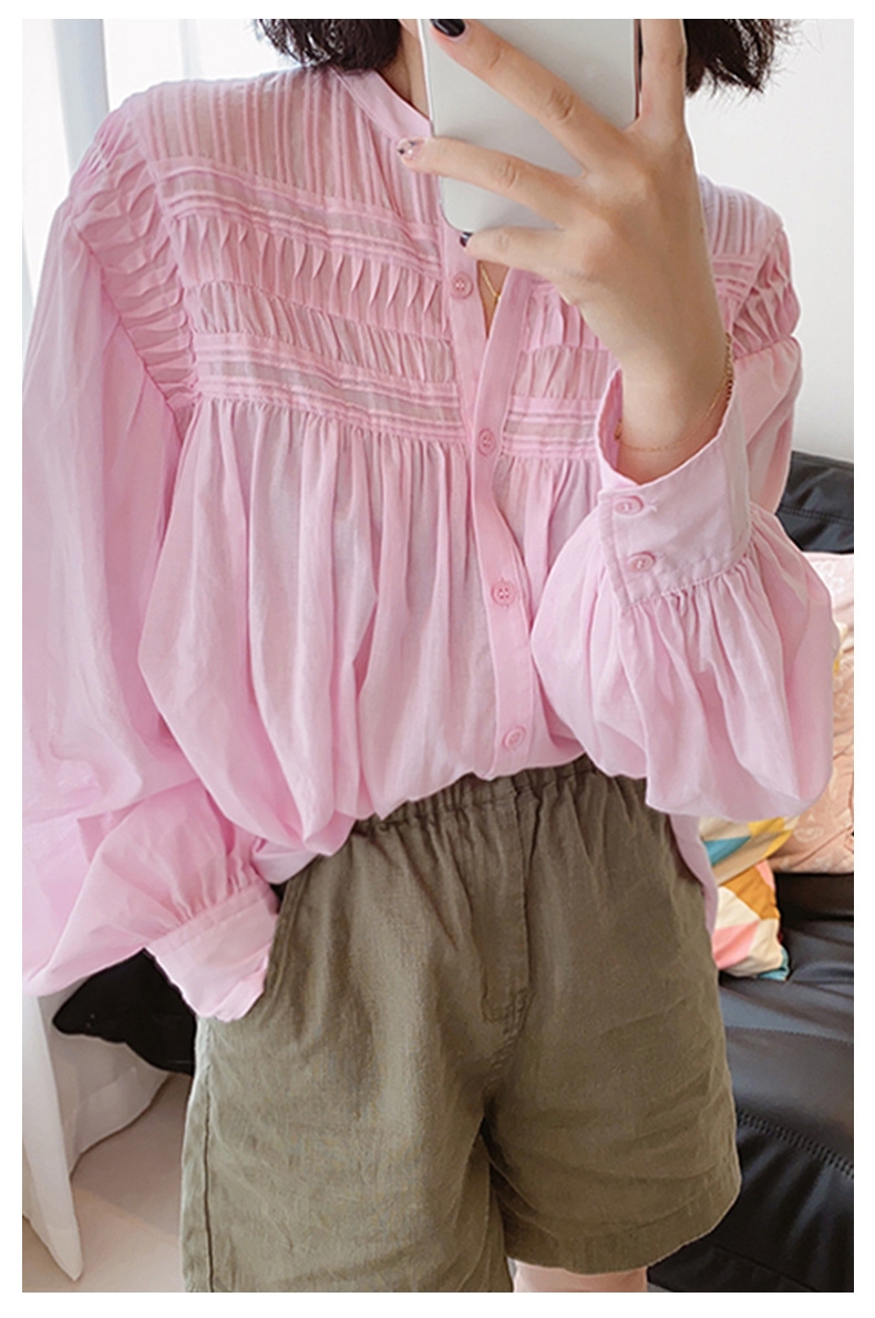 宽松小立领娃娃衫风琴褶长袖衬衫,法式风琴褶,高ji优雅~