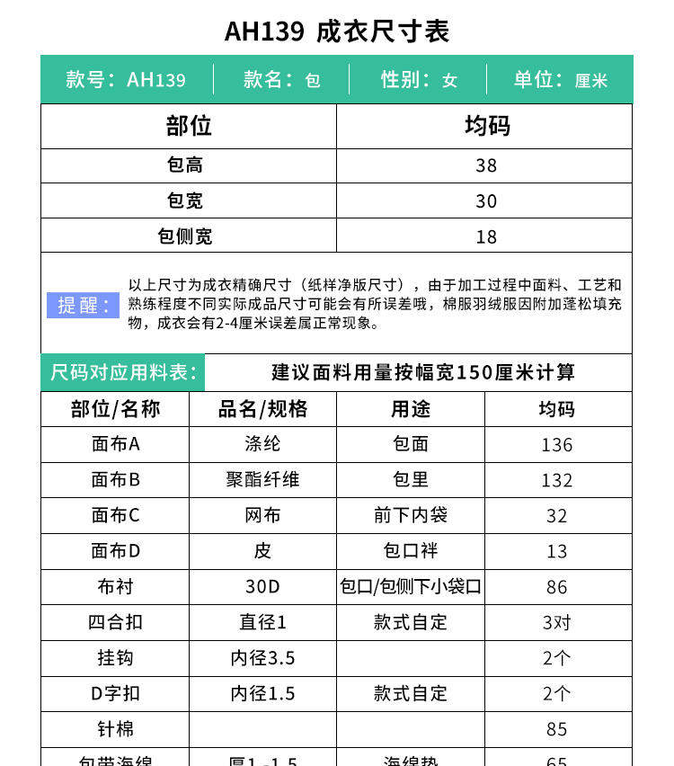 裁缝学苑AH139妈咪包大容量双肩包纸样女装多功能背包新款纸样