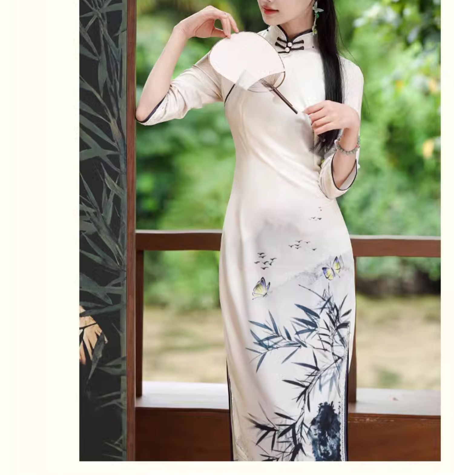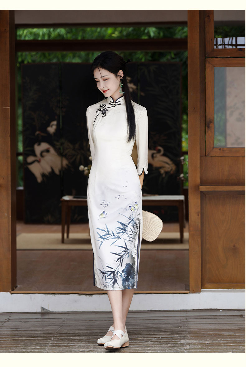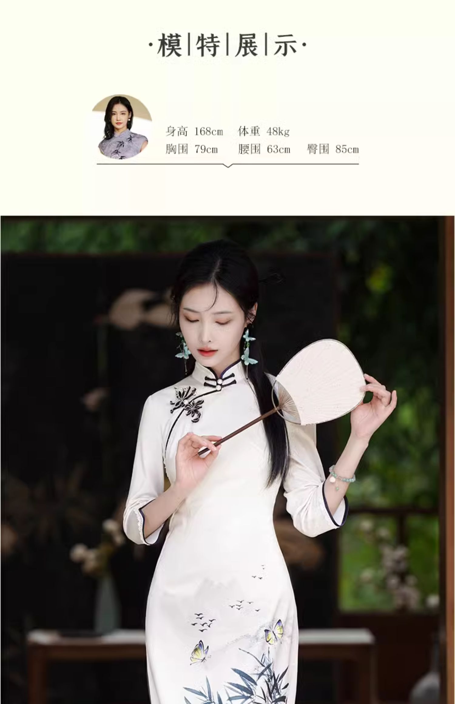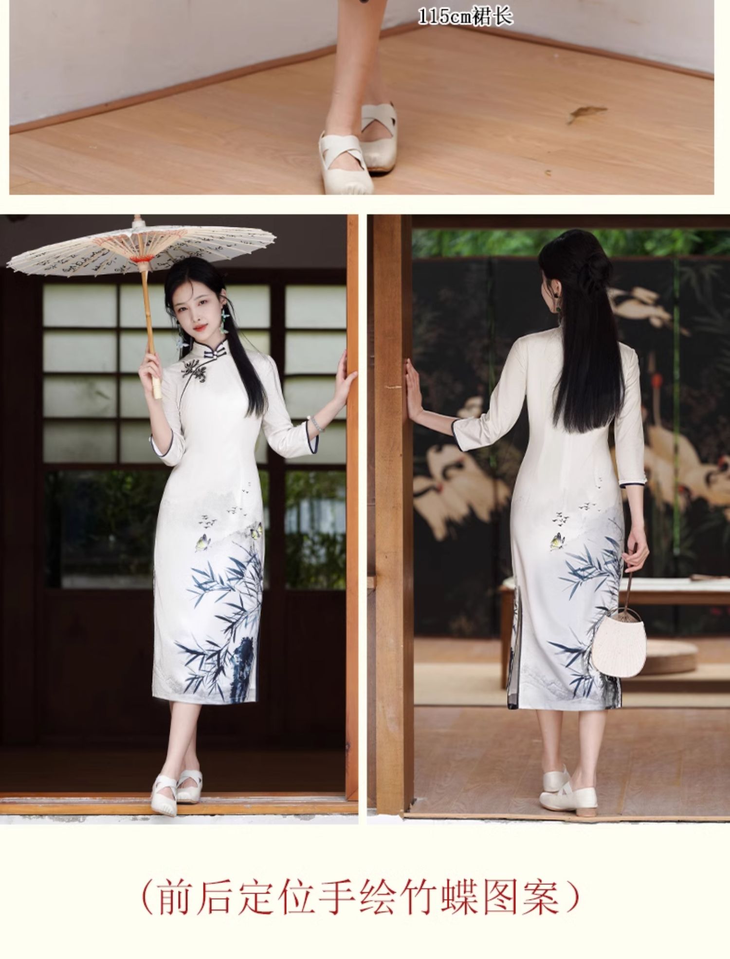 上海逸红颜筠蝶2025年春装新品醋酸针织手绘竹蝶图中袖旗袍