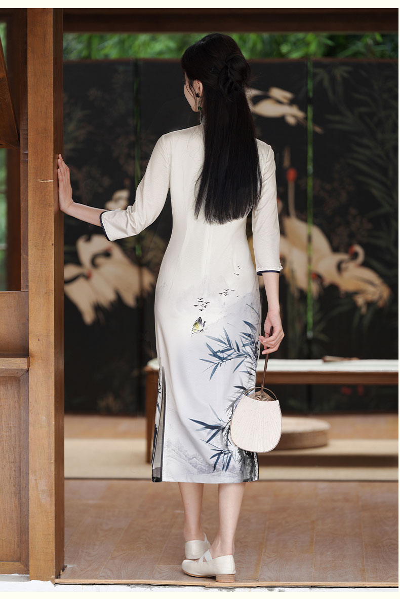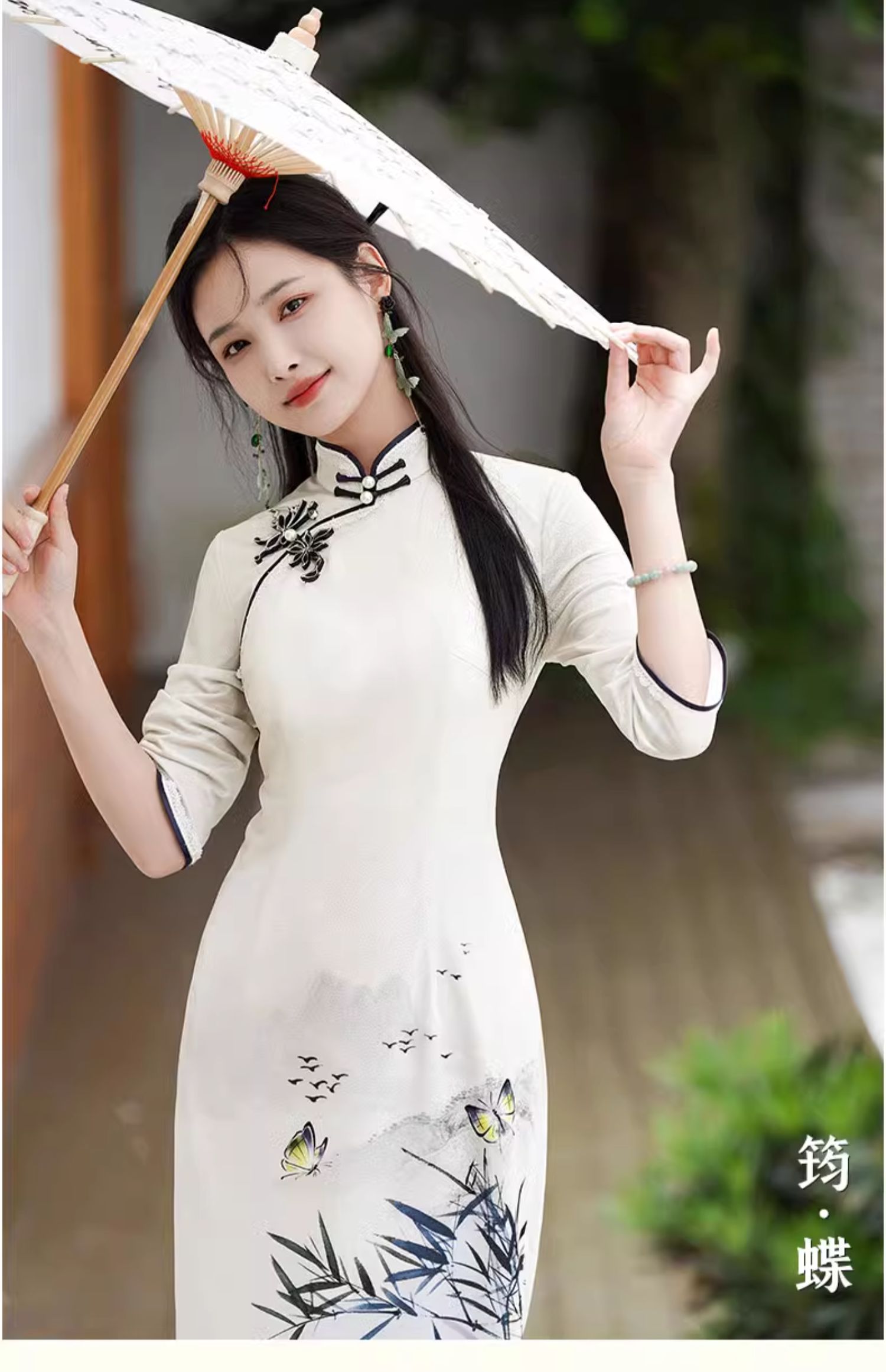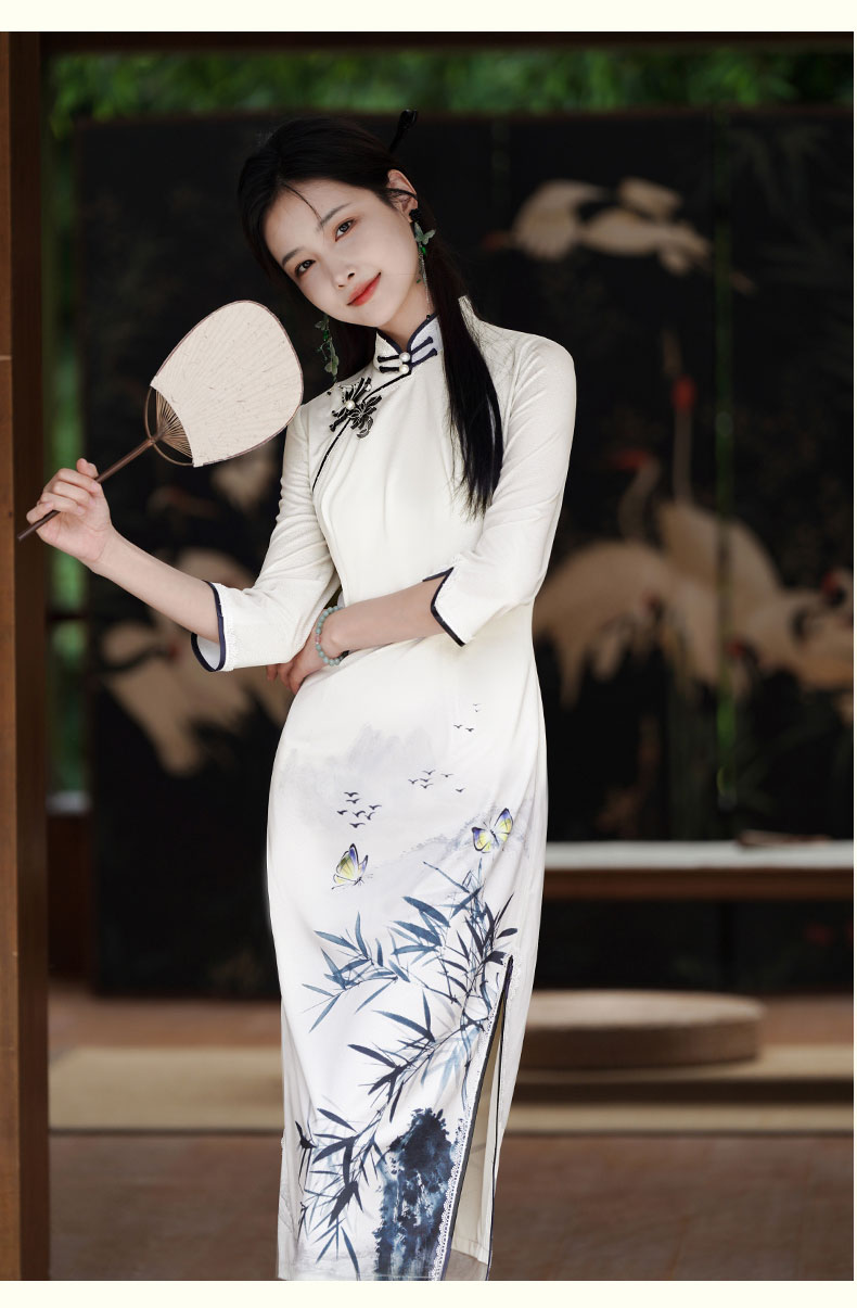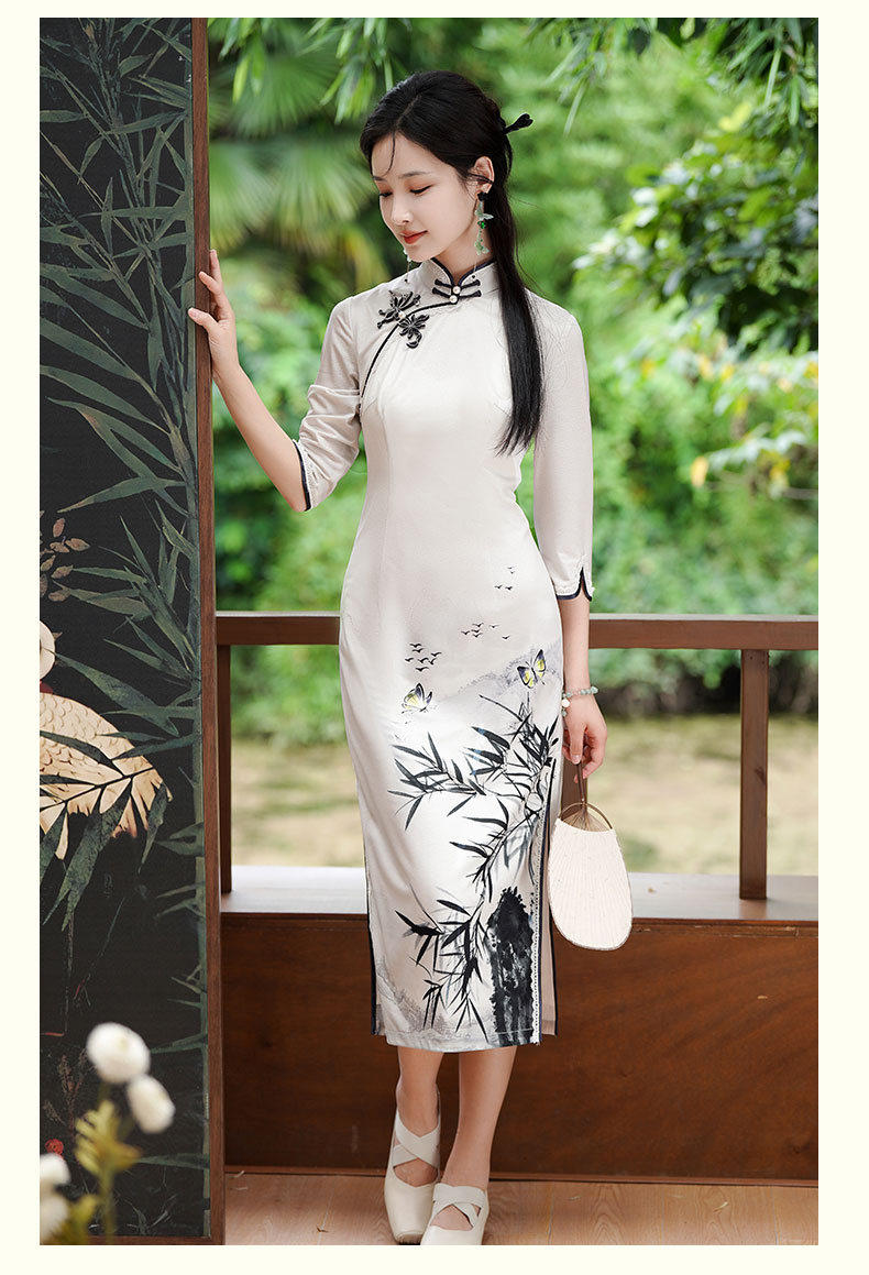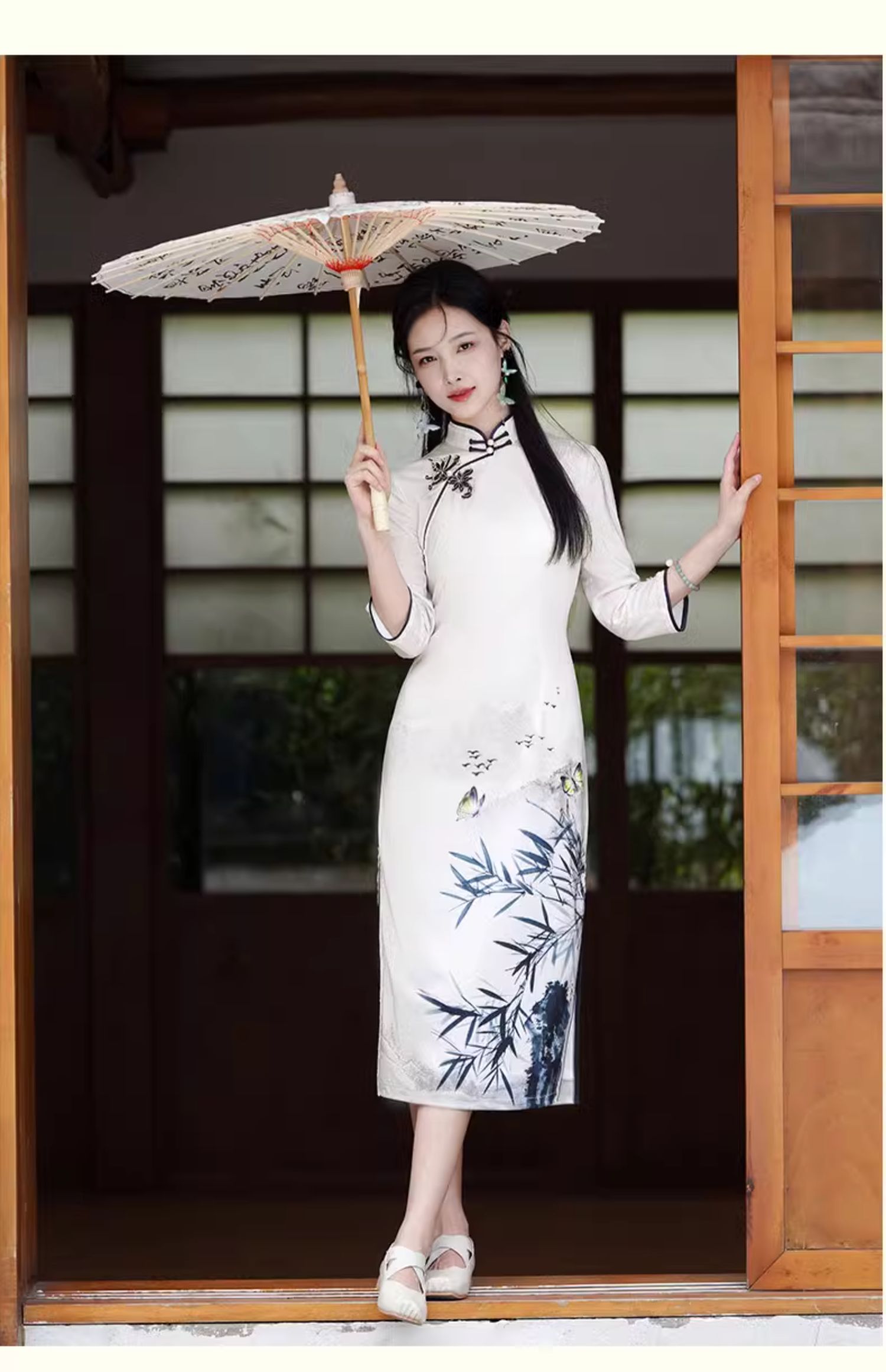 上海逸红颜筠蝶2025年春装新品醋酸针织手绘竹蝶图中袖旗袍