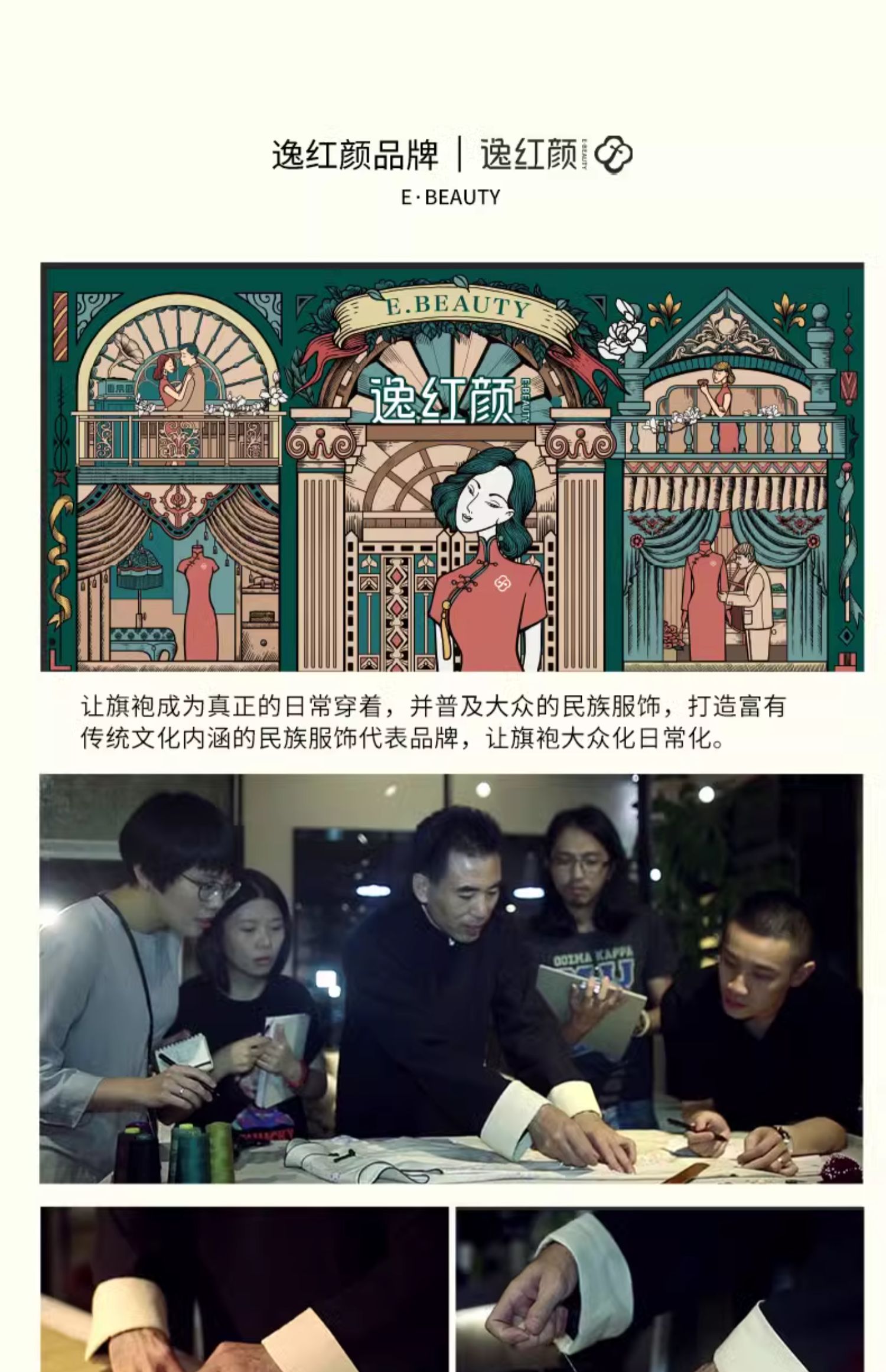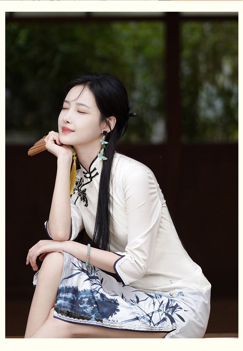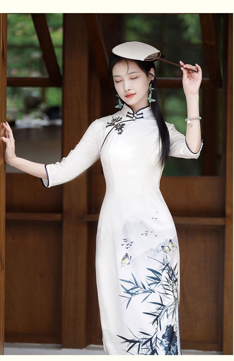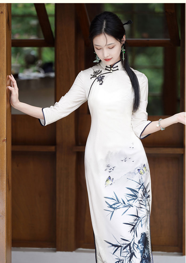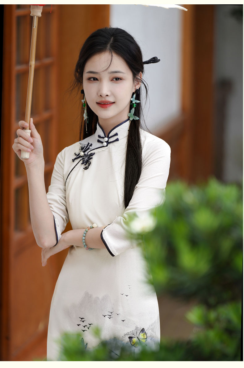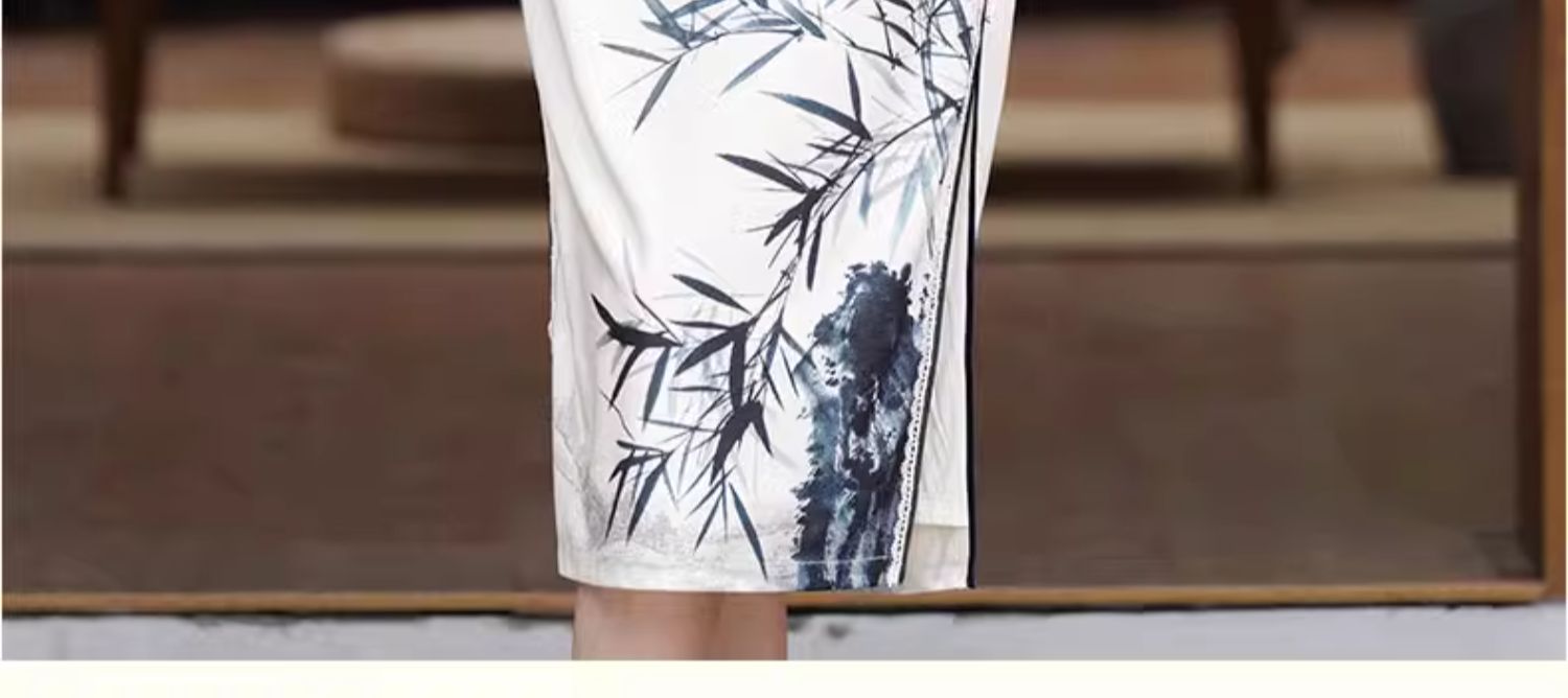 上海逸红颜筠蝶2025年春装新品醋酸针织手绘竹蝶图中袖旗袍