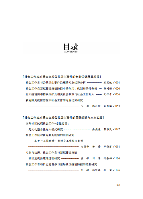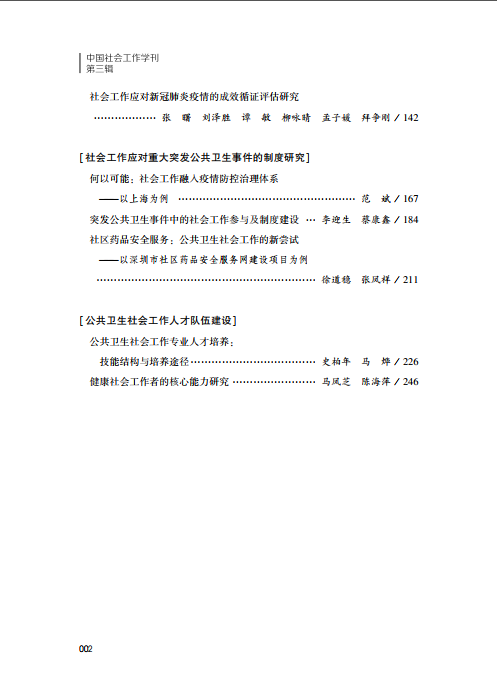 本书由中国社会工作学会组织编写,书稿主编是学会会长王思斌,各篇文章作者是社会工作领域各行业的专家学者,所著文章是社会工作领域的最新研究成果。本书分为社会工作参与公共卫生事件治理的专业优势分析,公共卫生社会工作人才培养(技能结构与培养途径),健康社会工作者的核心能力界定,社会工作融入疫情防控,重大疫情困难群众保护及相关社会政策和社会工作介入,基于五社联动的社会工作服务案例,国际社区抗疫志愿项目:整合性社会工作行动经验、社会工作在新冠病毒疫情防控中的作用、机制和条件分析,社会工作参与新冠肺炎疫情社区危机治理的过程研究,社会工作应对新冠疫情的成效循证评估研究,社区药品安全服务:公共卫生社会工作的新尝试,疫情防控中社会工作的专业优势研究,社会工作者动员志愿者参与基层社区疫情防控的经验研究。