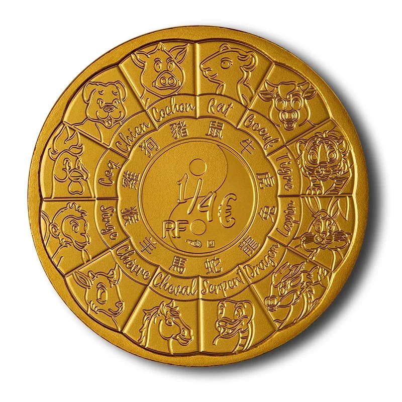 背面图案借鉴了中国传统的天干地支和八卦阴阳的元素,融入十二生肖、法语、繁体中文,中间是1/4欧元符号以及法兰西共和国RF的标志。