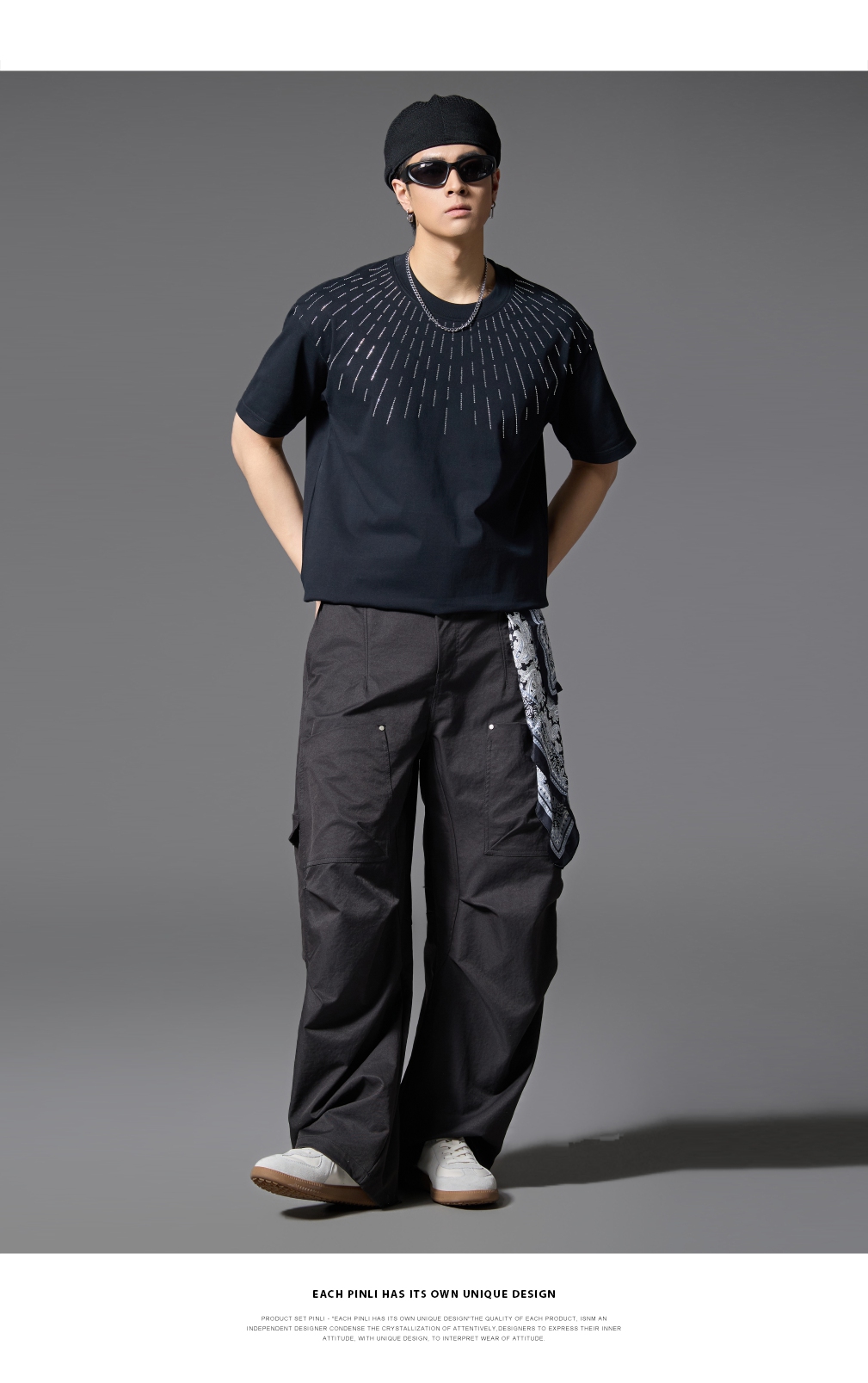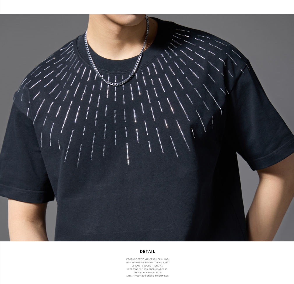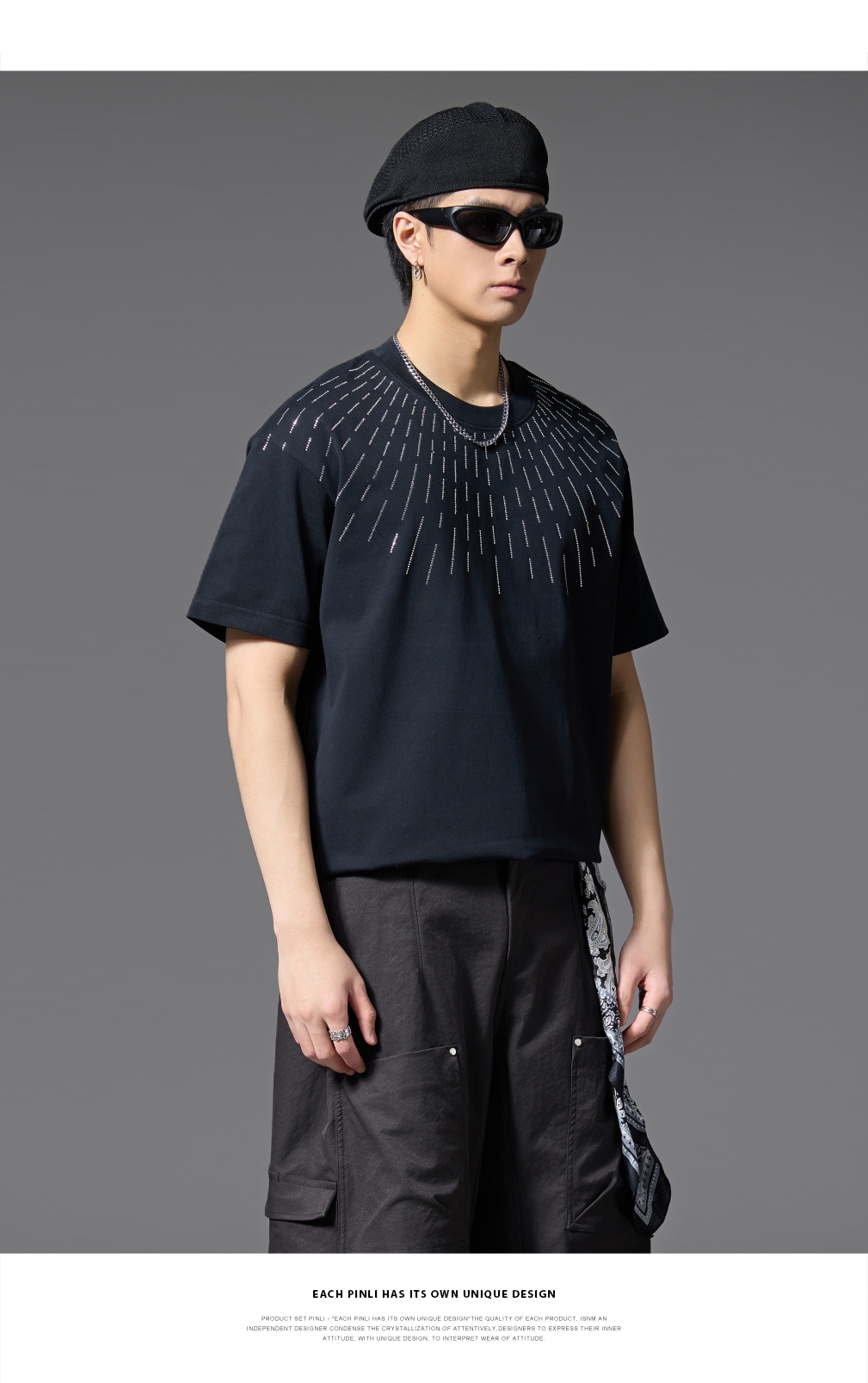 PINLI品立2025春夏新款烫钻休闲短袖T恤男宽松重磅纯棉潮牌体恤衫BG252111011