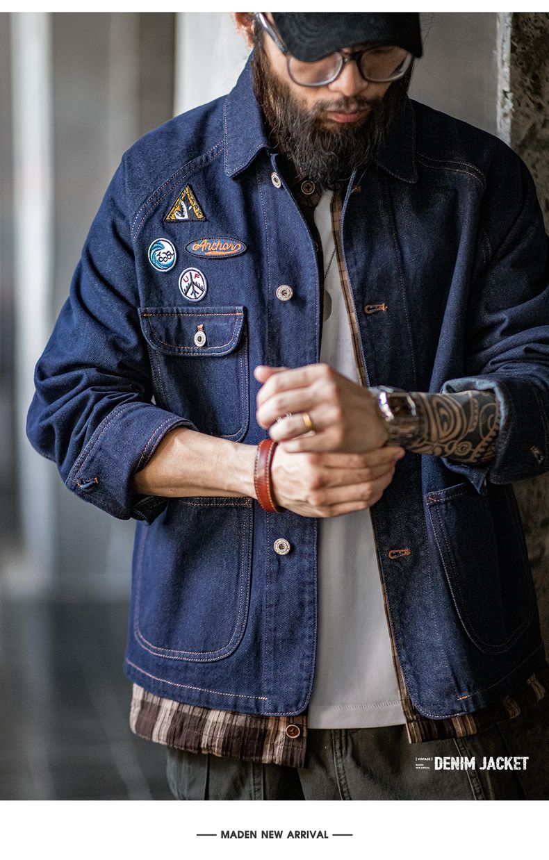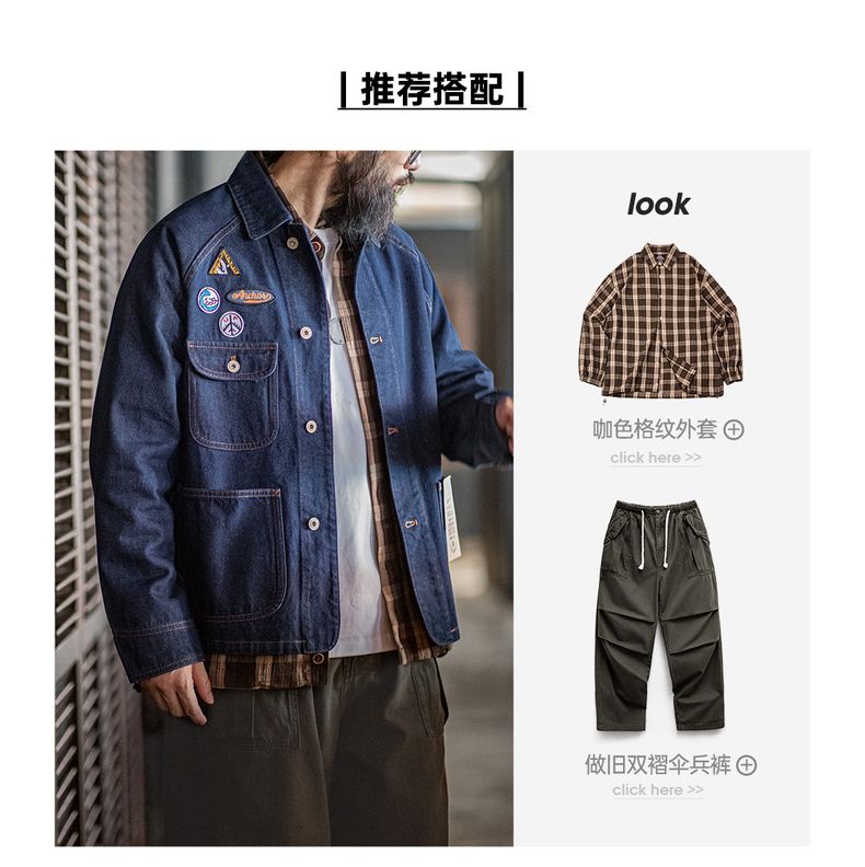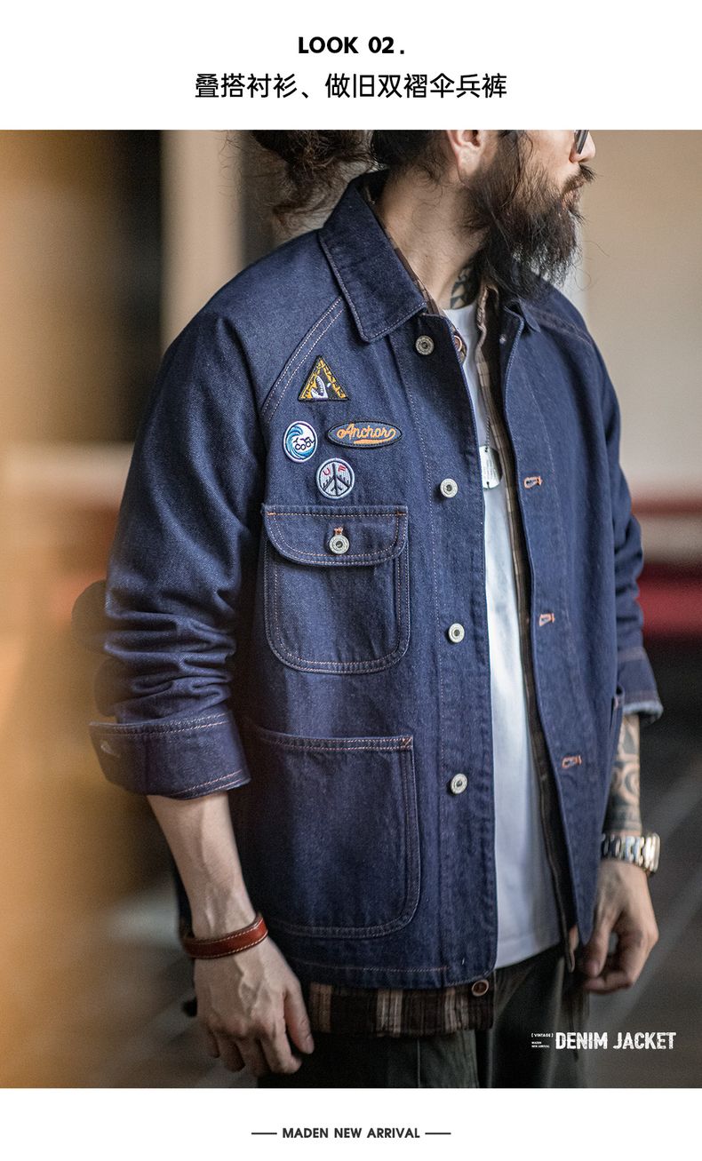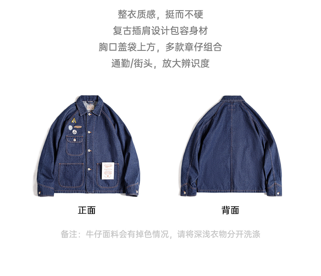 工装优选美式复古刺绣徽章牛仔夹克重磅水洗翻领休闲外套男秋冬季
