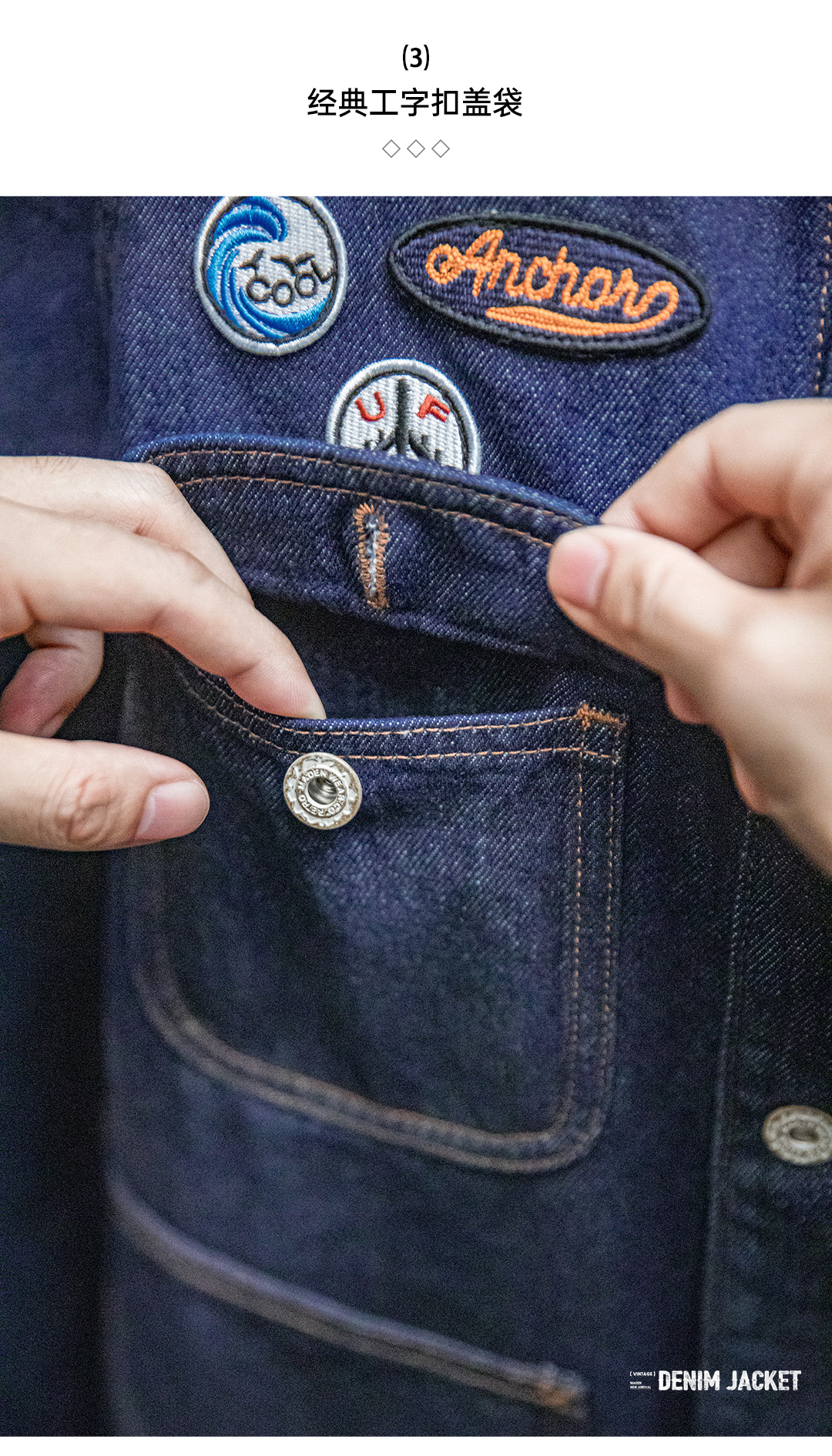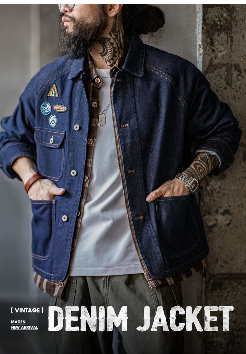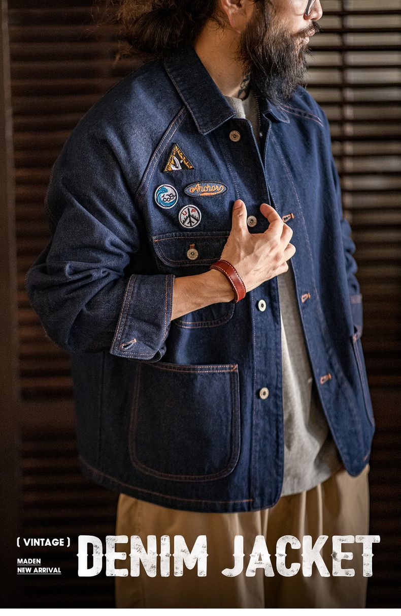 工装优选美式复古刺绣徽章牛仔夹克重磅水洗翻领休闲外套男秋冬季