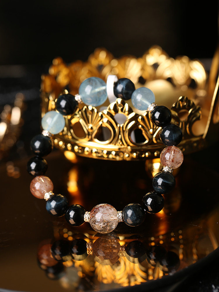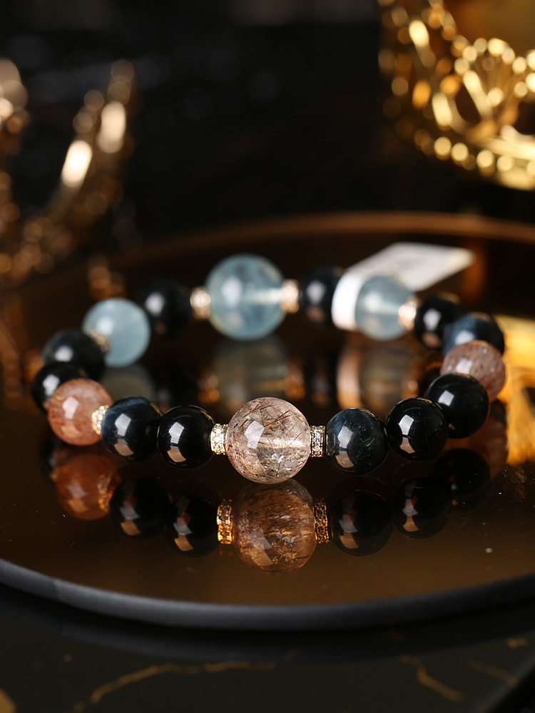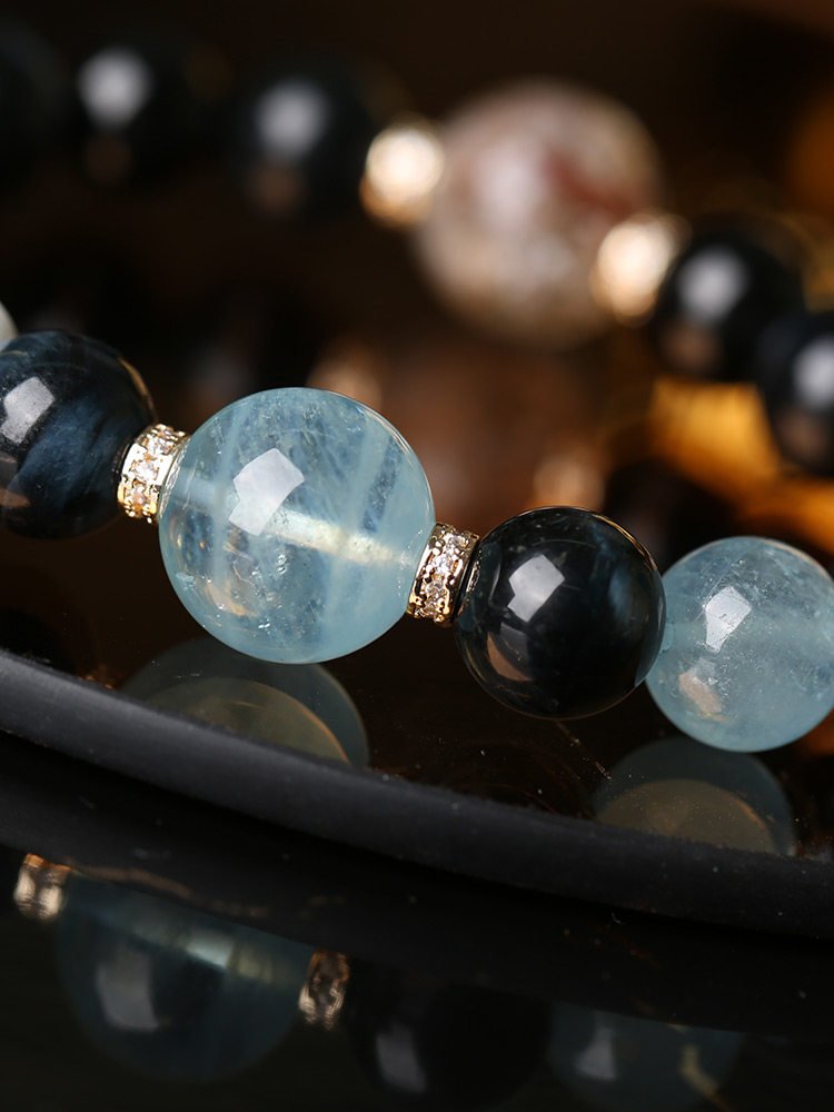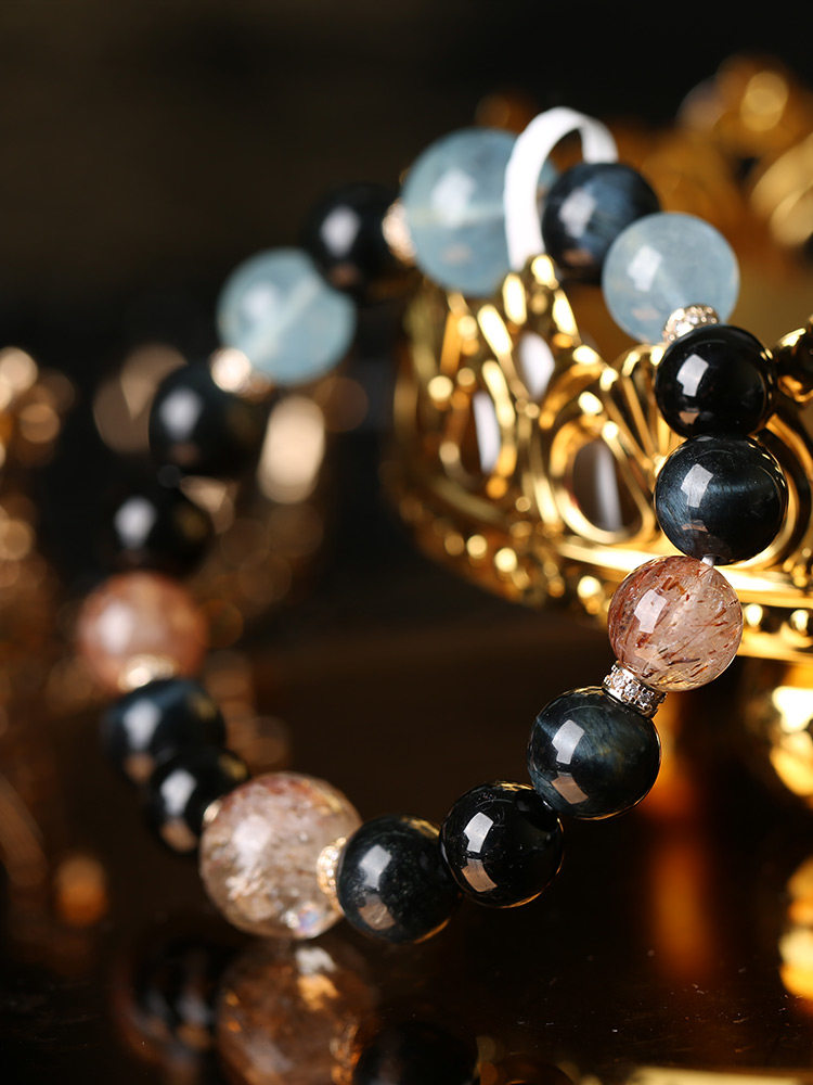【祈愿吉品】海蓝宝手链蓝虎眼黑金超七黑碧玺水晶手链女款