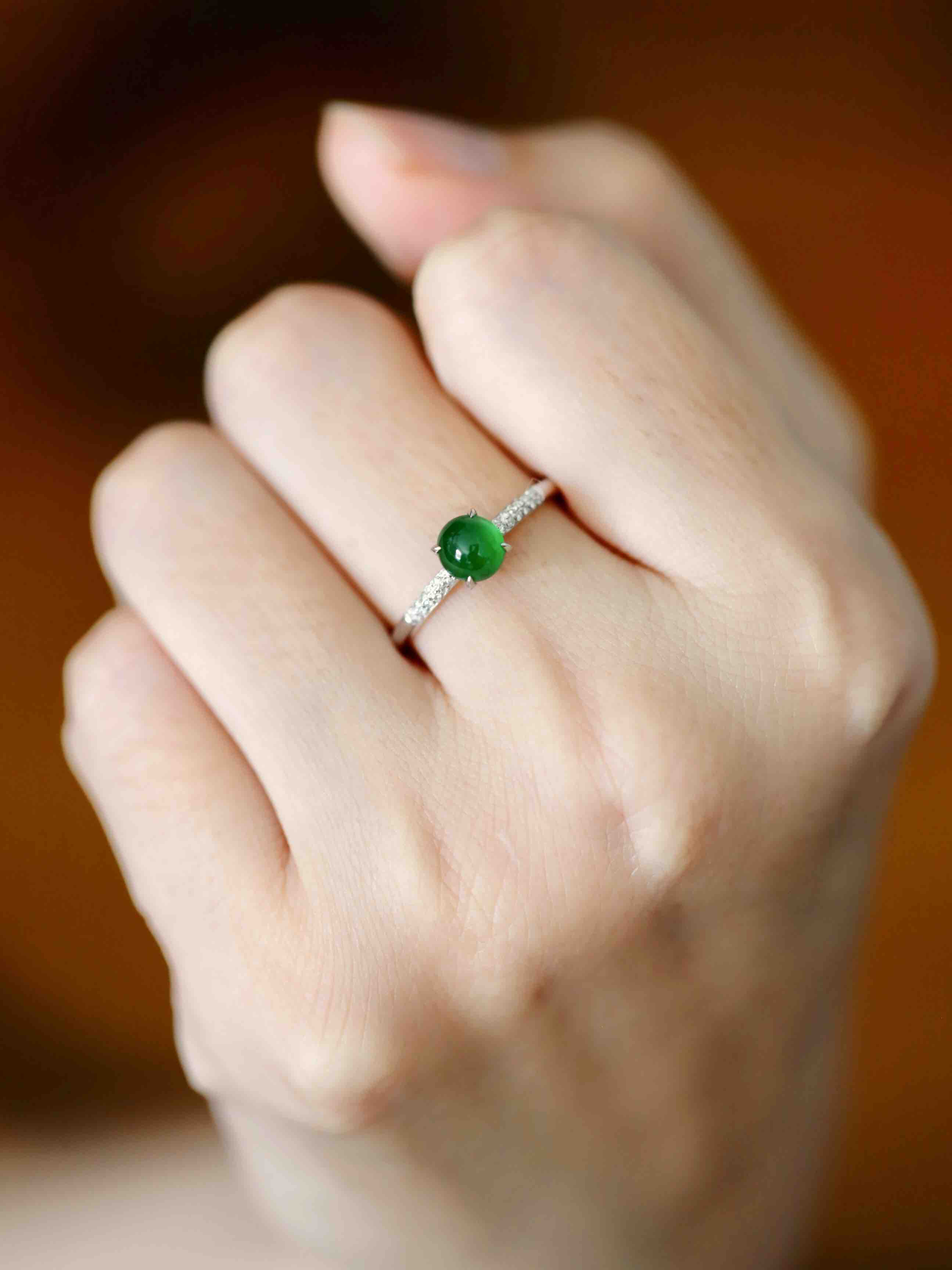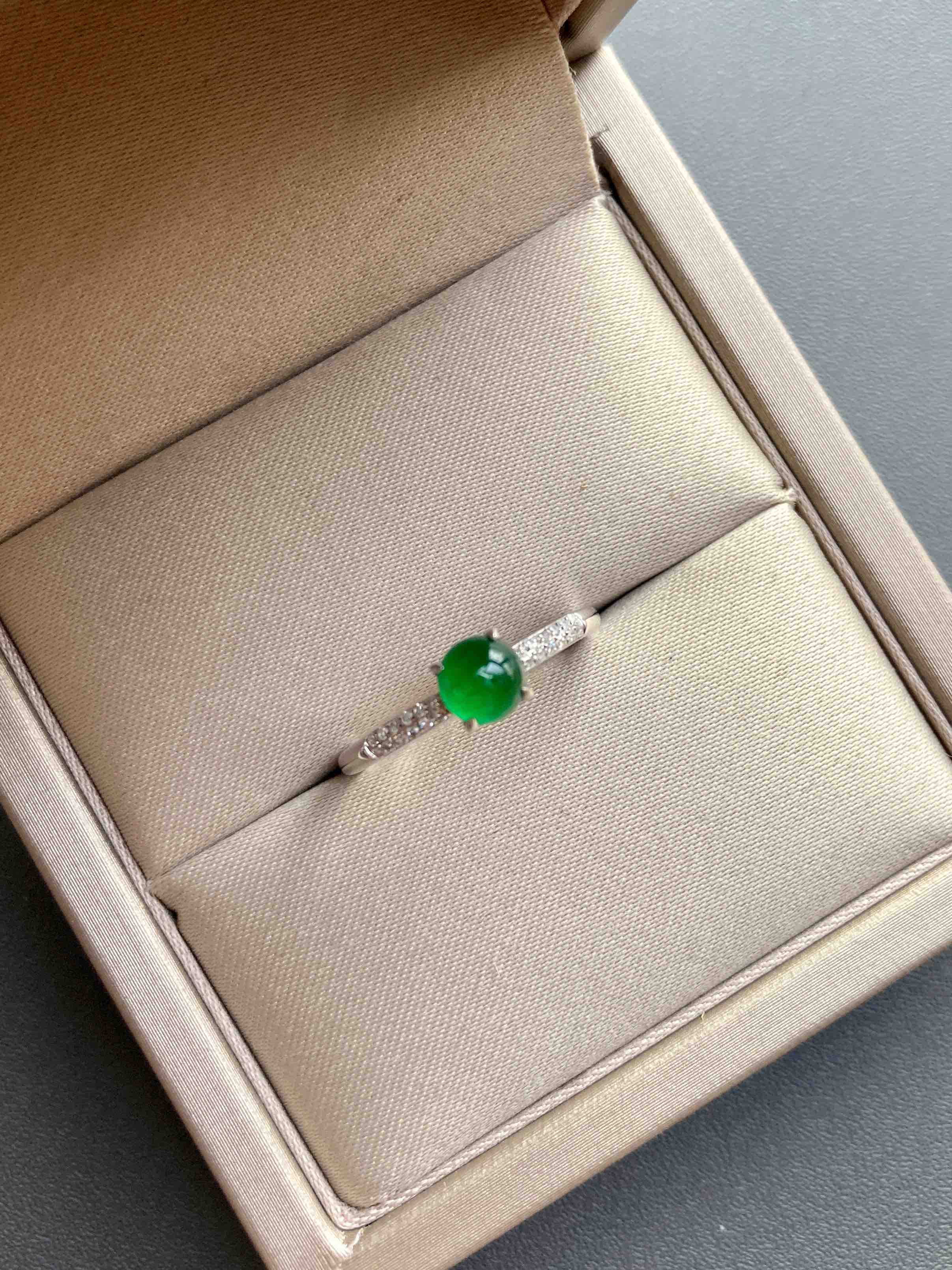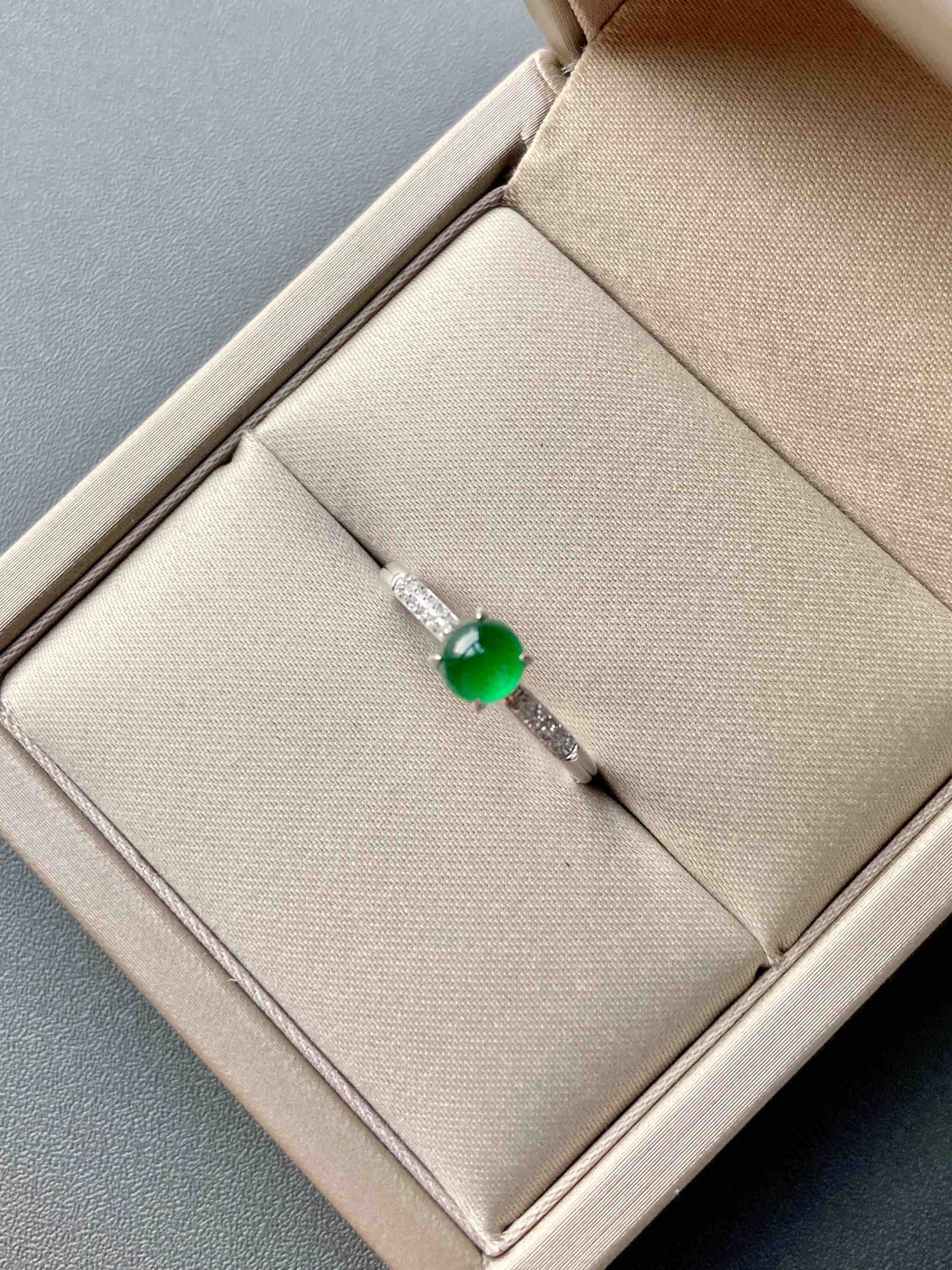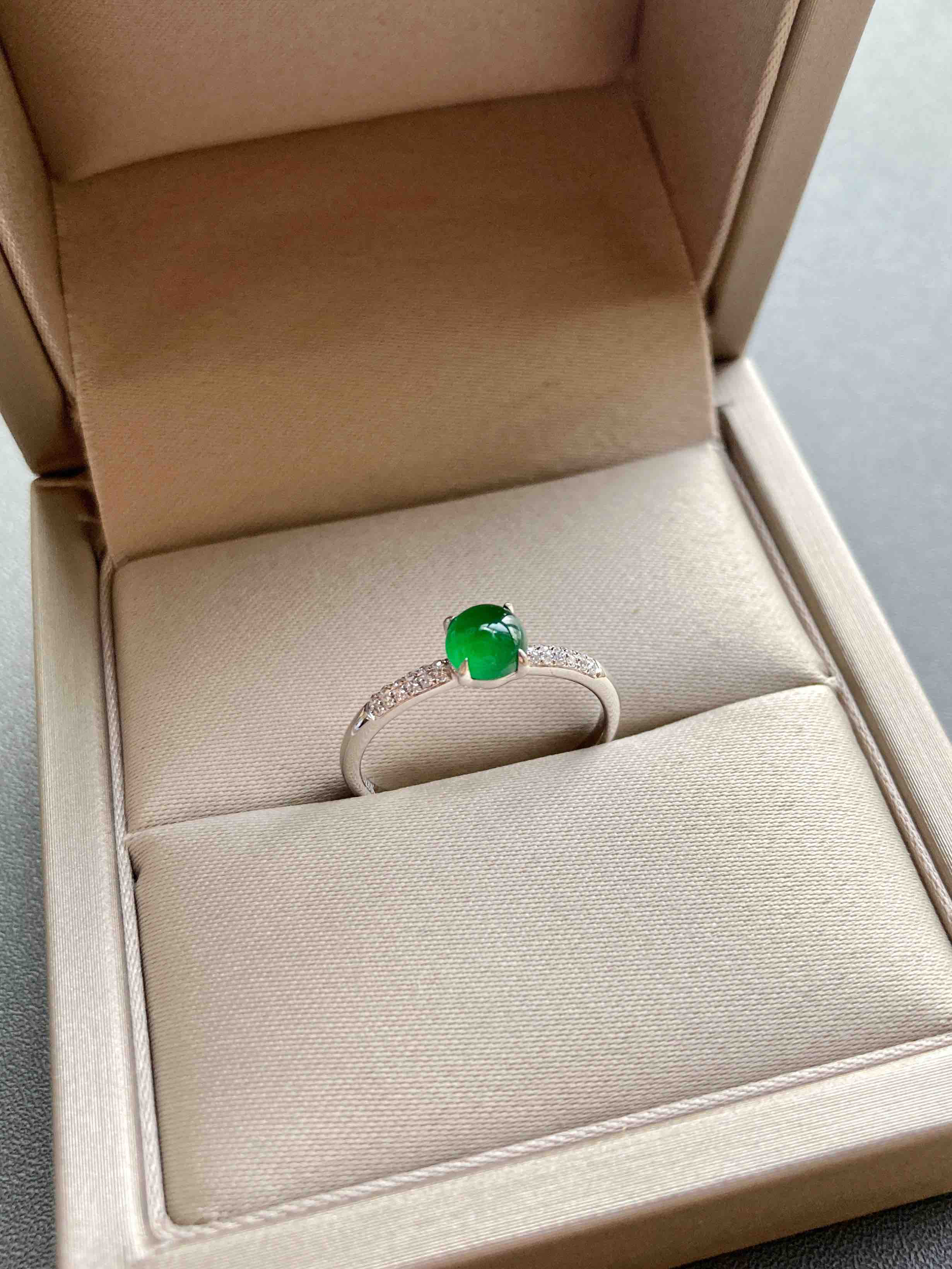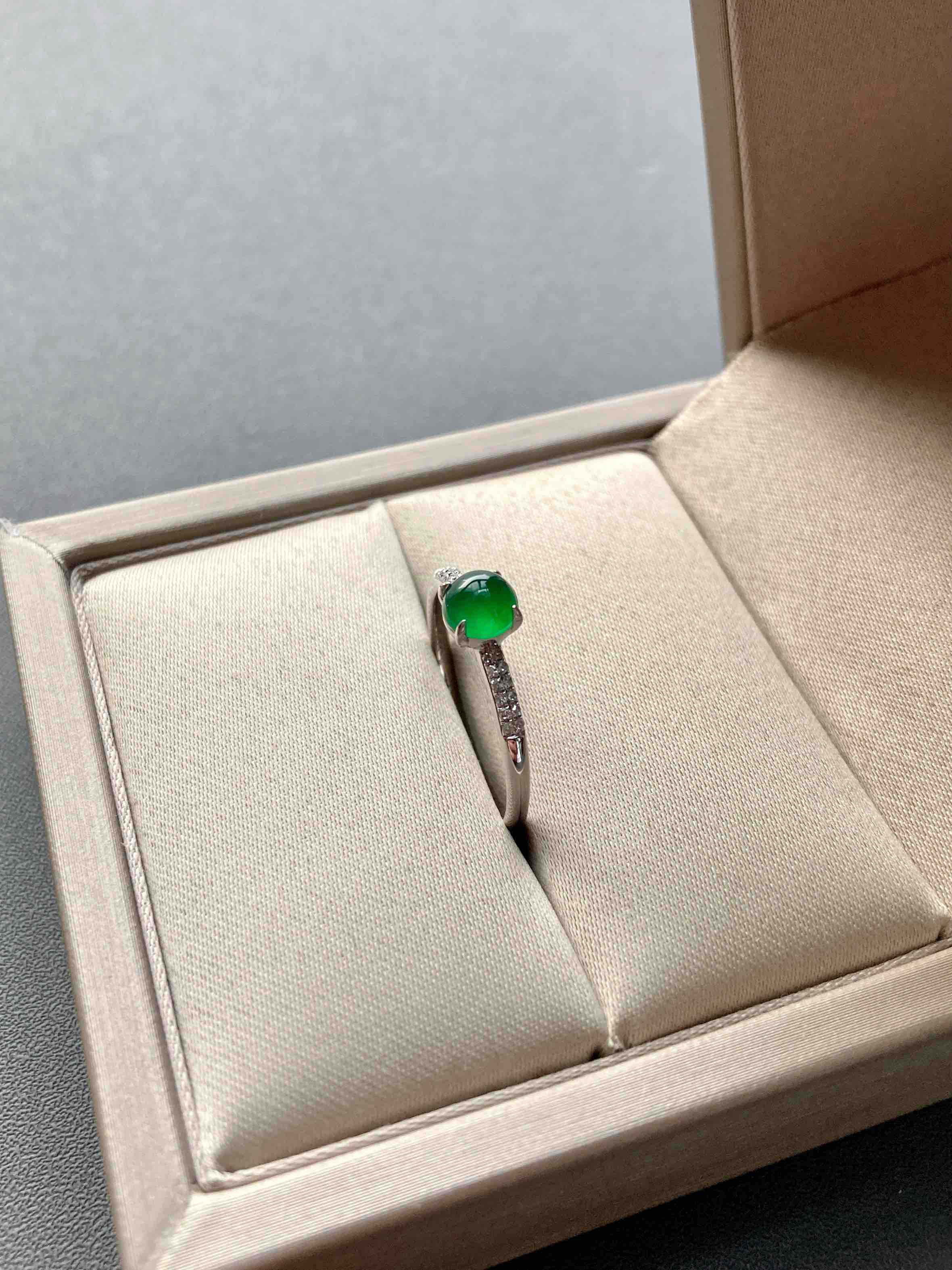 高冰种阳绿翡翠蛋面戒指18k白金钻石镶嵌