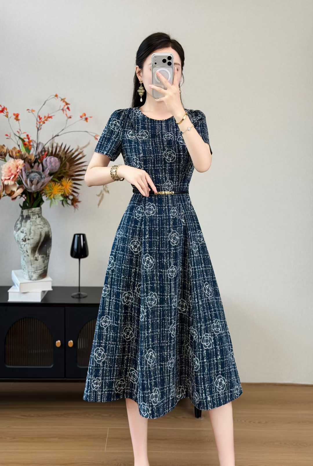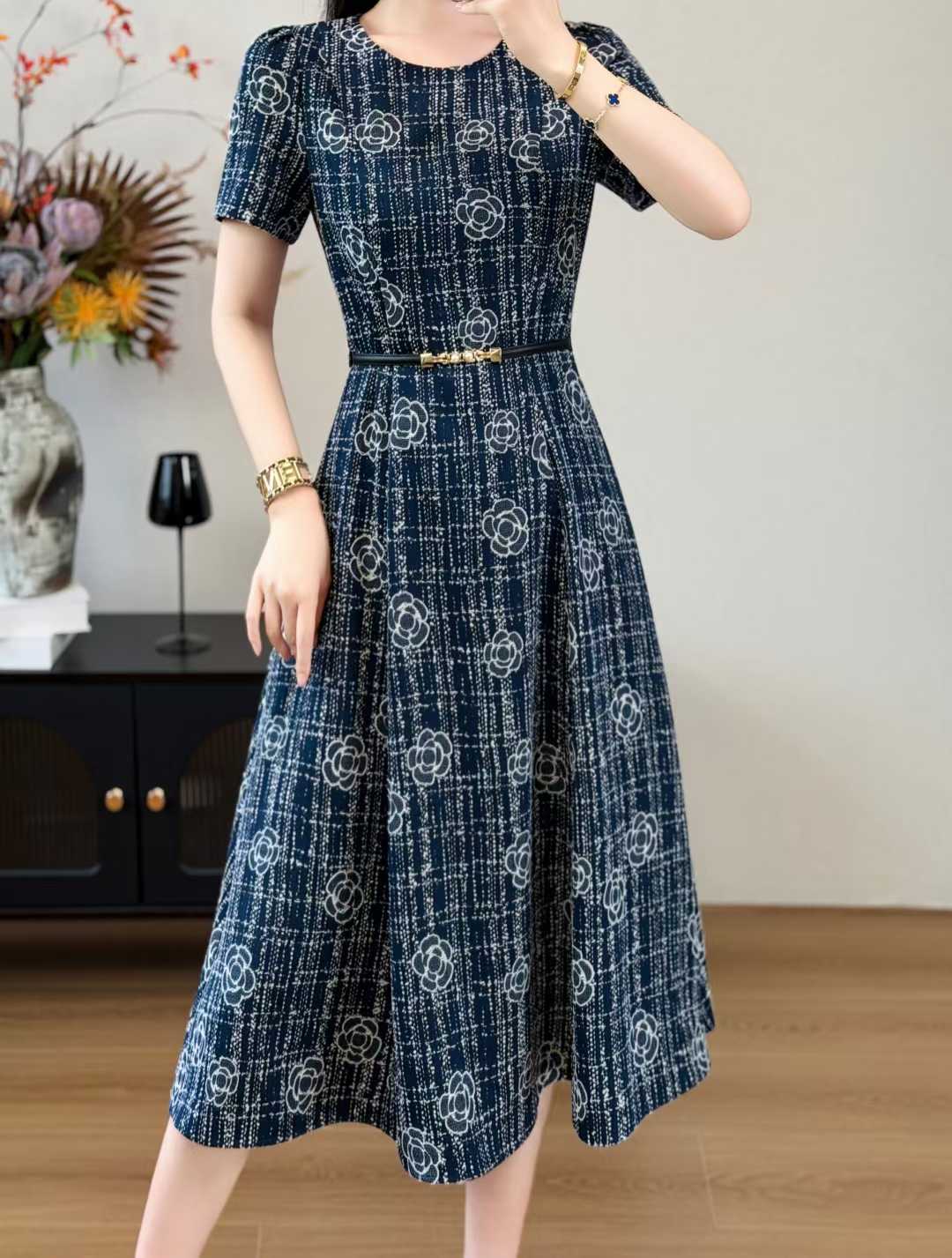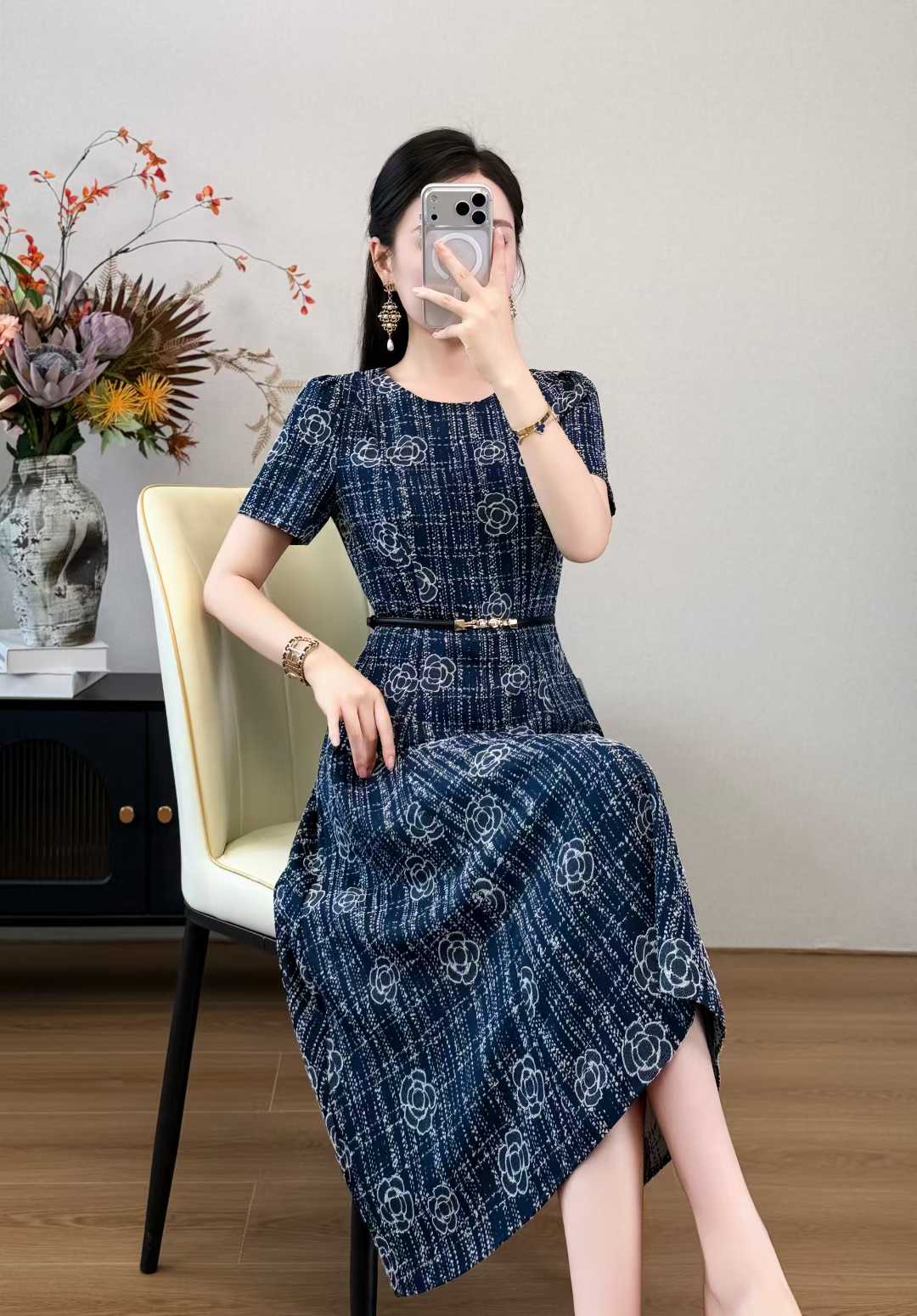 SC2S55_绀蝶色_连衣裙_夏季_圆领短袖金属腰带收腰 A 字中长款_高级女装_BERNIEELEN 伯妮斯茵