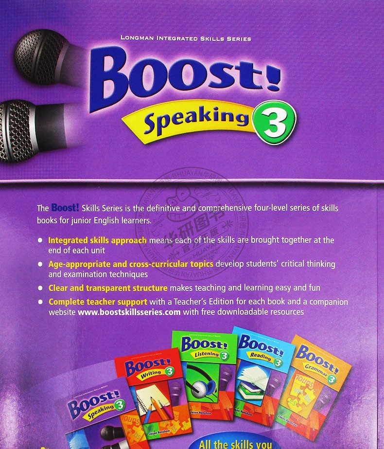 Boost!系列是培生集团朗文公司2007年出版,专门为非英语国家10-15岁青少年英语学习所编写的系列教材。教材提供听、说、读、写、语法综合全面的知识技能训练,致力于发展青少年听、说、读、写基本技能,有效提高应试能力,全面培养英语综合运用能力。在提升青少年语言智能,开发和培养学生潜能的同时,整体提高青少年人文素养。